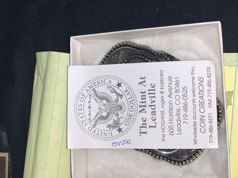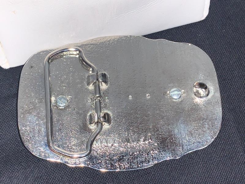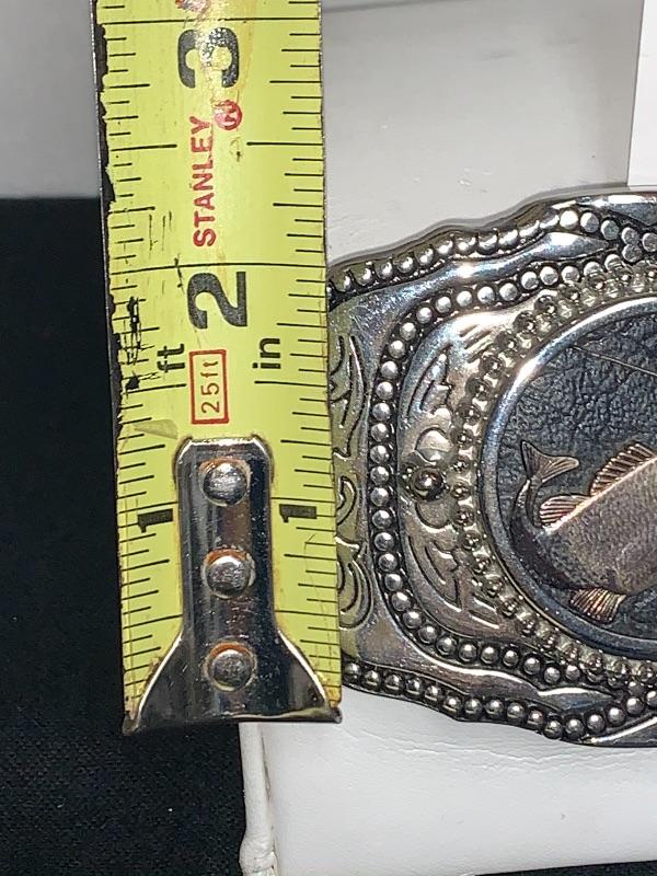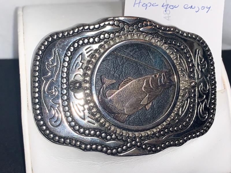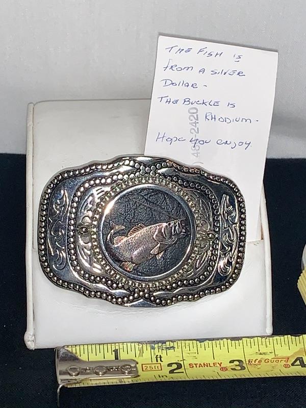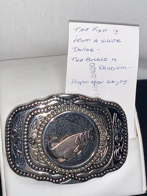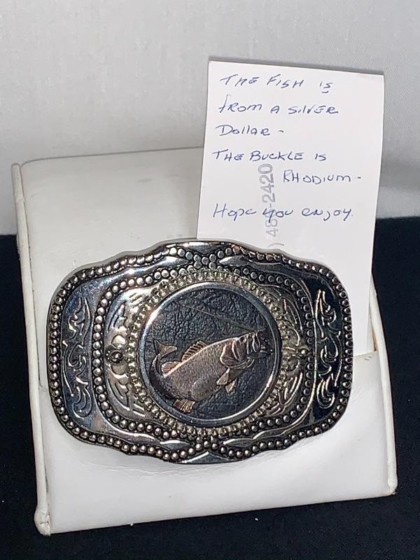 LOT # 56 FISH BELT BUCKLE FISH FROM A SILVER DOLLAR BY COIN CREATIONS OUT OF COLORADO BUCKLE IS RHODIUM
