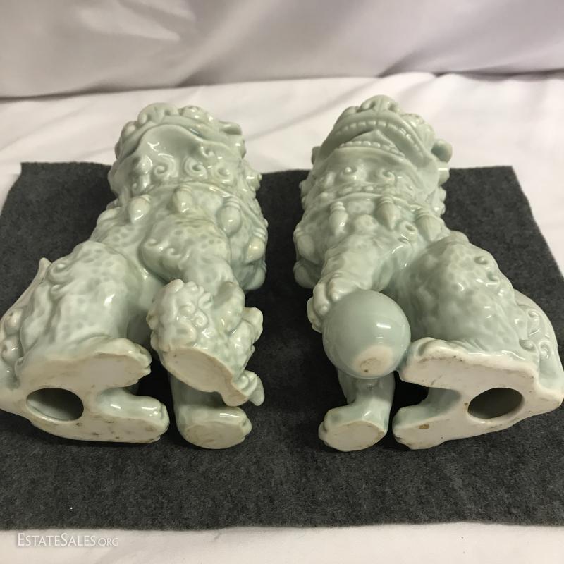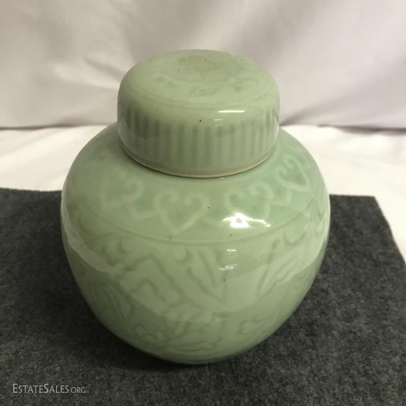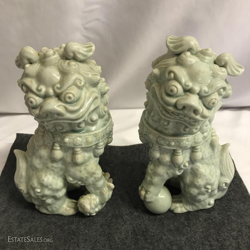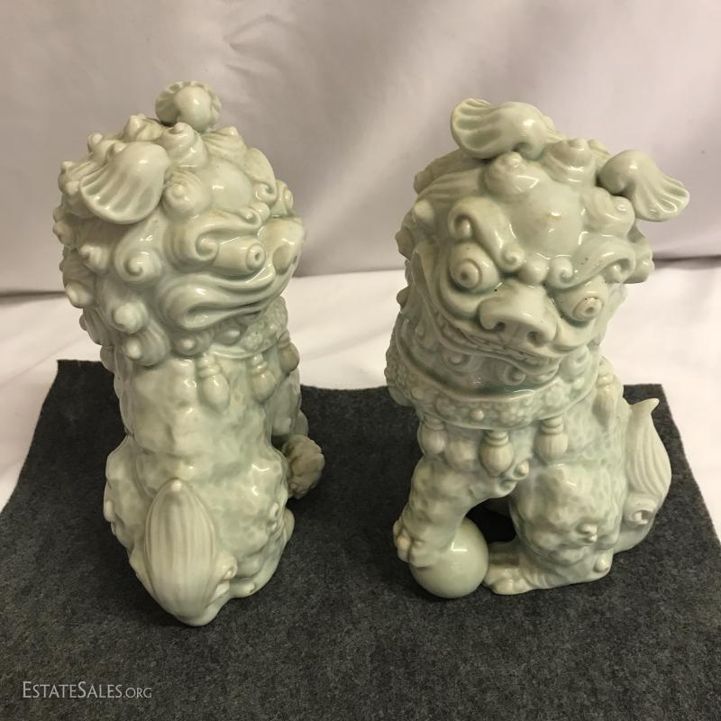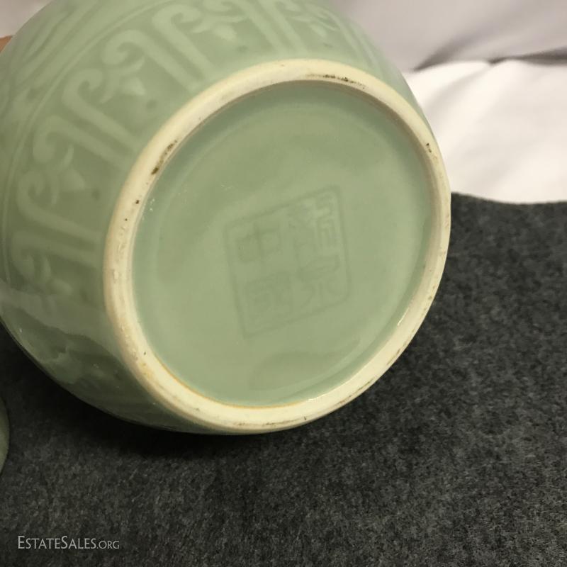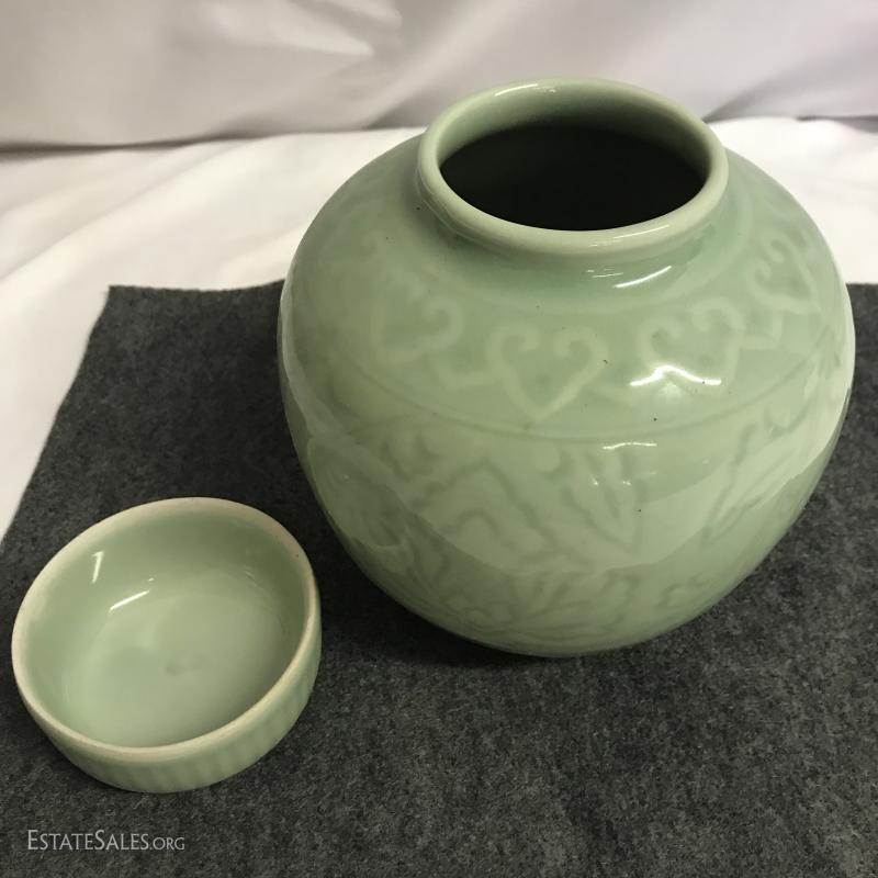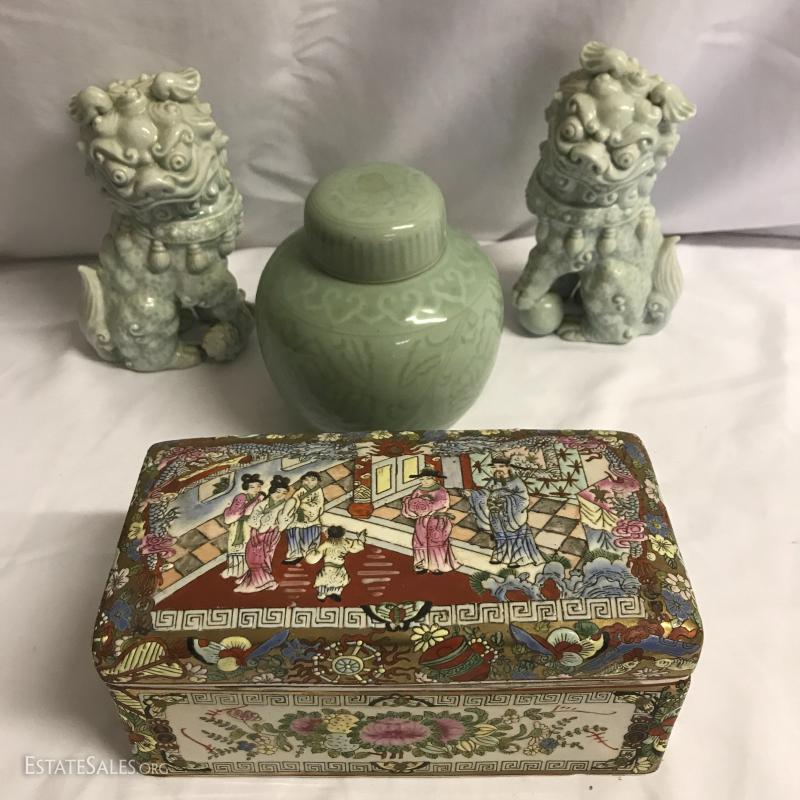Chinese jade colored vase with top (6"tall x 5.5"wide). Same green colored pair of Chinese ceramic foo dogs/ lions (7.5"tall x 4" wide). Ceramic rectangle box with lid (8.5"l x 4.5"w x 3.5"h).