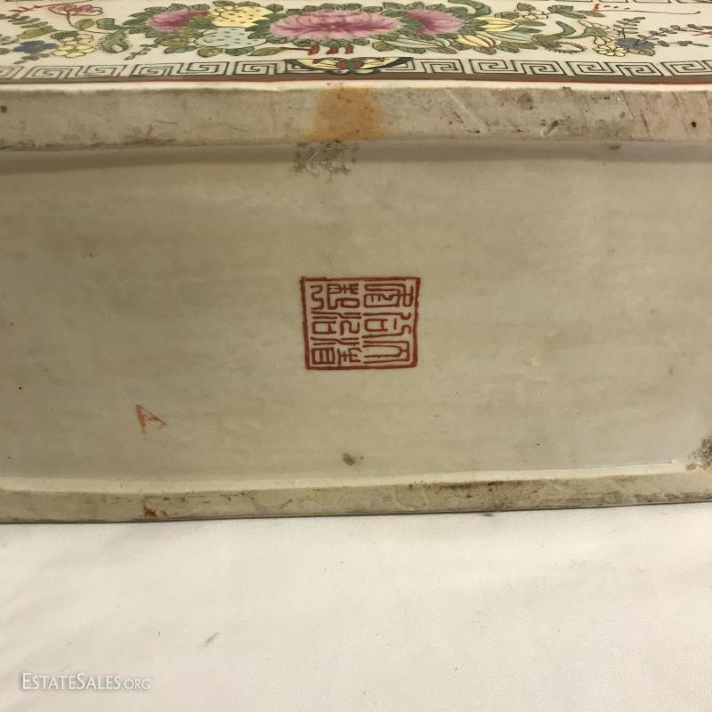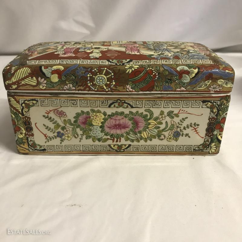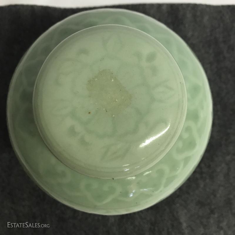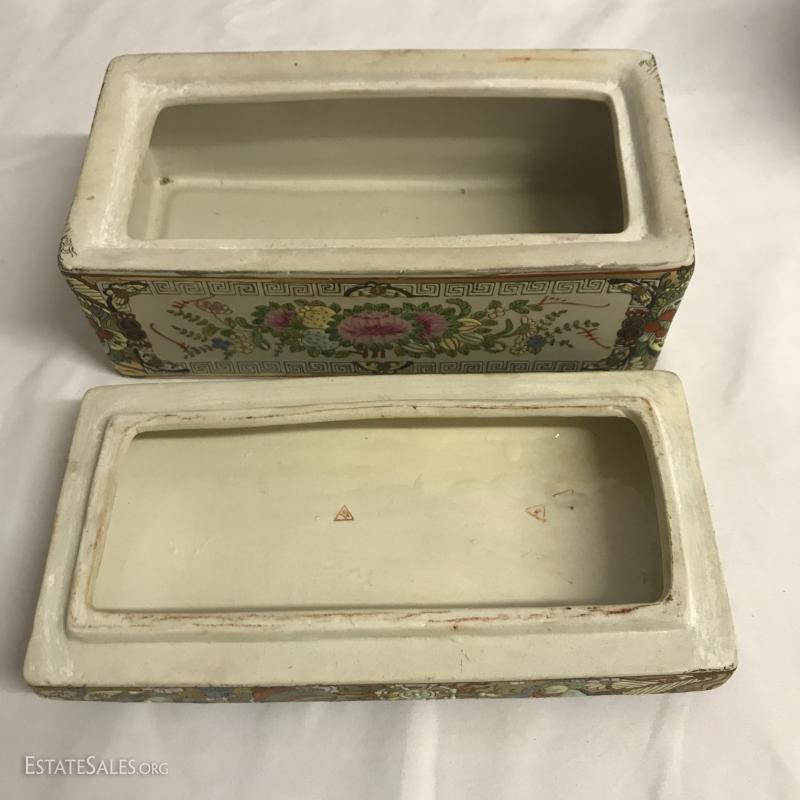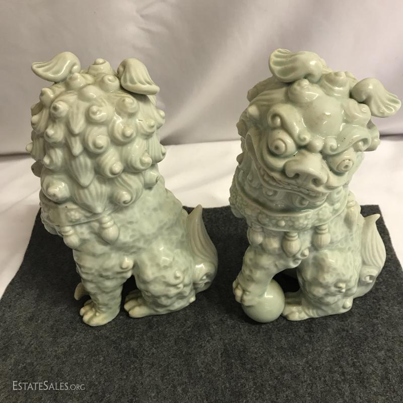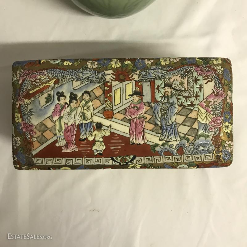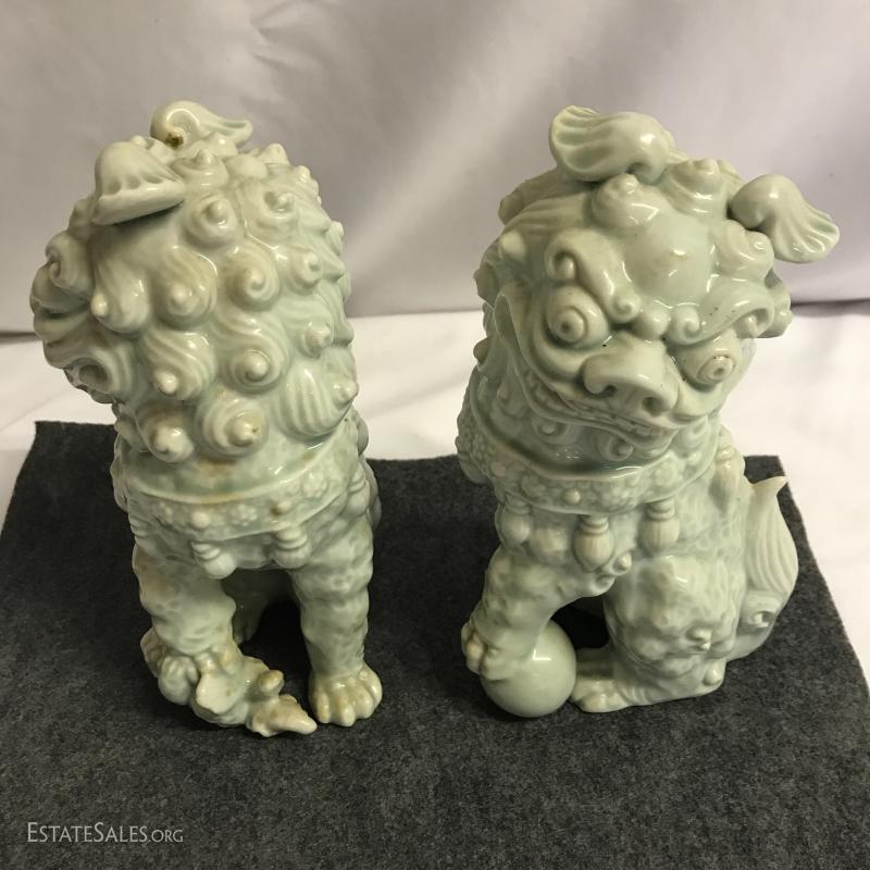 Chinese jade colored vase with top (6"tall x 5.5"wide). Same green colored pair of Chinese ceramic foo dogs/ lions (7.5"tall x 4" wide). Ceramic rectangle box with lid (8.5"l x 4.5"w x 3.5"h).