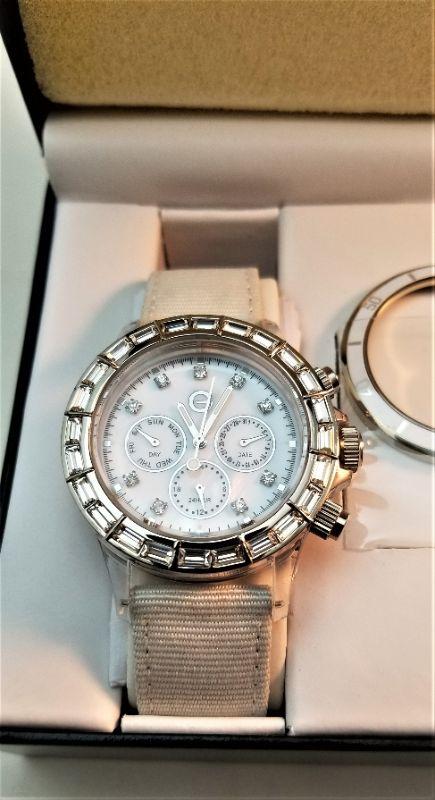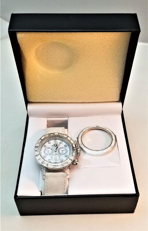 All paperwork, etc - does not appear to have ever been worn. May need a battery. GOSSIP brand ladies wrist watch with an additional bezel. Had day/date/seconds. Ivory colored grosgrain band.