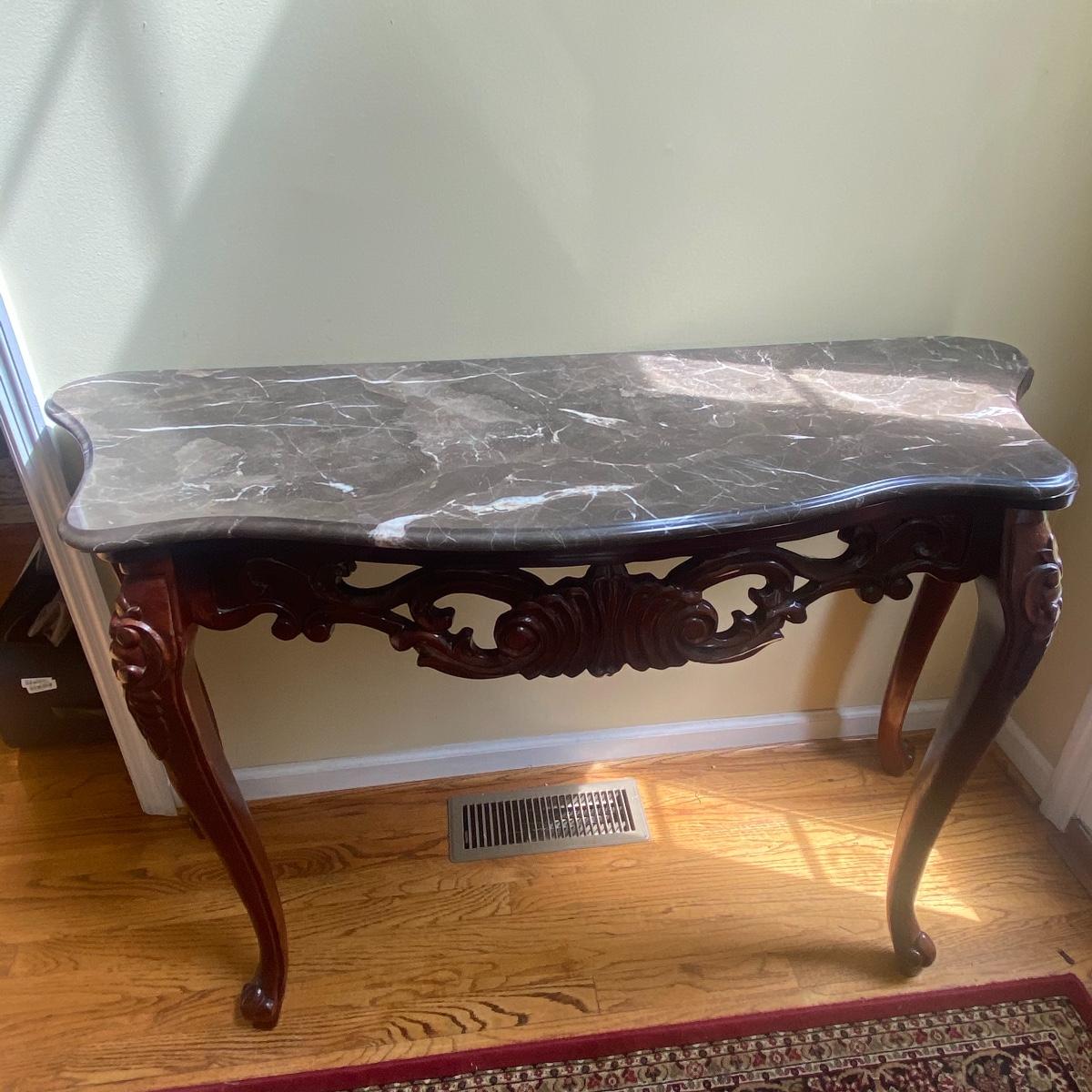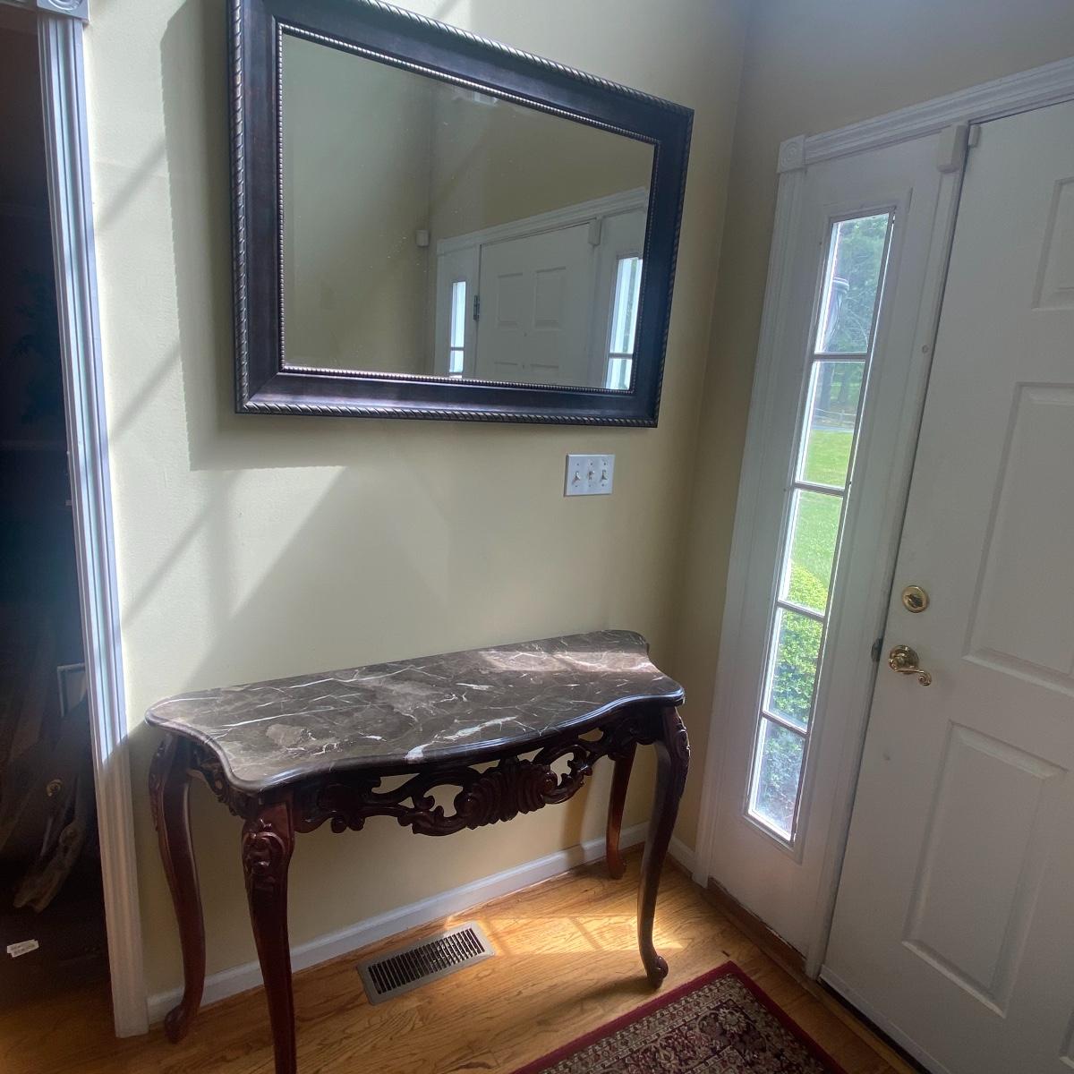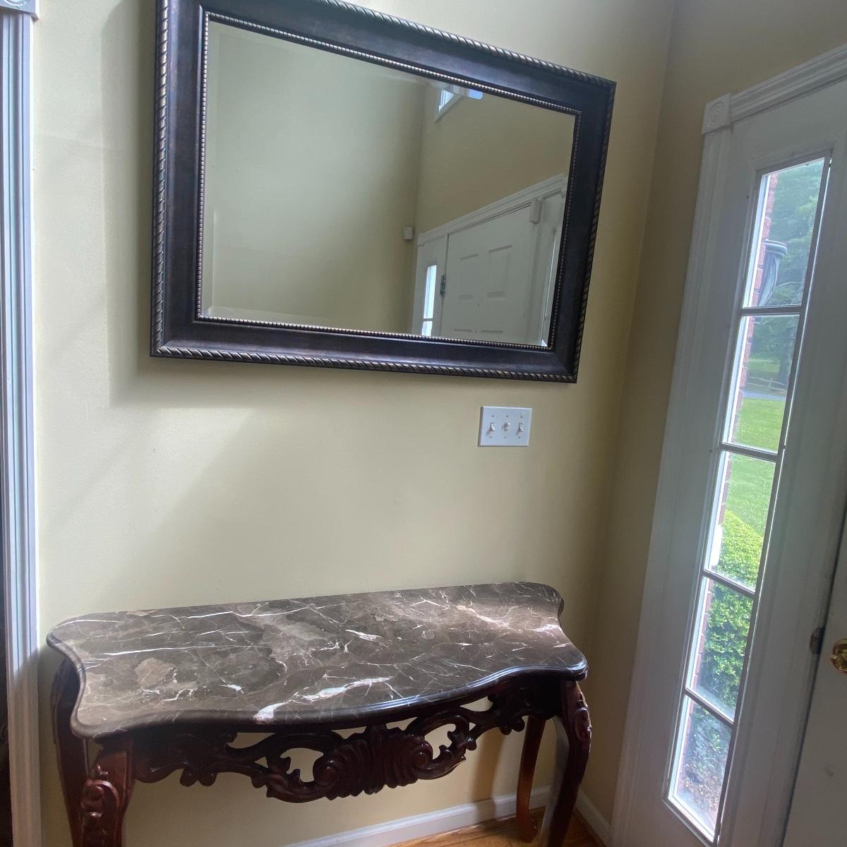 Lot includes a steady granite top, entryway table. Included in the lot is a large mirror. Creating a beautiful moment when you step in the door. Brown granite slab can be lifted from the table base, table measures 50" x 18" x 32". Mirror measurements are 43" x 31". See photos! Local pick up only!