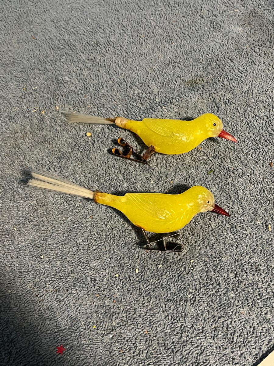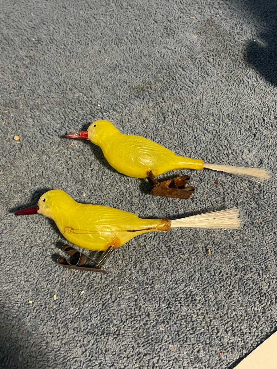 THESE ARE 2 GREAT VINTAGE CHRISTMAS BIRD CLIP ON ORNAMENTS! UNMARKED.. 5 3/8'' LONG... 1 BEAK HAS A HOLE, AND THERE IS SOME OLD BROWNISH GLUE..