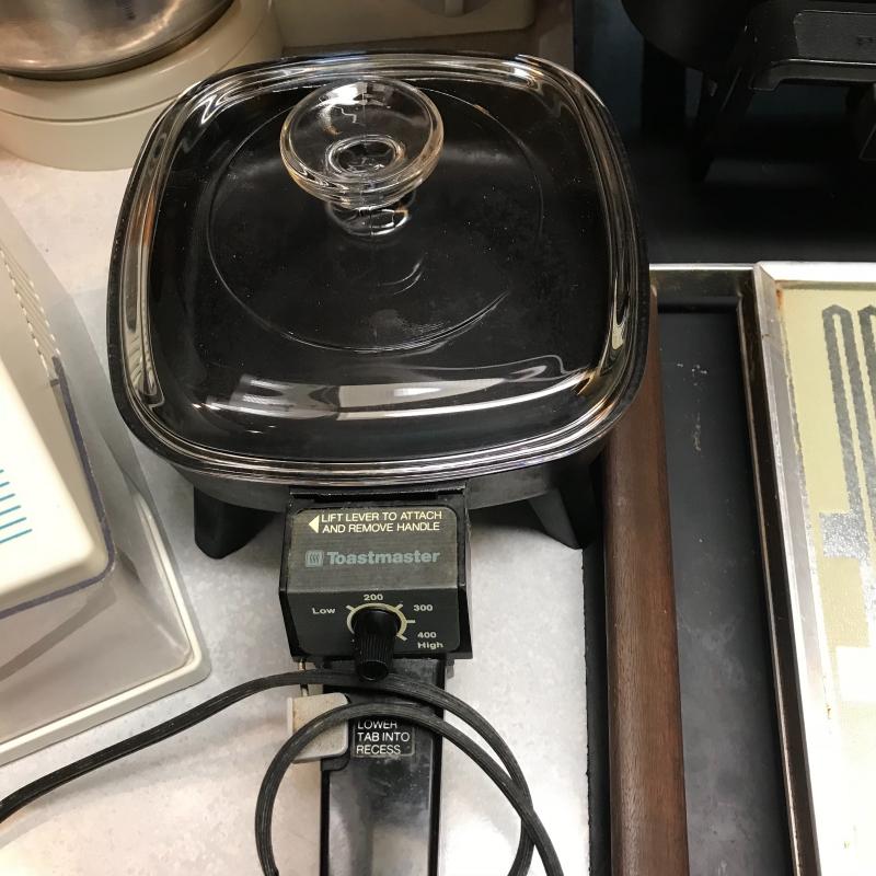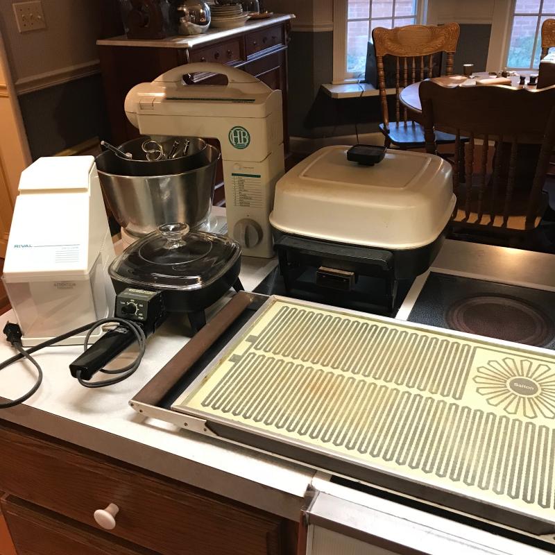 Ice crusher by Rival, Hamilton beach mixer, Stanton hot plate, Presto and Toastmaster cookers. This lot is available for local pick up in Flat Rock, NC only.