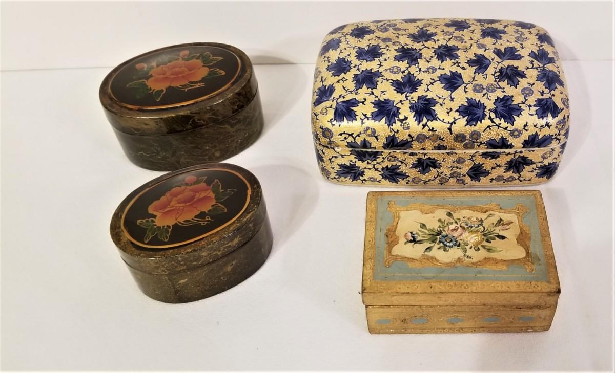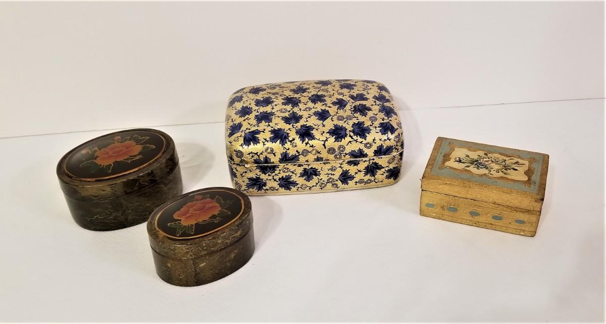 You get all you see here - one sweet Florentine box, one papier mache, and two lacquer. The papier mache box is 6" x 4", the Florentine is 3.5" x 3.5" and the largest of the lacquer is 3.5" x 2.75". All in good condition.