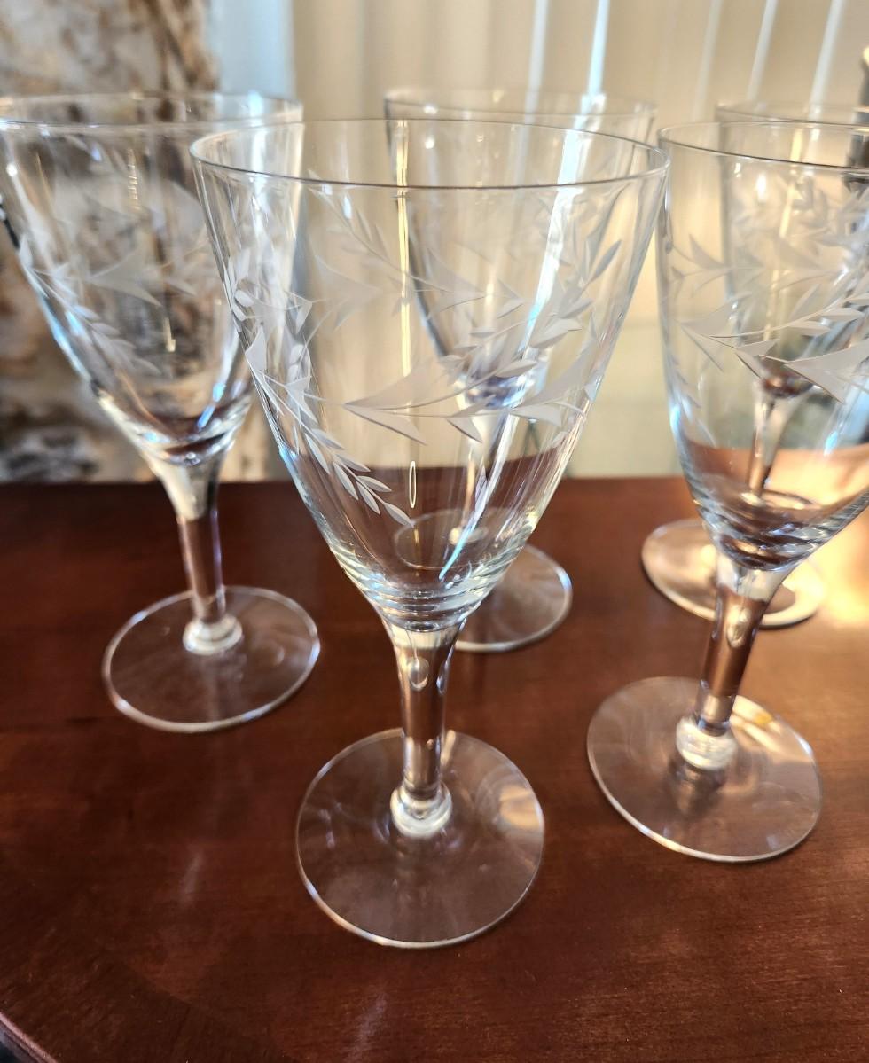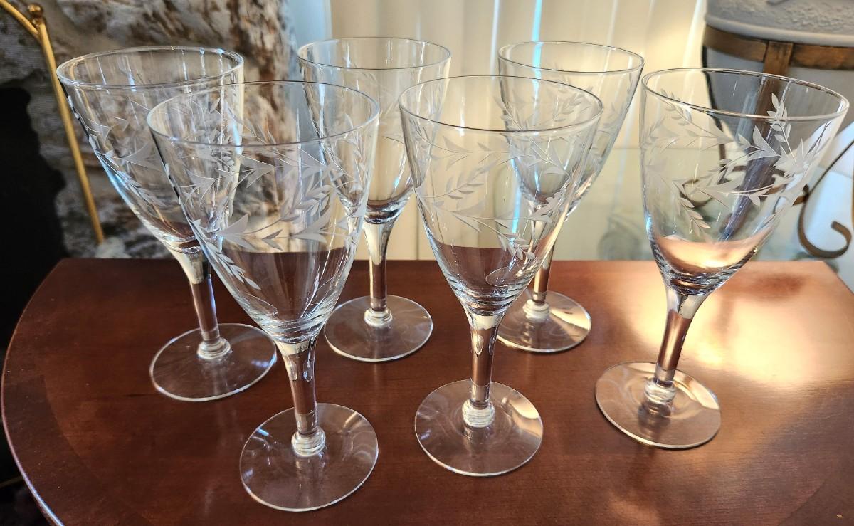Lot of 6 very pretty vintage crystal goblets - dainty foliate design - each stands 7" tall - good condition.