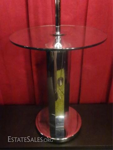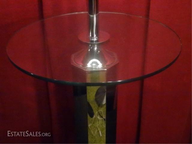 LOT 56: MODERN CHROME FLOOR LAMP WITH TABLE, BLACK DRUM SHADE, ROUND GLASS TABLE TOP, EXCELLENT GENTLY USED CONDITION, SKU919.02
