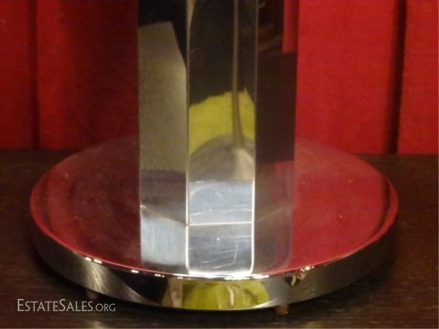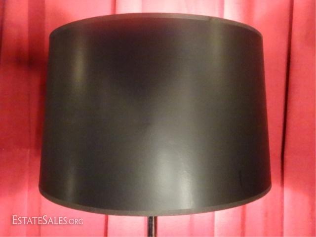 LOT 56: MODERN CHROME FLOOR LAMP WITH TABLE, BLACK DRUM SHADE