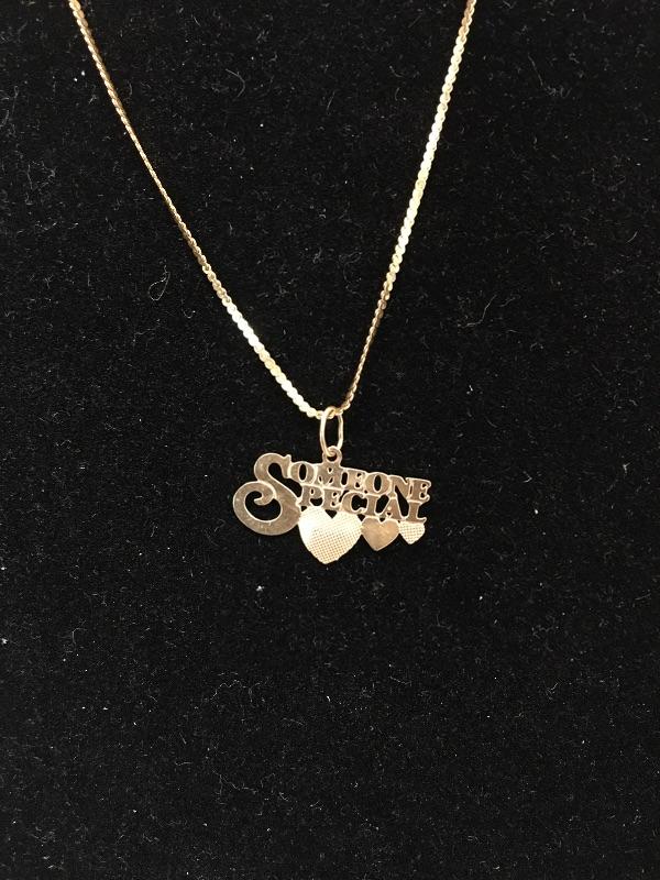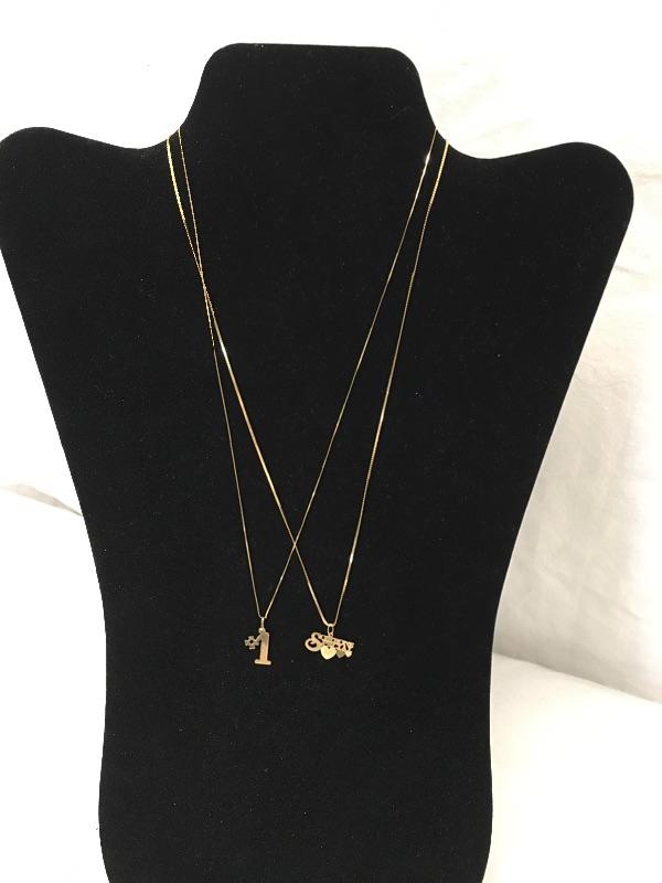 Pair of 14K chains and pendants. Lot includes gold chain with Someone Special pendant, both marked 14K. Also includes gold chain with #1 pendant, both marked 14K. A great gift for that someone special in your life.