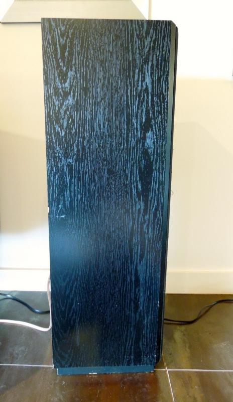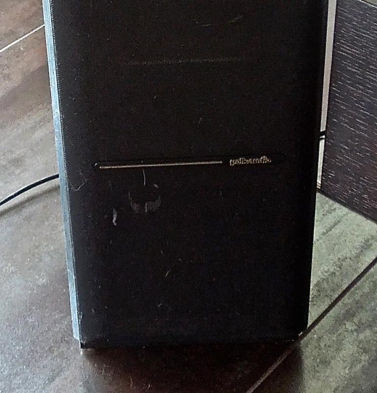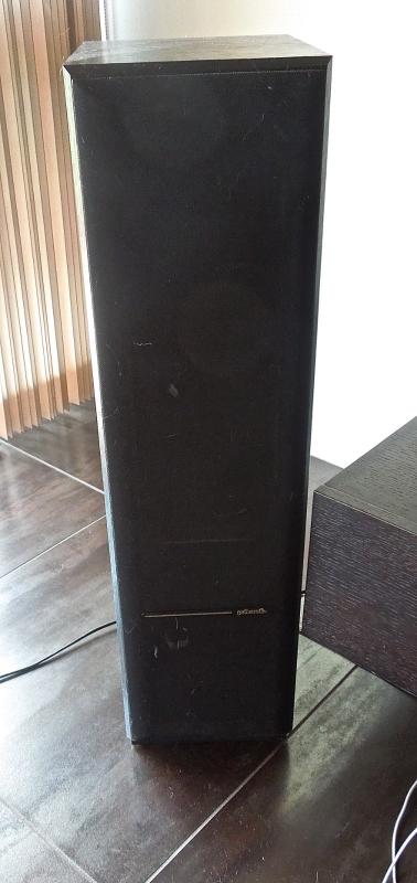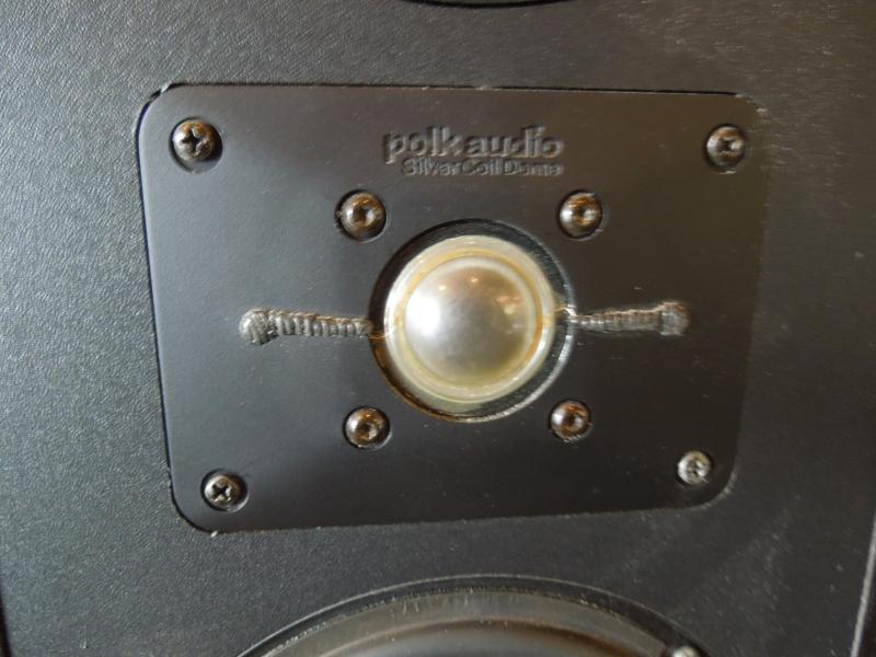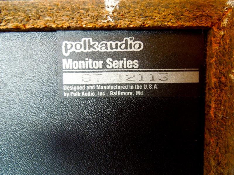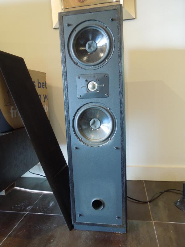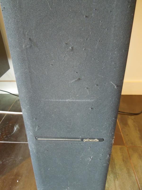 Nice pair of Polk Audio 33" x 11" x 9" cabinet speakers. Black gloss finish. Screen covers are damaged, Monitor series 8T 12113. Heavy wood cabinetry. In working condition.