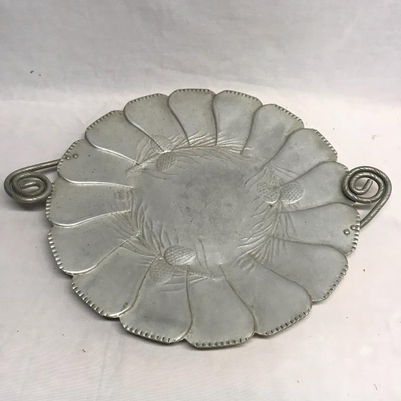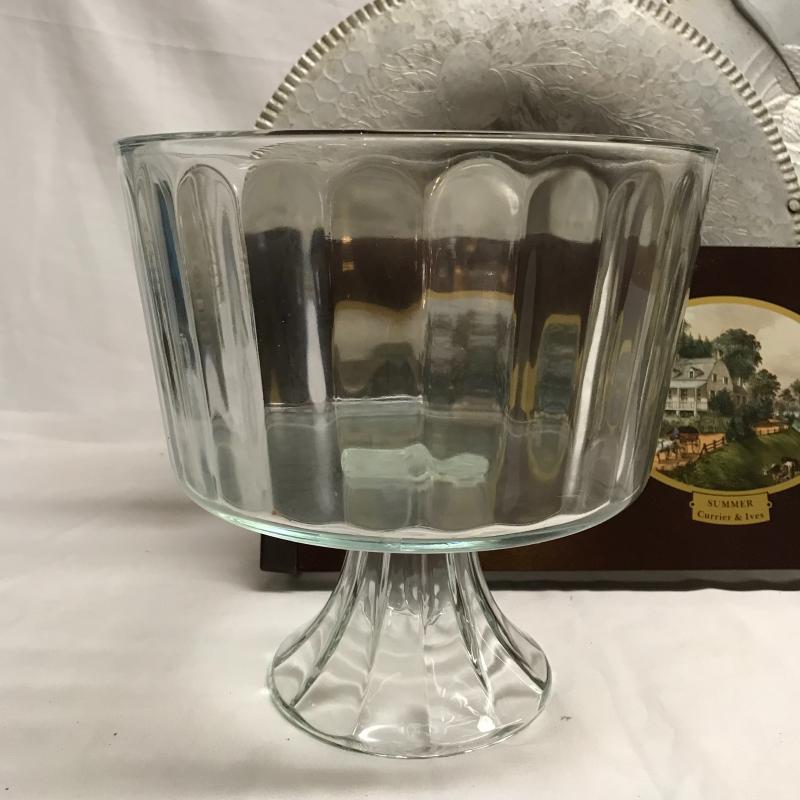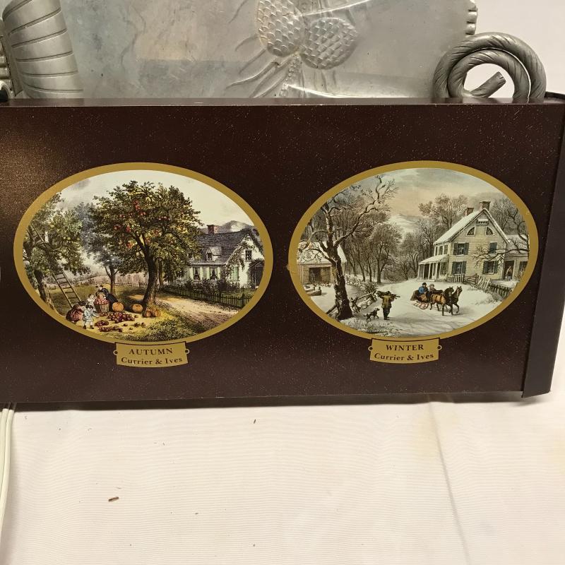 Use this collection to complete your holiday party! Eight inch trifle bowl with original box for storage, two metal trays, the larger tray with pine decor is 19” wide with handles. Lastly, a Currier and Ives seasons warming tray that turns on when plugged in. No shipping.