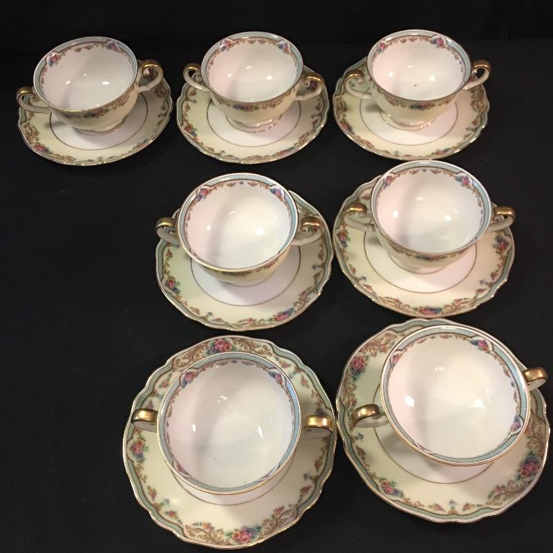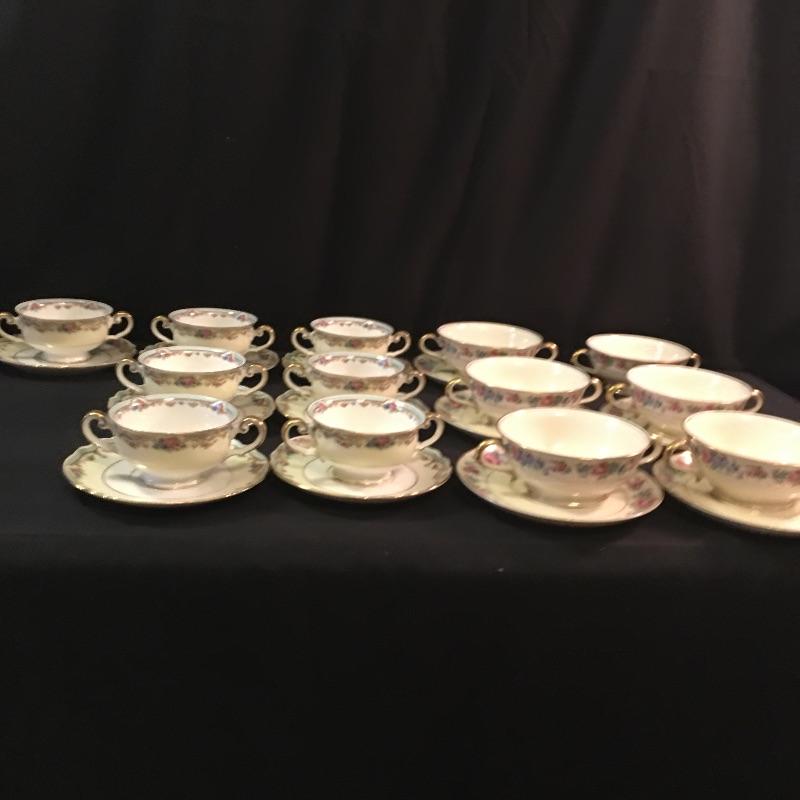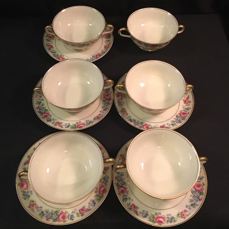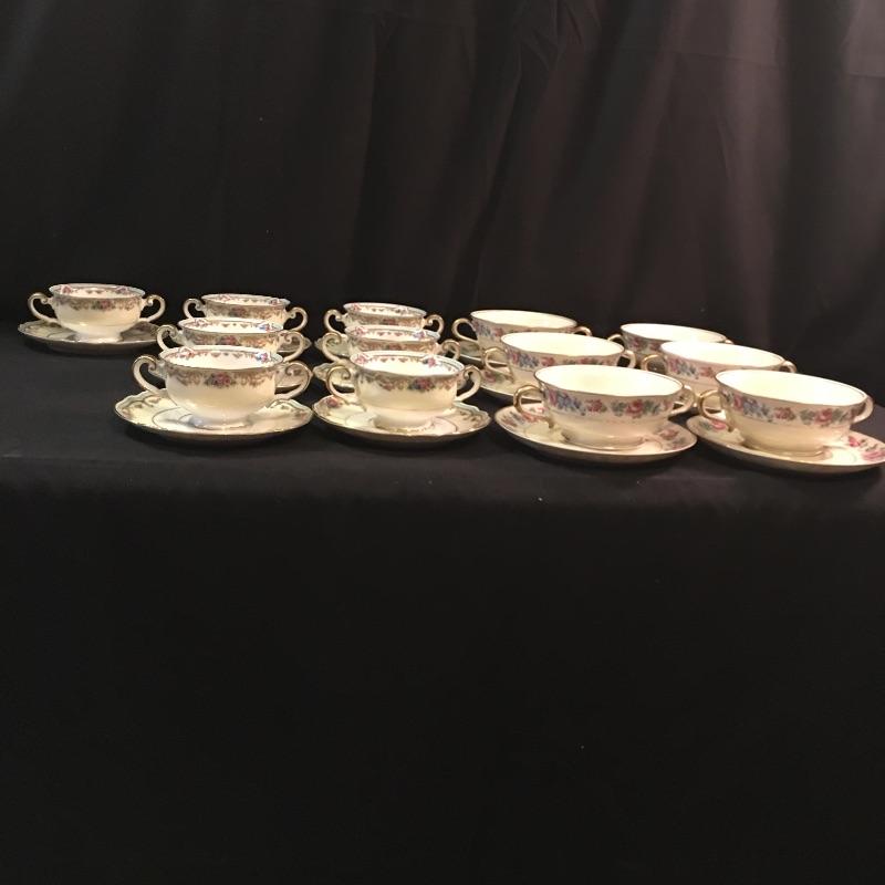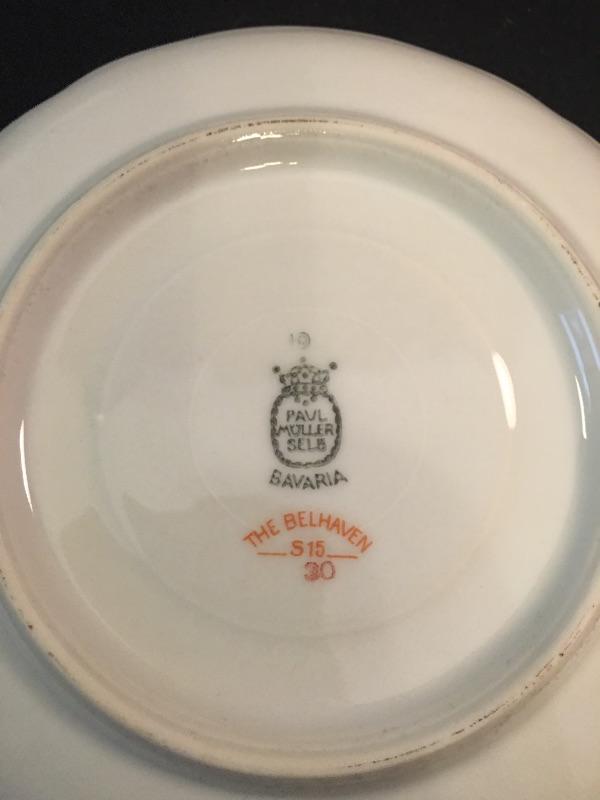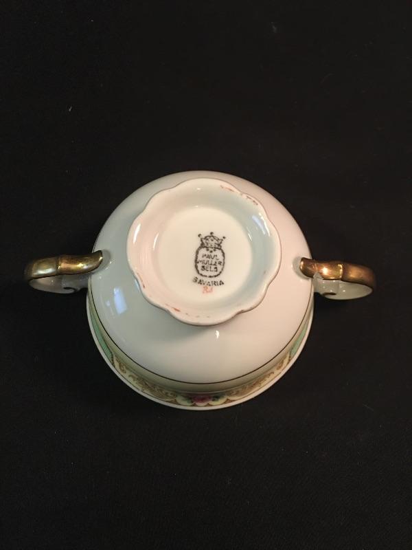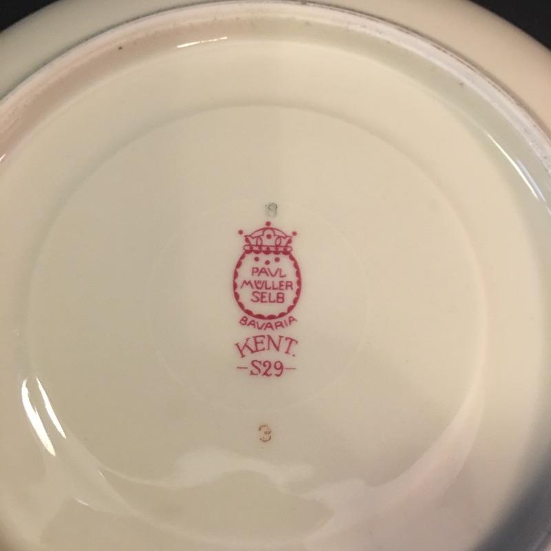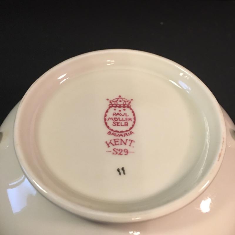 Start your next dinner party with a classic touch. This pair of Paul Mueller Selb tea sets includes seven bowls and saucers in the Bellhaven pattern and six bowls and five saucers in the Kent pattern. All pieces are marked Paul Mueller Selb Bavaria and have gold edging and accents. Enjoy a nice bowl of soup in these elegant sets. Largest saucer measures 6.75”D.