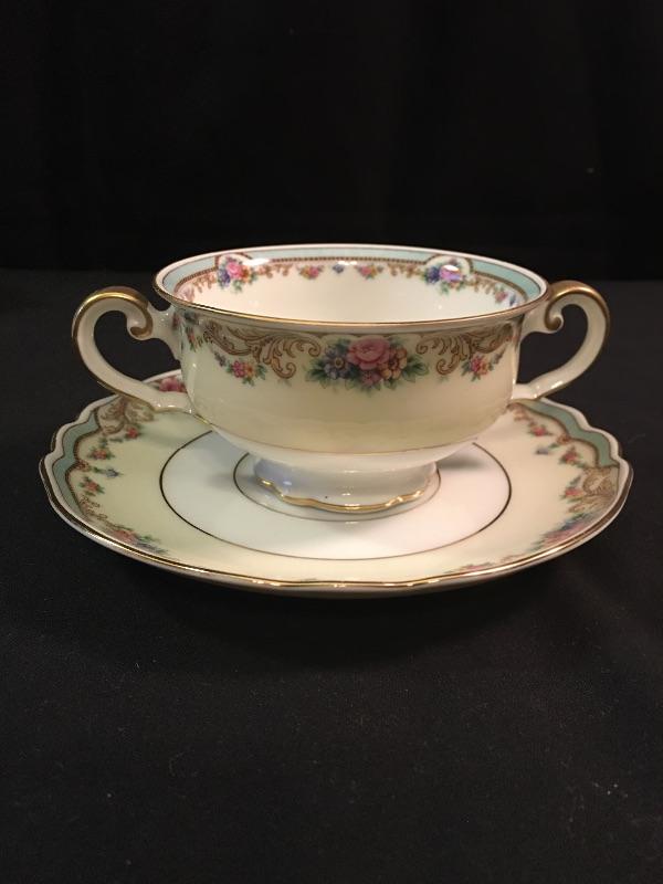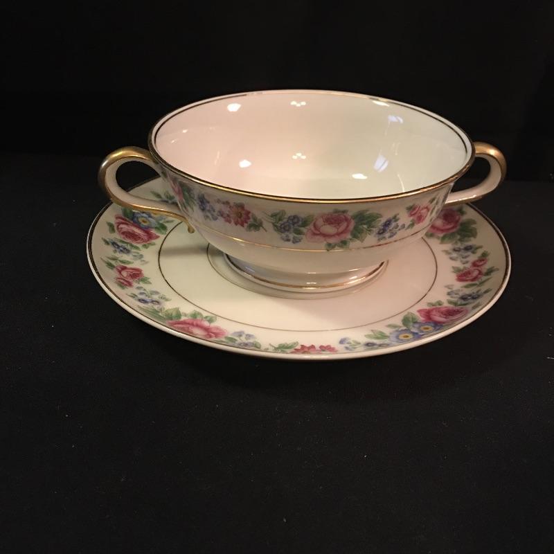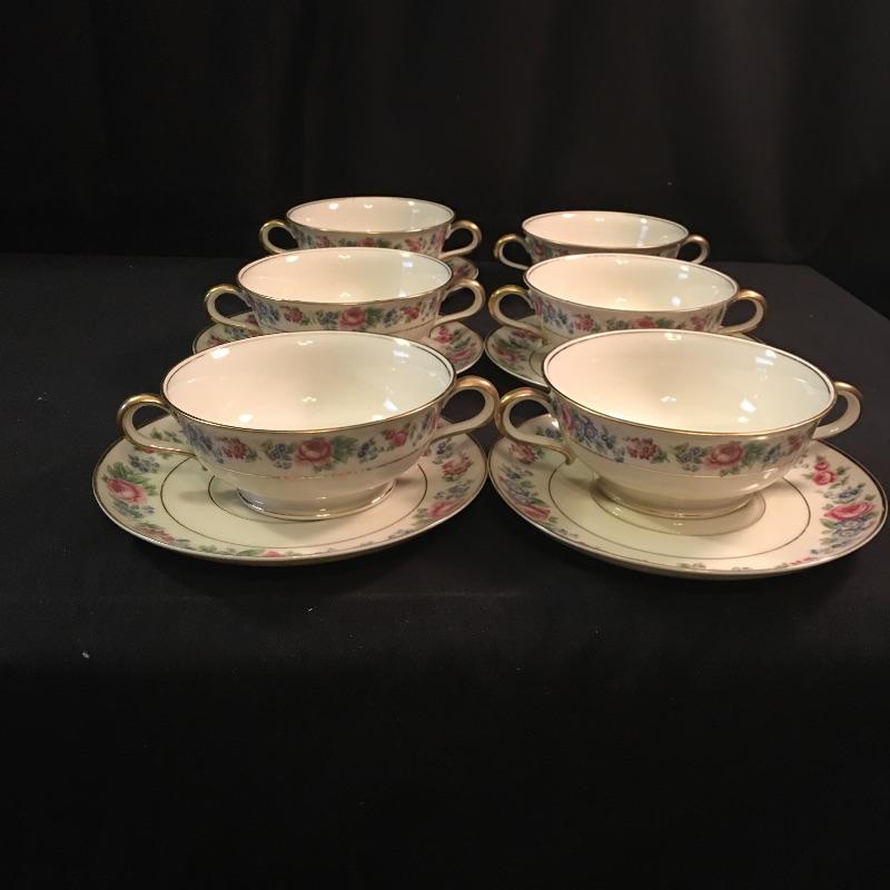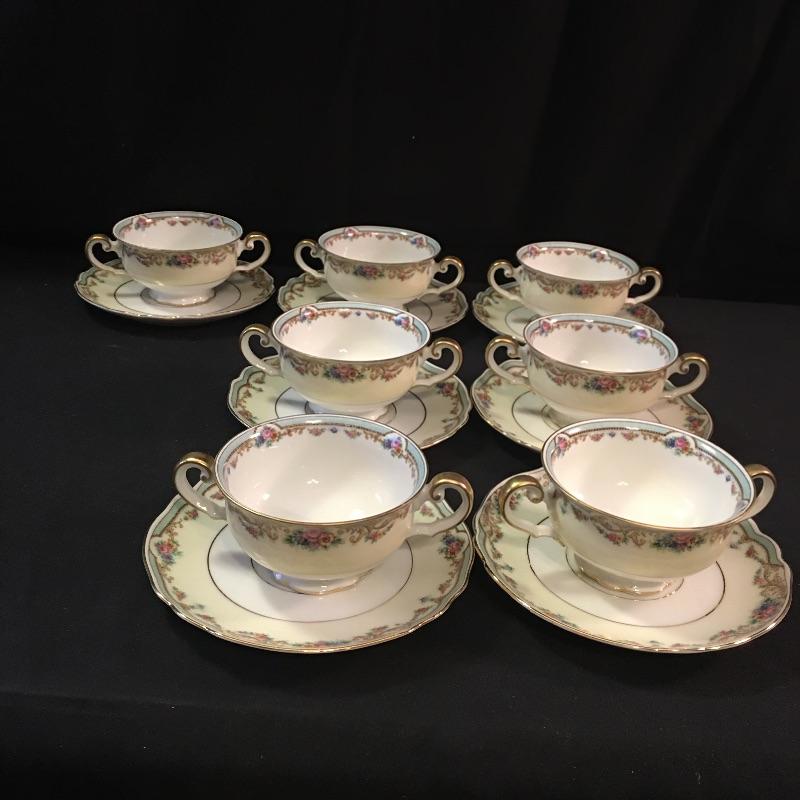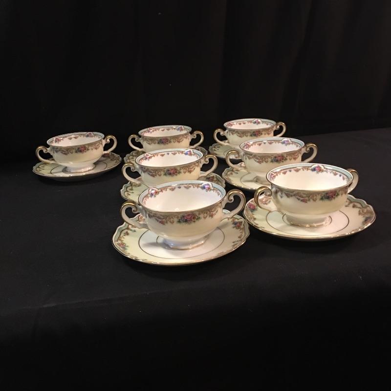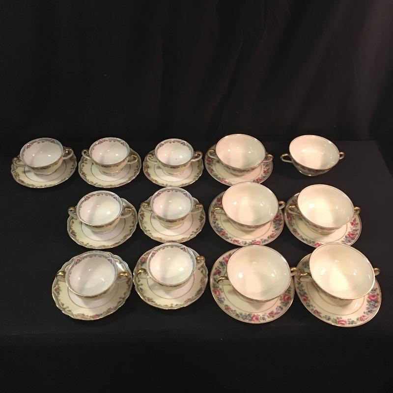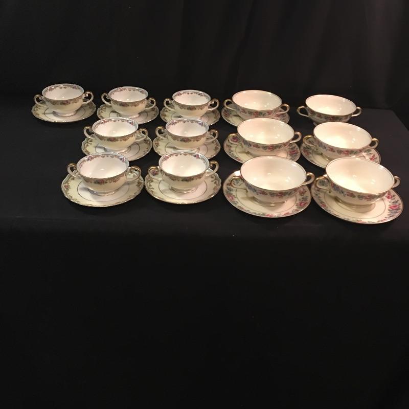 Start your next dinner party with a classic touch. This pair of Paul Mueller Selb tea sets includes seven bowls and saucers in the Bellhaven pattern and six bowls and five saucers in the Kent pattern. All pieces are marked Paul Mueller Selb Bavaria and have gold edging and accents. Enjoy a nice bowl of soup in these elegant sets. Largest saucer measures 6.75”D.