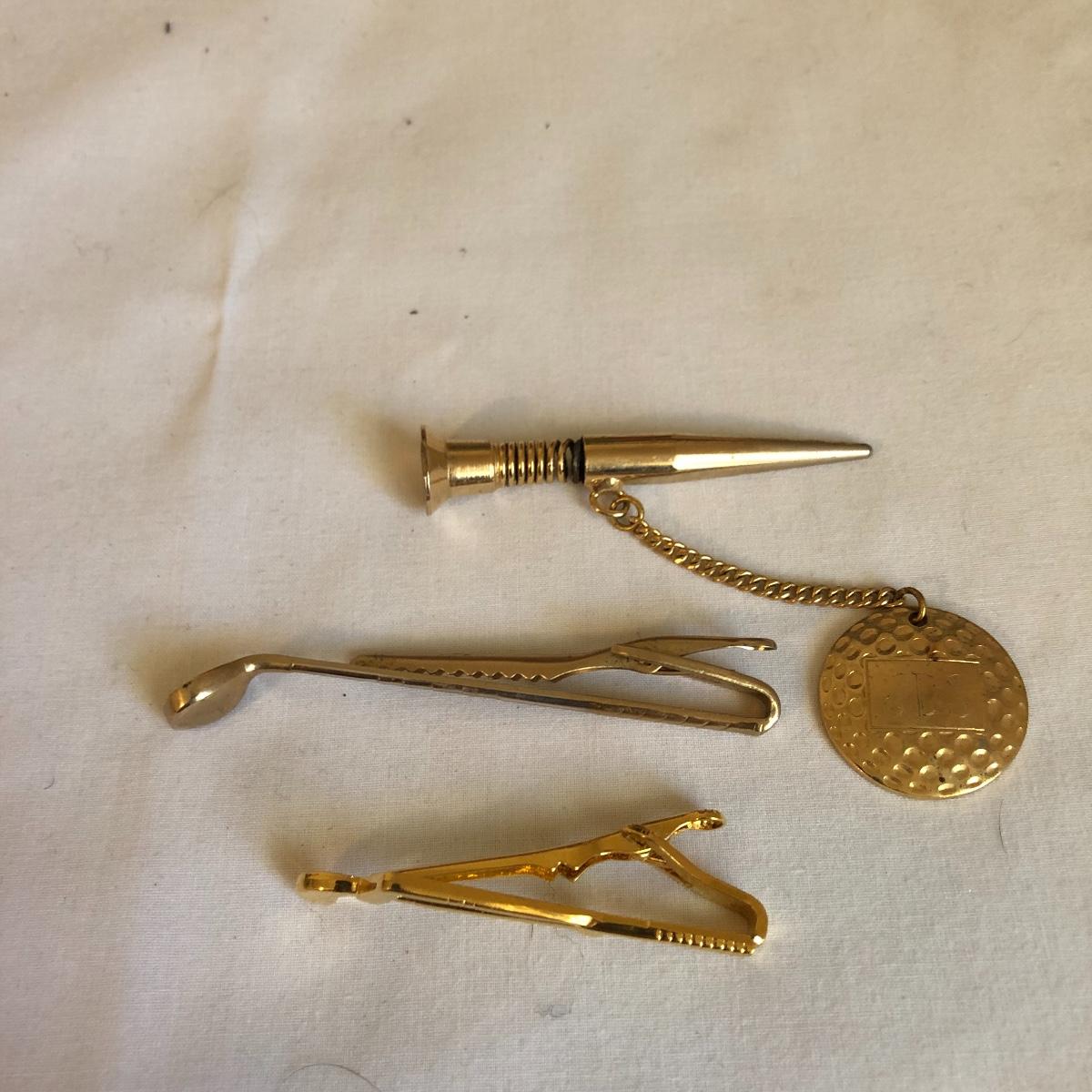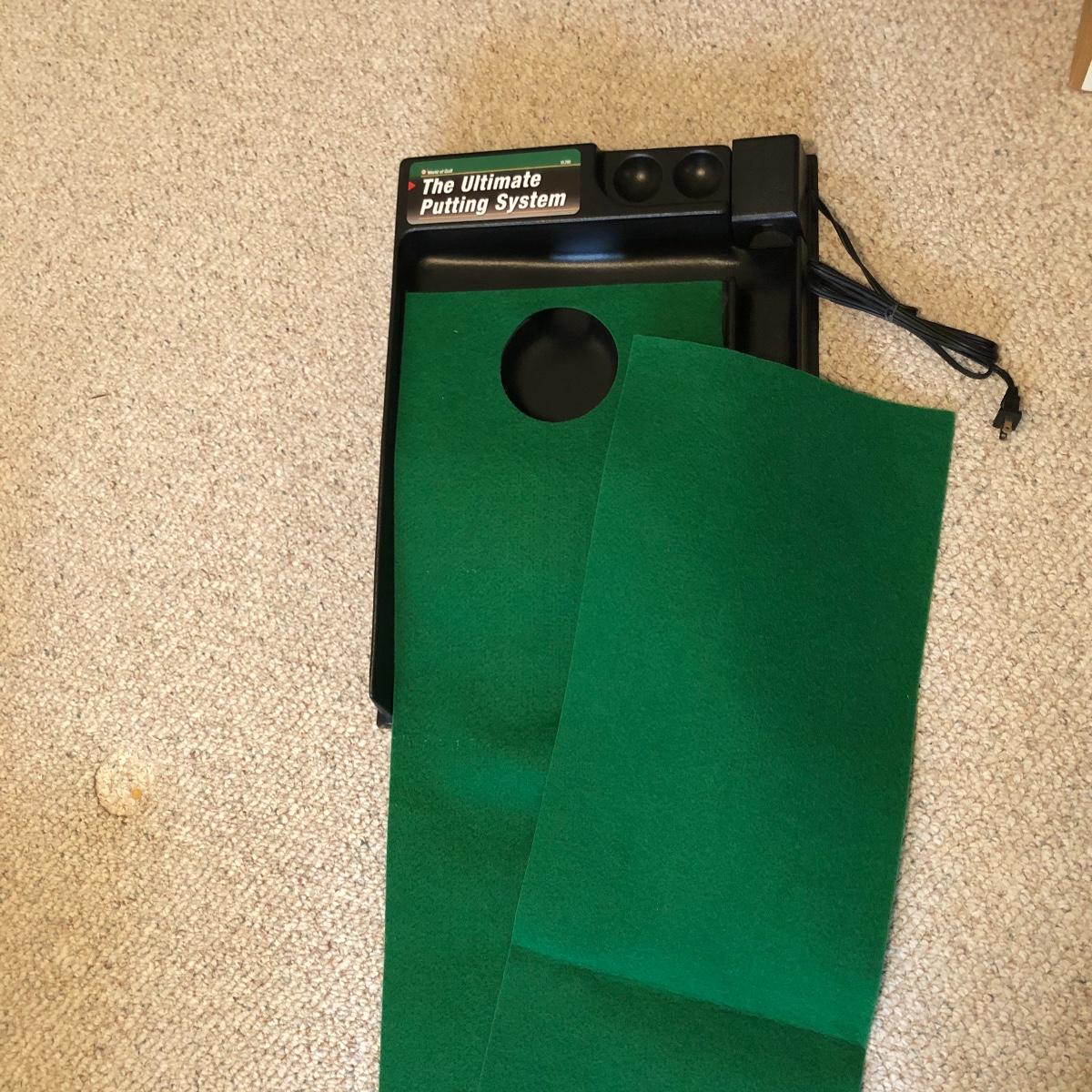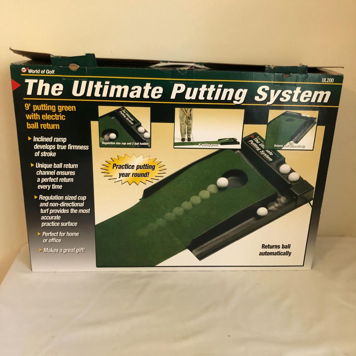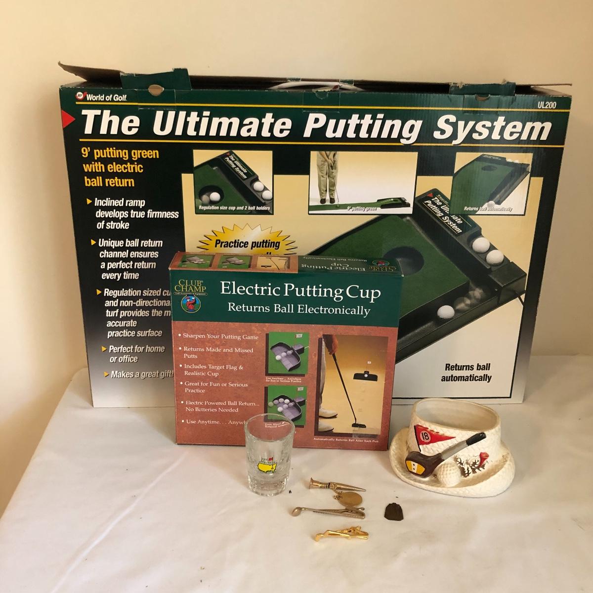 A great find for the golf fan in your life. Lot includes two putting systems that both worked when tested, Masters shot glass, golf tie clips, a golf inspired vase by Rubens if Japan, and a small medal.