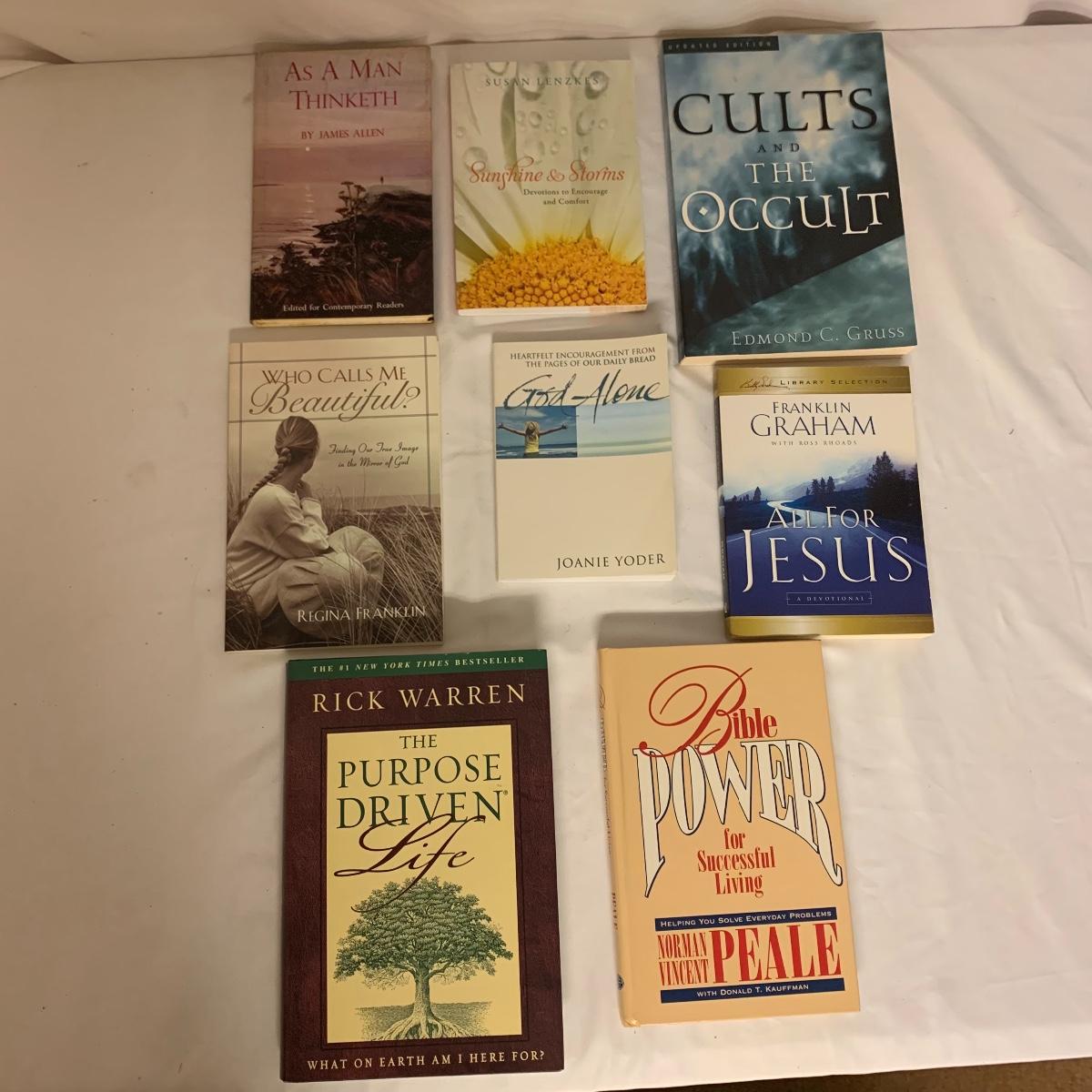 Lot 56 offers plenty or reading material for any religious minded individual. Included are titles such as “The New English Bible”, Billy Graham In Quotes”, and “Cults And The Occult”. See pics for titles. Books appear to be in fine shape. Local pickup only.