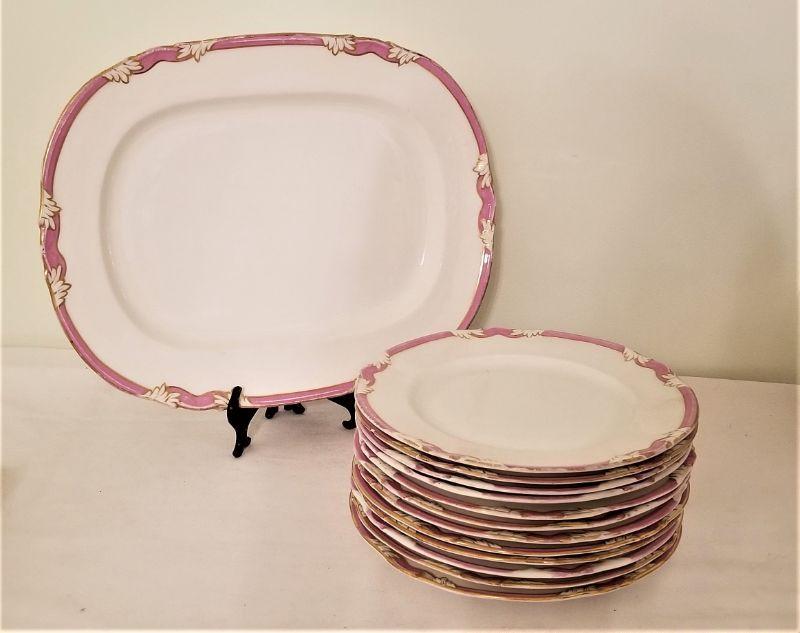 Very pretty antique set of 12 dinner plates with matching platter - dusty rose/gilded border. Good antique condition with normal age related wear. Platter is 16" x 13". Plates measure 10" across.