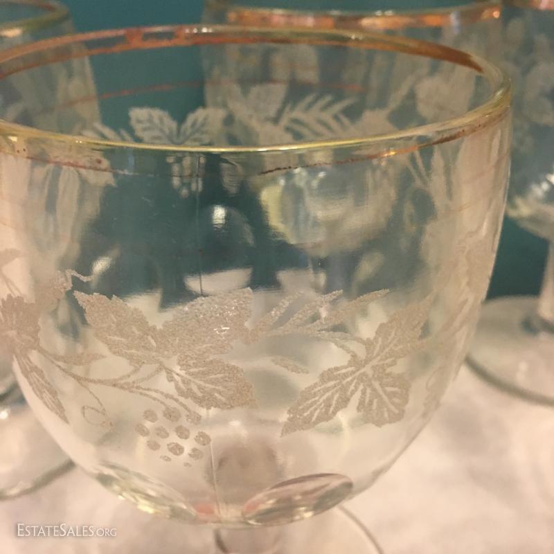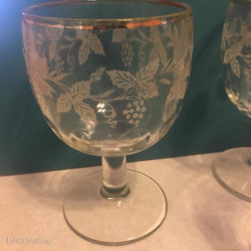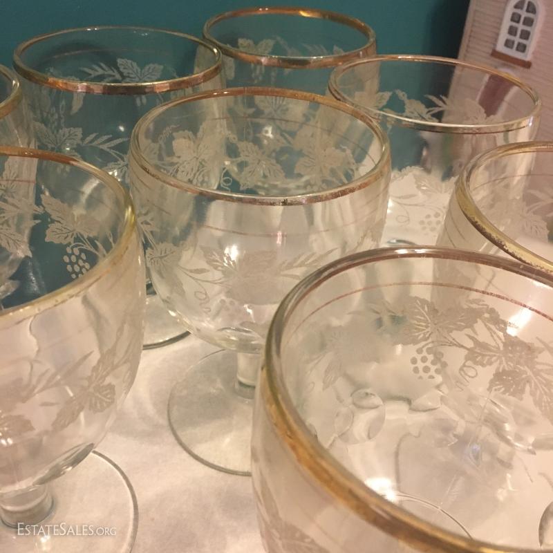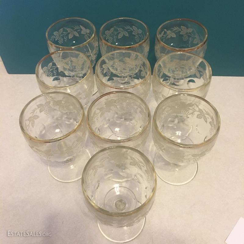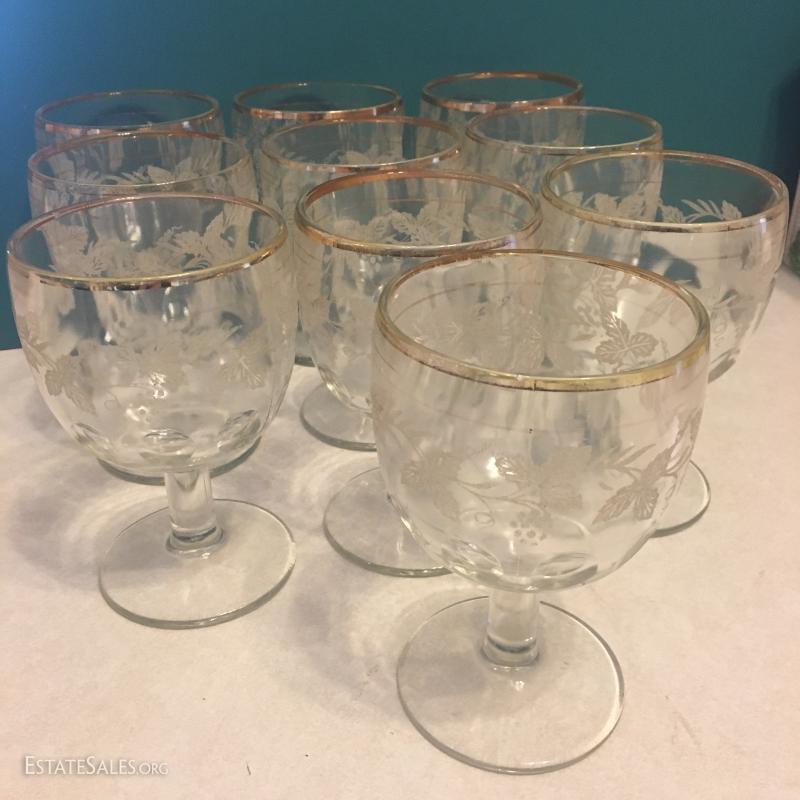 Ten Glass Goblets with Grape Leaf Design and Gold Like trim around the top of each. Some of the gold rims have rubbed off a bit. Please see pictures.