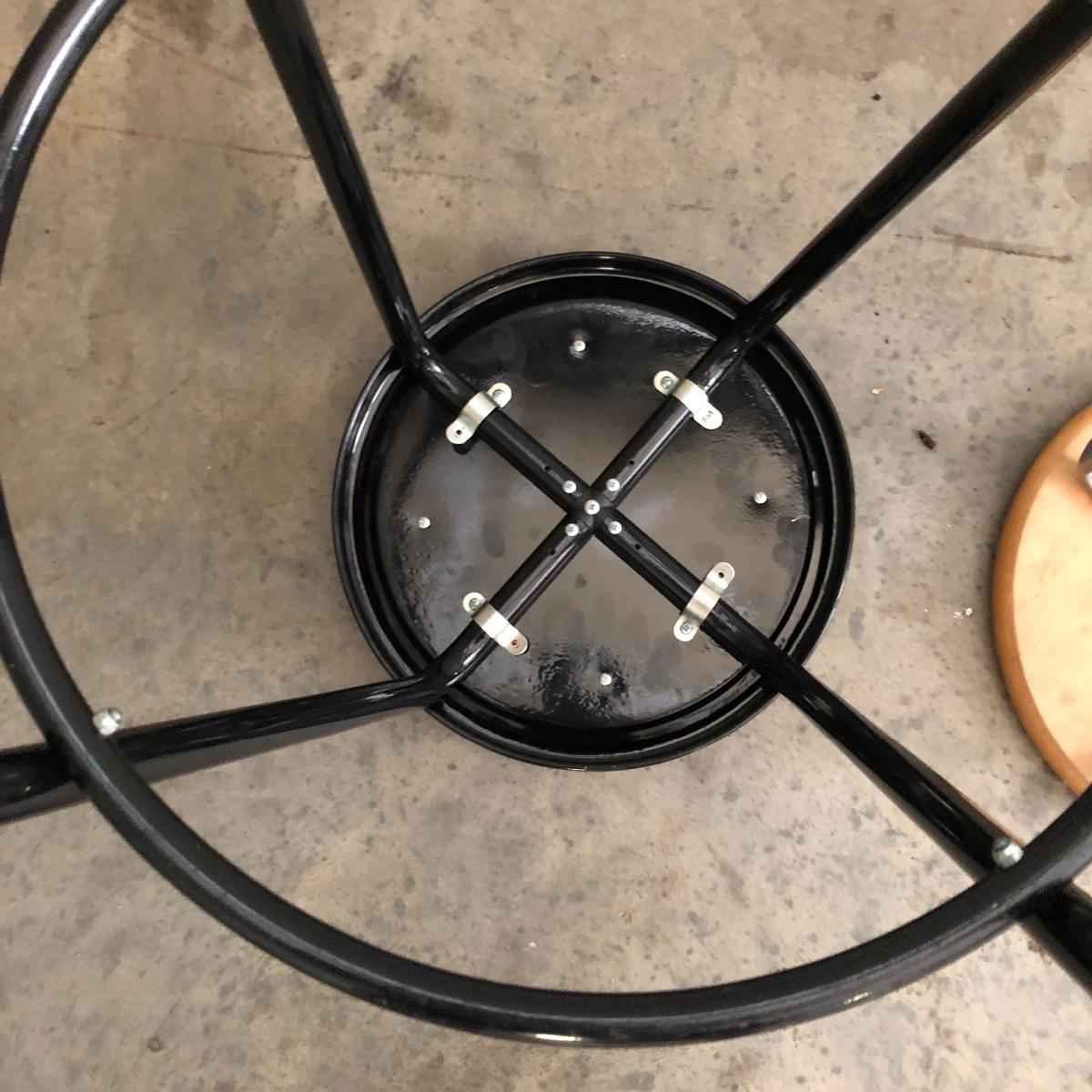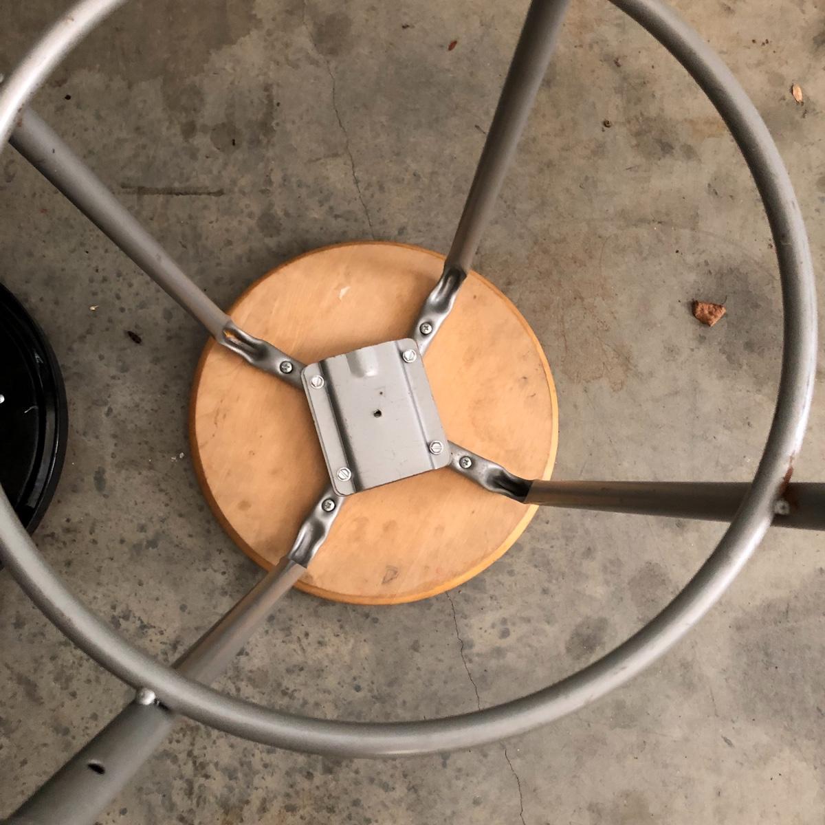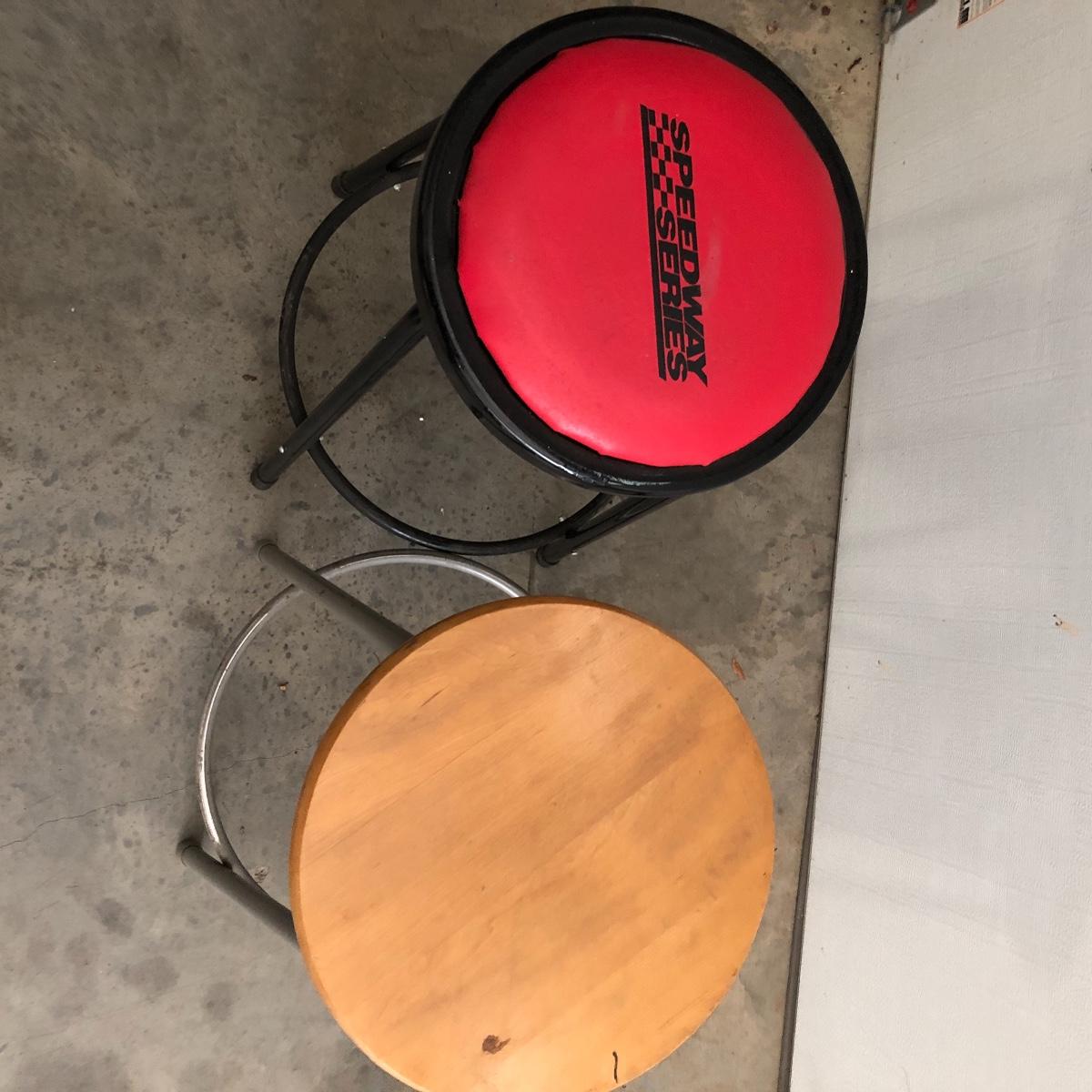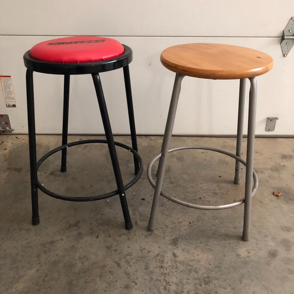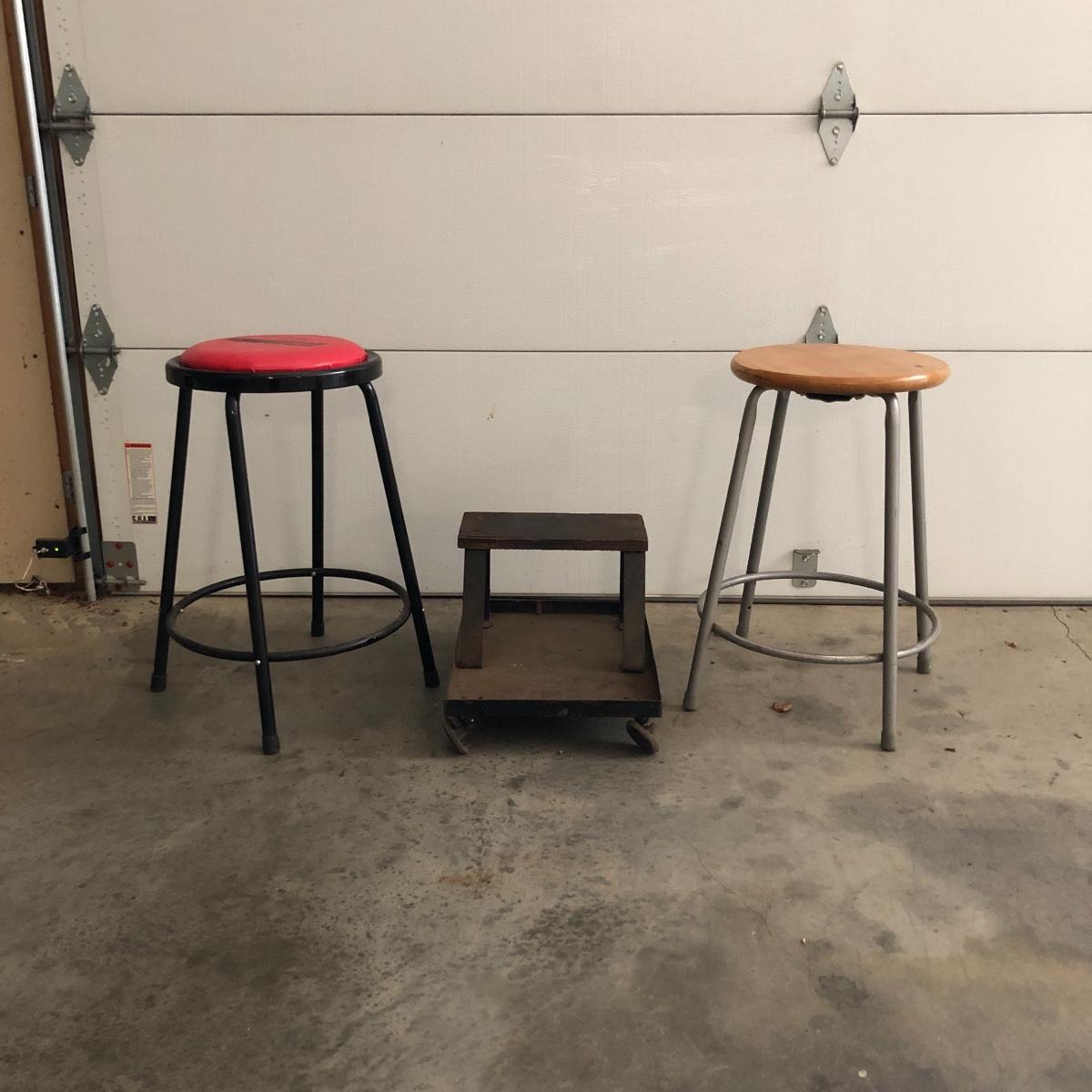 This lot includes a pair of stools; one metal stool has a padded seat and the other metal framed stool has a wooden seat. This lot also includes a rolling seat with tool tray. Stools measure 20.5”D x 24” tall.
