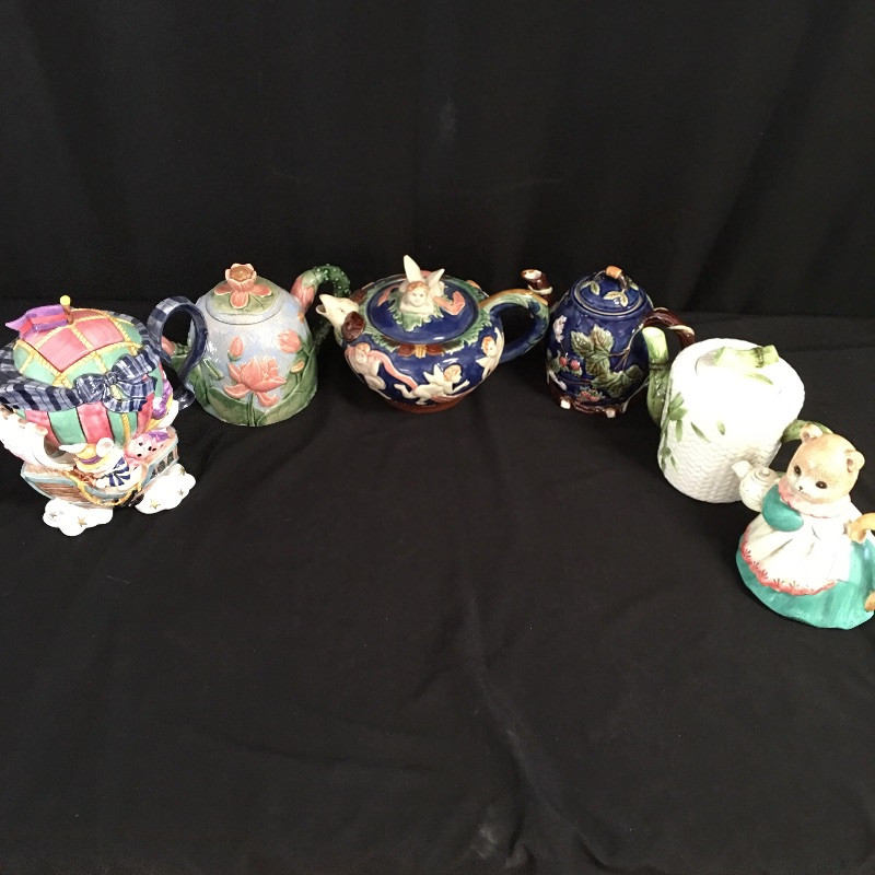 Attention all tea aficionados, here is a great collection of six teapots that come in a variety of shapes and sizes. They would look great in a display cabinet, but can be used as well.