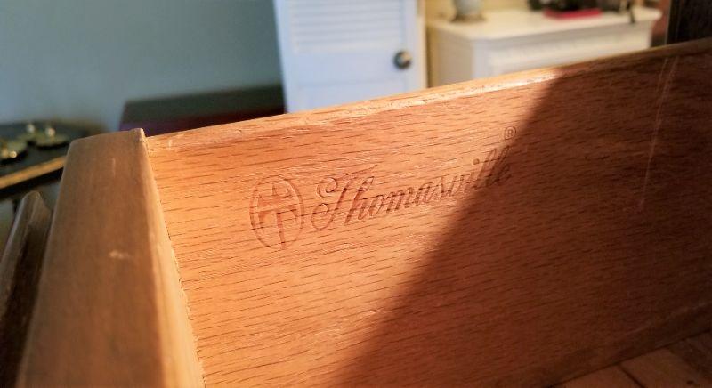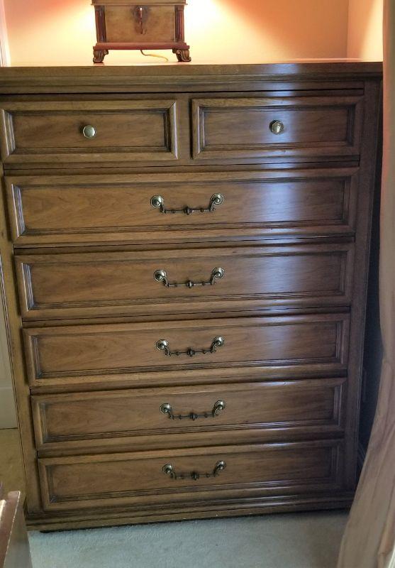 Nice tall solid wood Thomasville Chest of Drawers. Top has a bit of wear/discoloration in one place. Not really visible as the piece is so tall. Measures 21" deep, 42" across, and 53" tall.