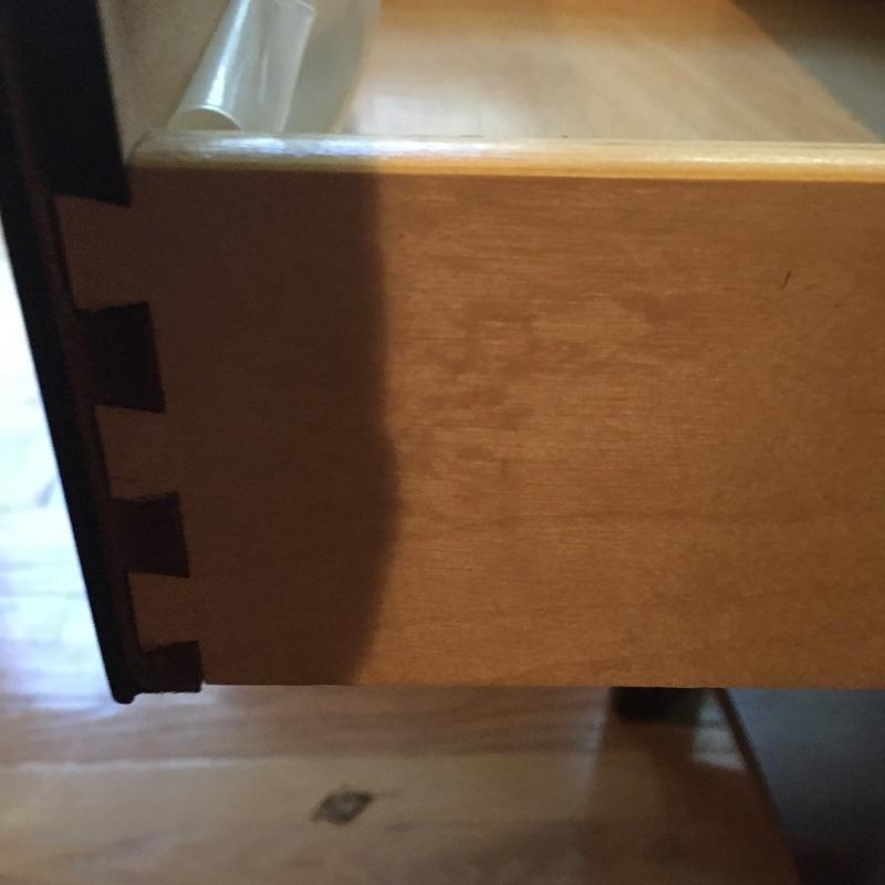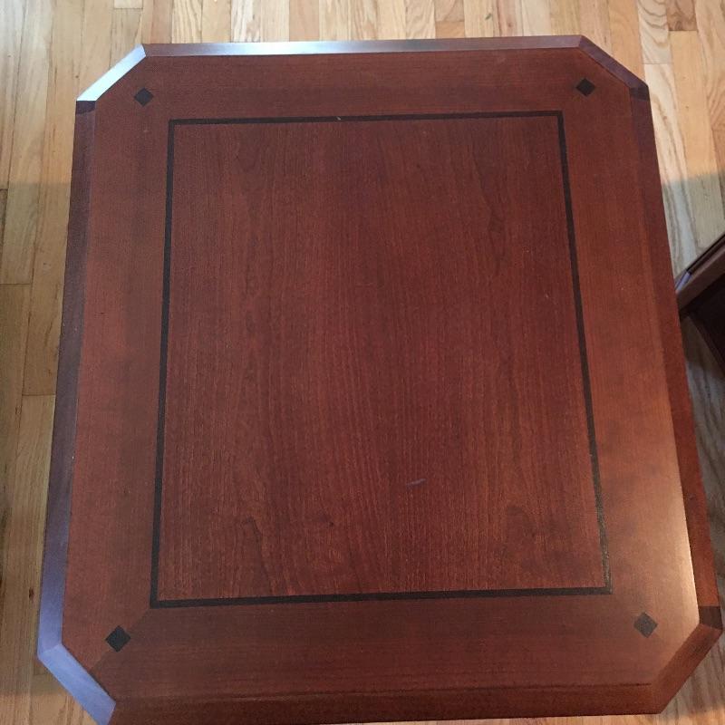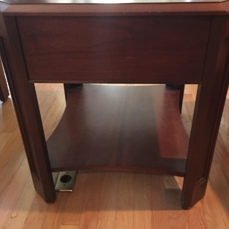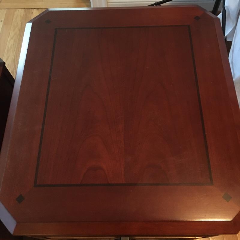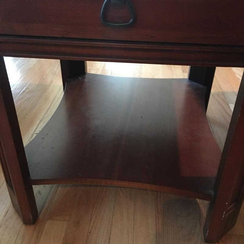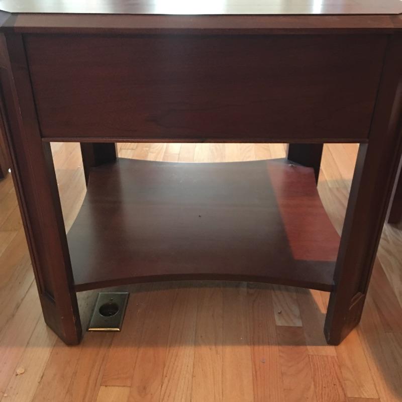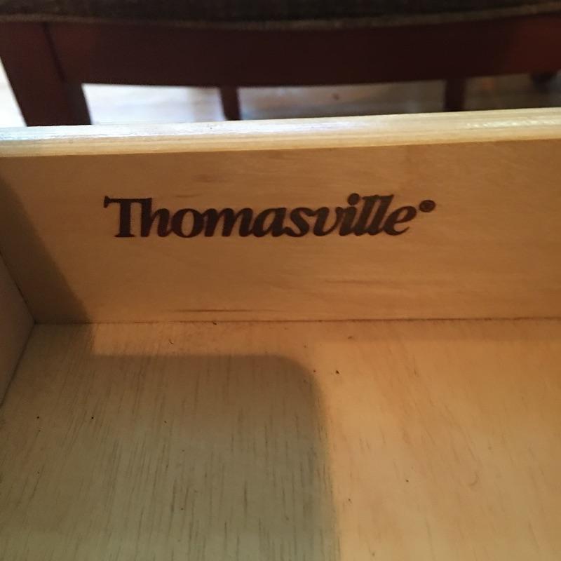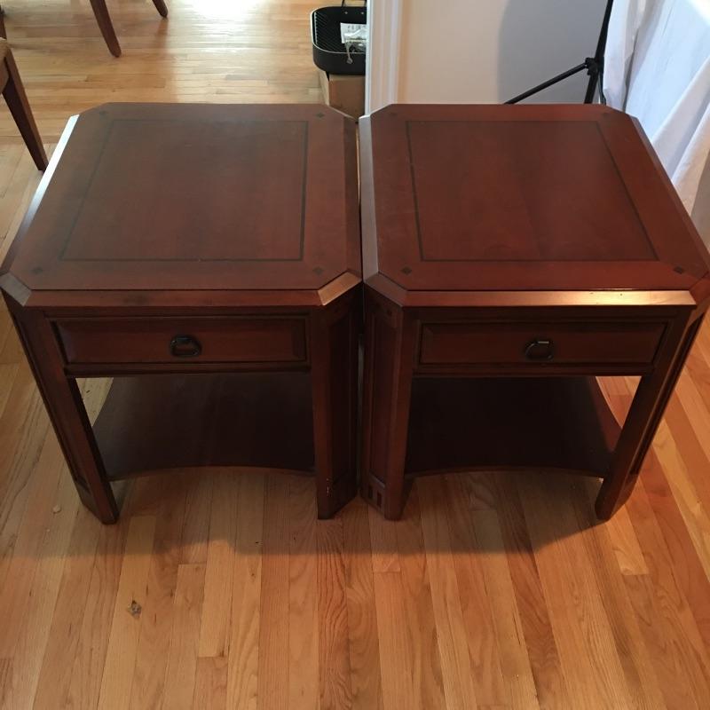 Pair of Thomasville side tables with dovetailed drawers and a shelf on the bottom. A lovely pair of side tables with a classic look. Tables match lot 59 and 75. Side tables measure 24.25” x 27.25” x 25.5”. One table has small mark on top, see pictures.