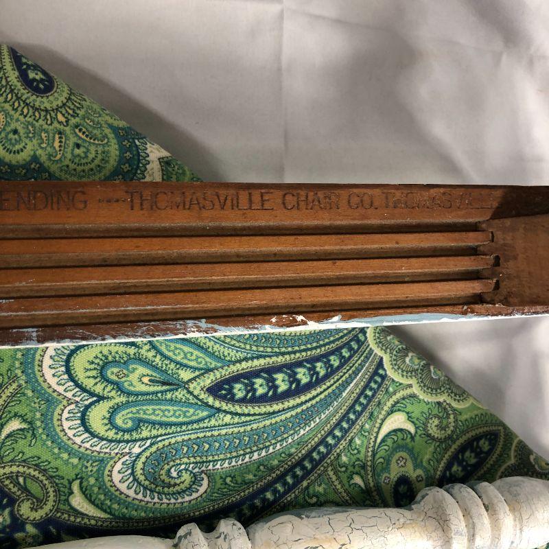 This bench is marked as Thomasville on the inside and is in very good condition. It is a project piece in the sense of probably not being your color choice. I think that the wood is mahagony and it stands 16.5" tall and about 23" wide.