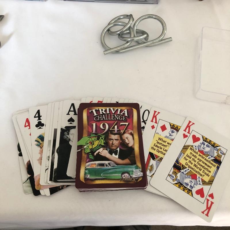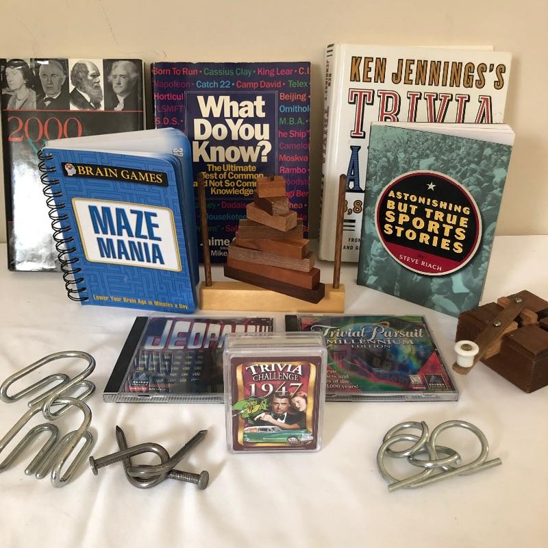 Exercise and entertain your mind with this lot that includes trivia playing cards, puzzles and books.