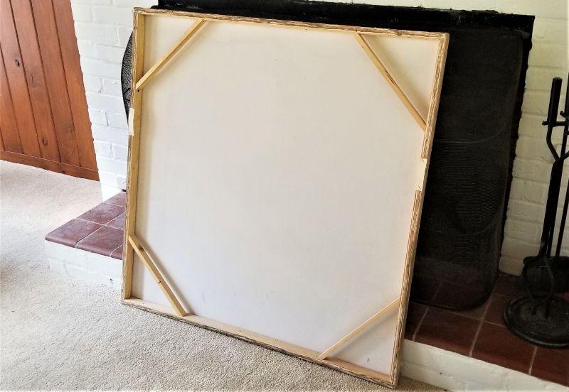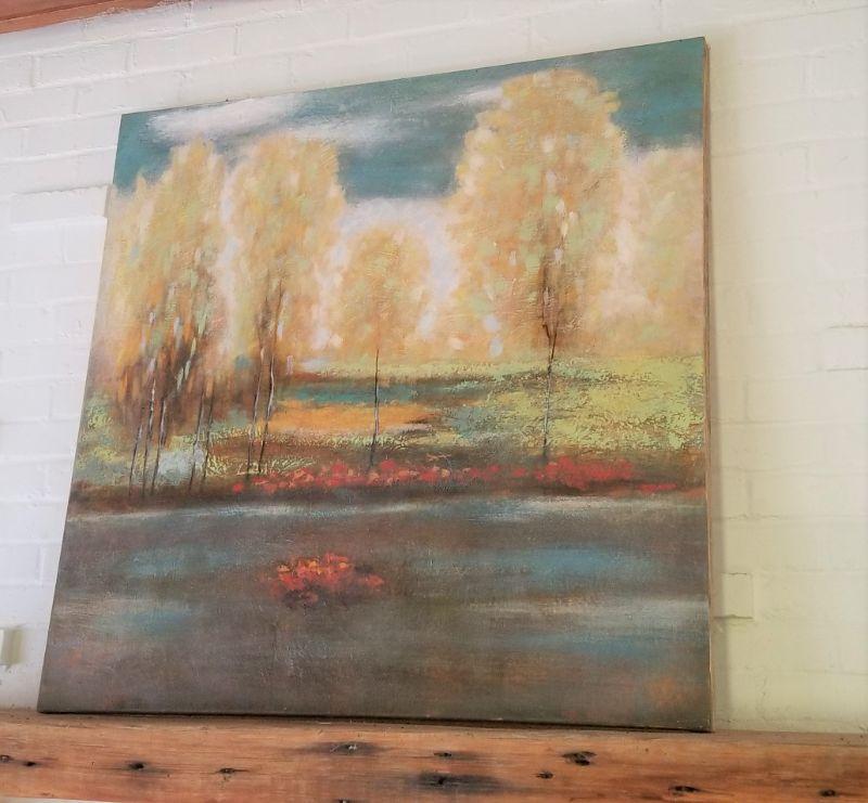 Large unsigned decorator painting on canvas - measures 39.25" across, 40" tall. Attractive piece with muted colors.