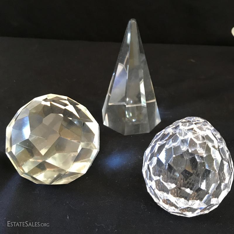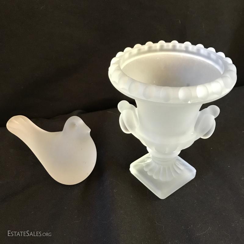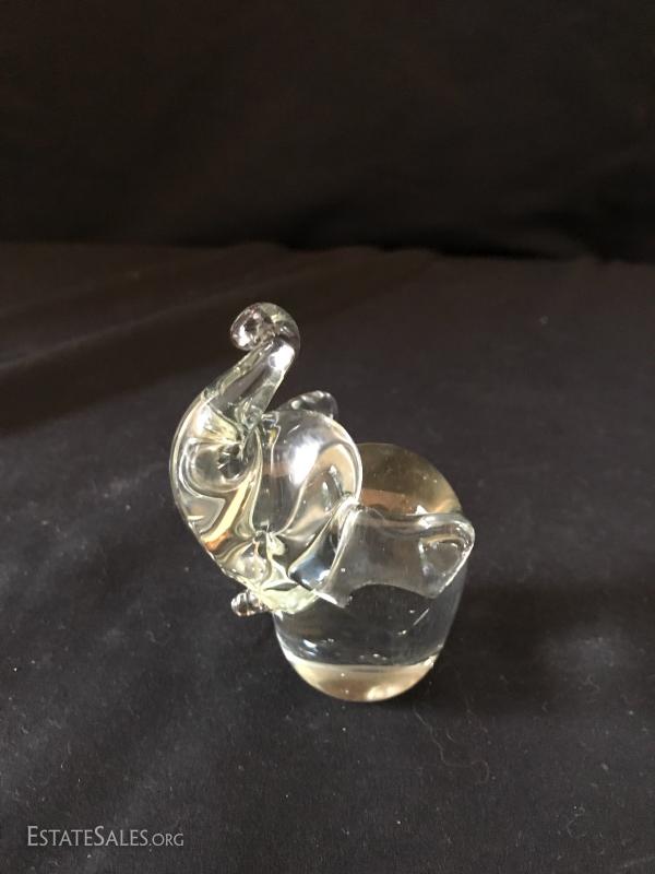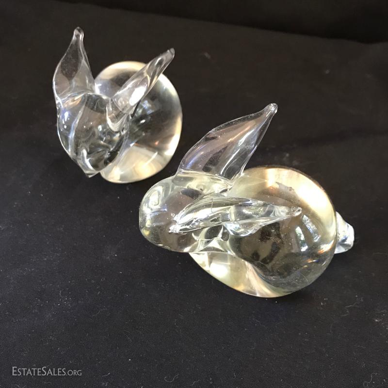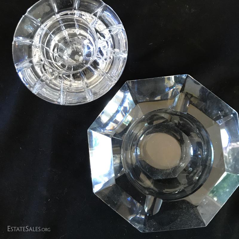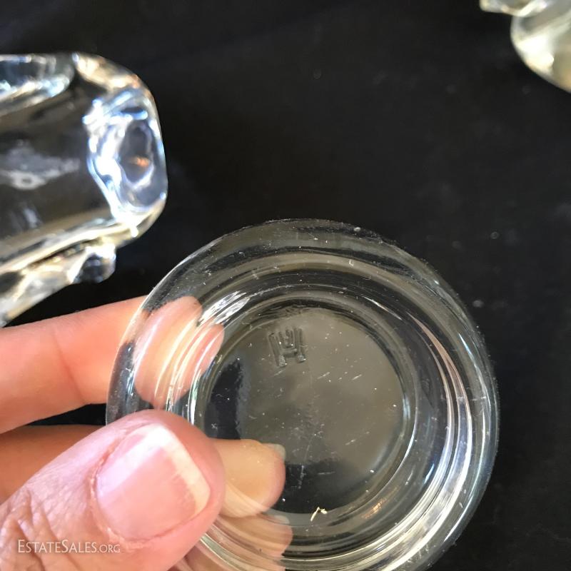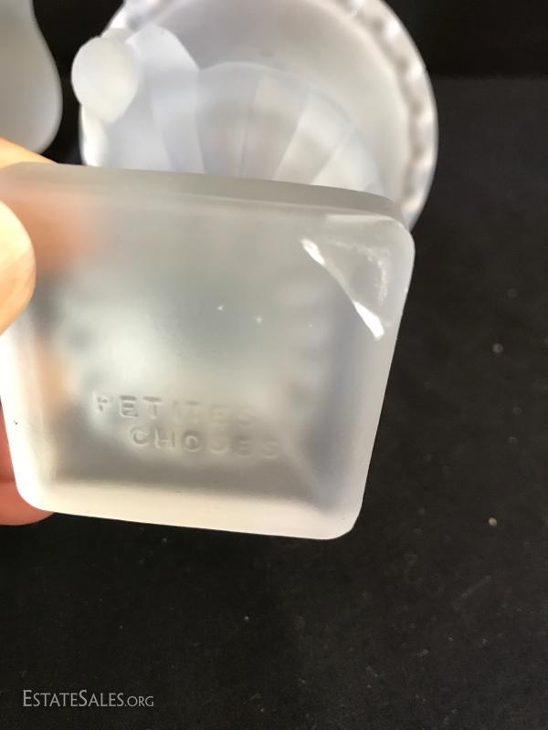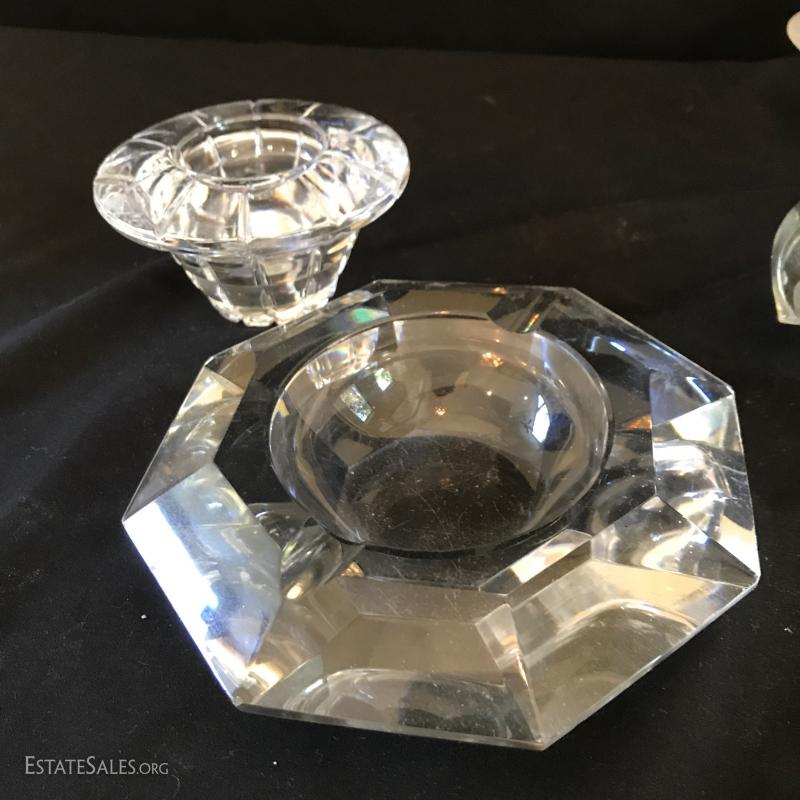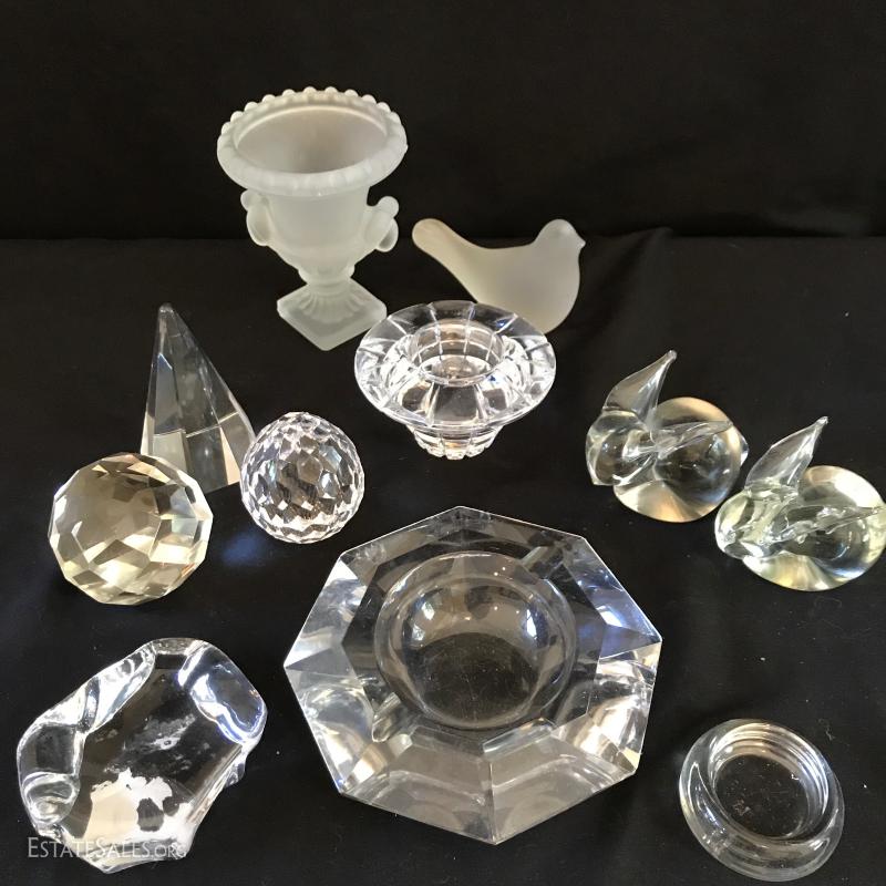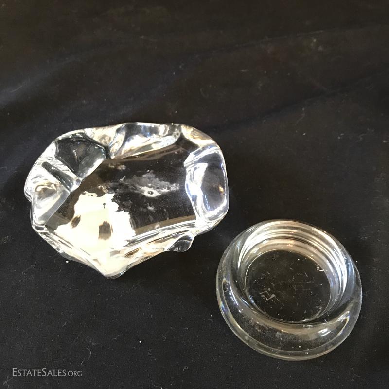Various glass pieces include ashtray (6"diameter), geometric pieces (cone is 4"tall) , animals and candle holder. Also includes two frosted glass pieces. Frosted pedestal bowl (5"tall) says "Petites Choses" on bottom. Has small crack on corner underneath that has not gone all the way through. Shipping available or local pick up in Flat Rock, NC.