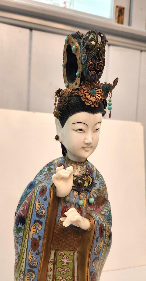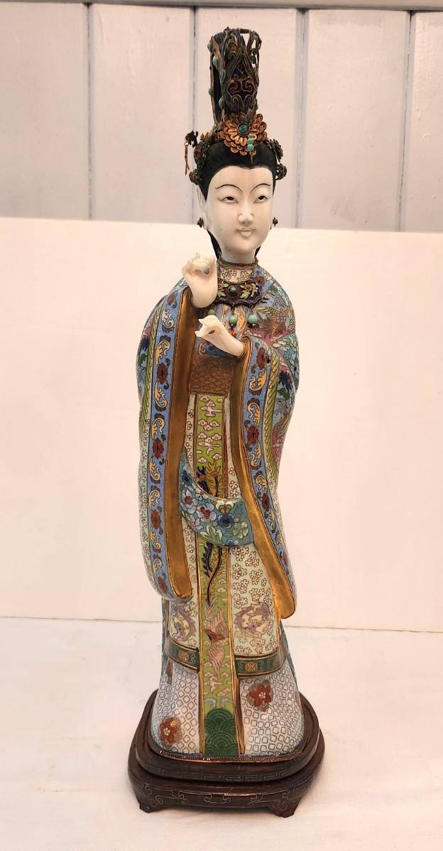 Vintage Chinese Cloisonne Enamel decorated female figure - note attached headdress, necklace, and earrings. 23" tall, good condition.
