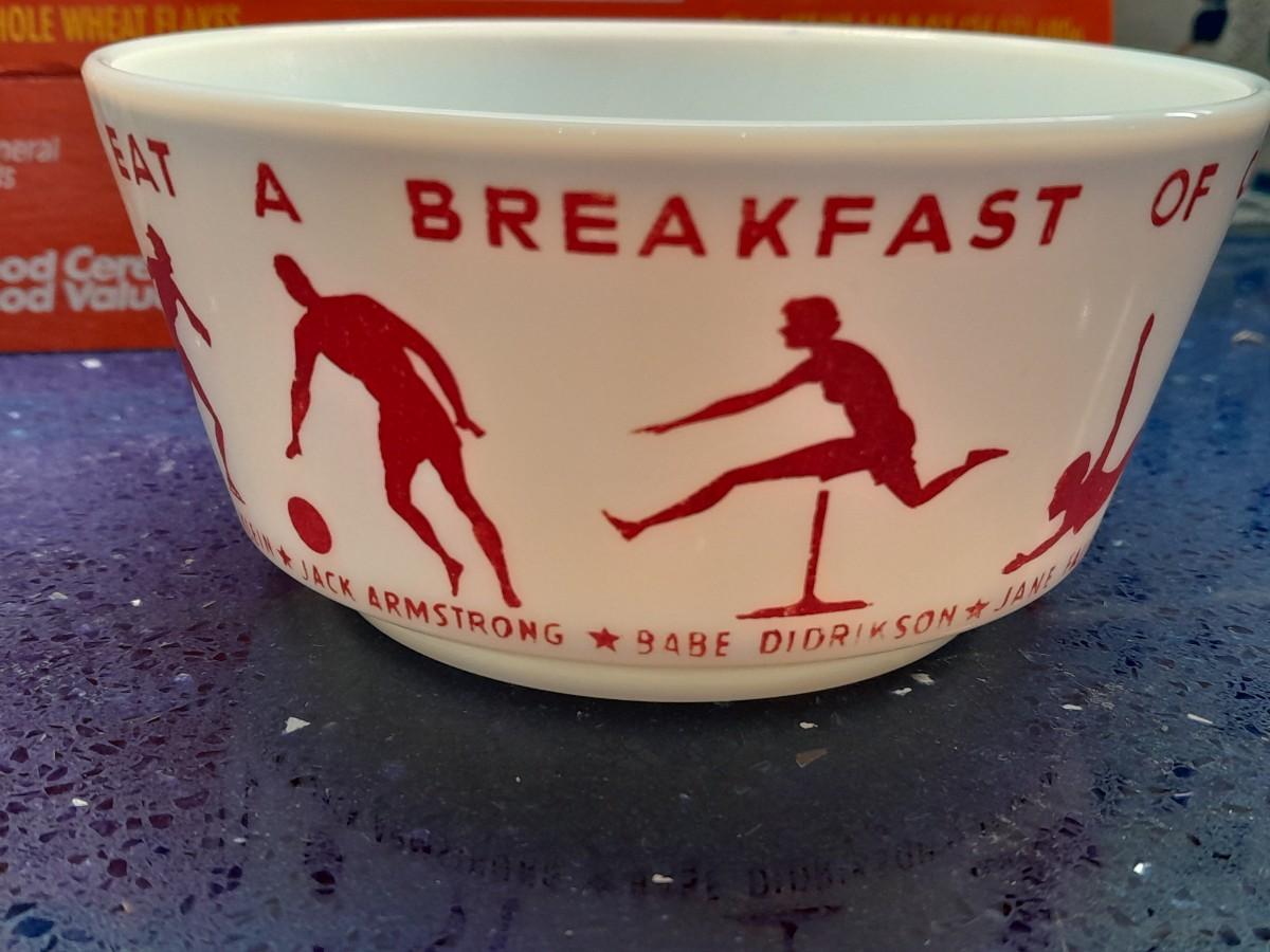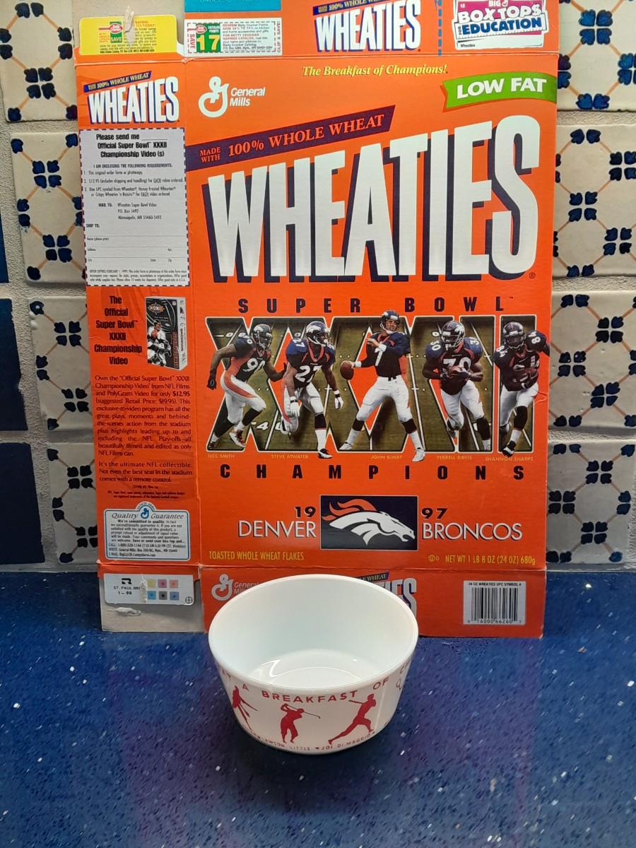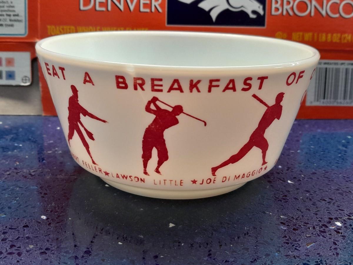 VINTAGE GLASS CEREAL BOWL AND WHEATIES COLLECTIBLE BOX