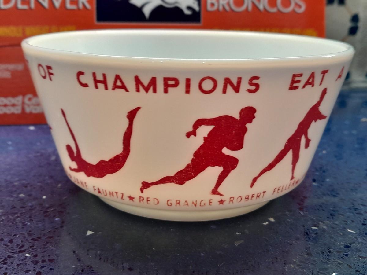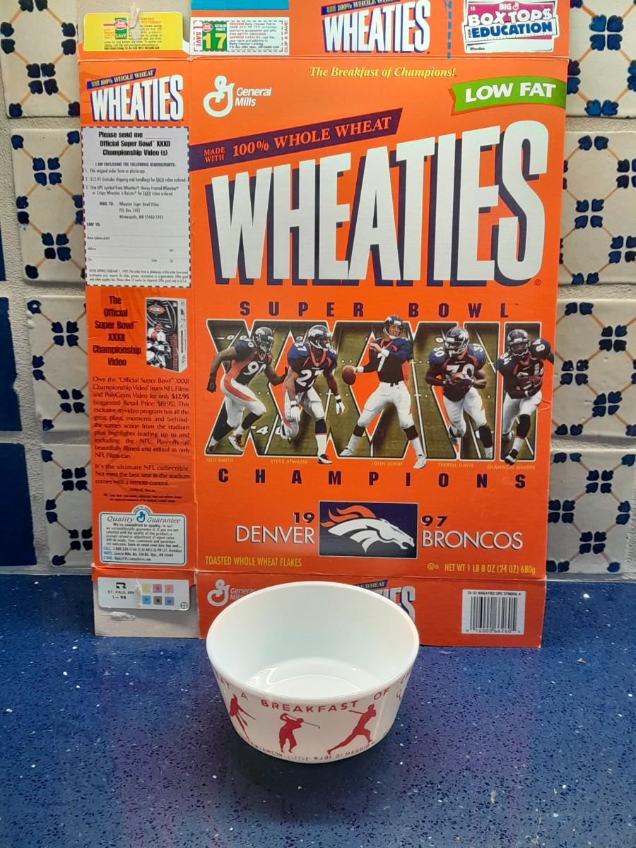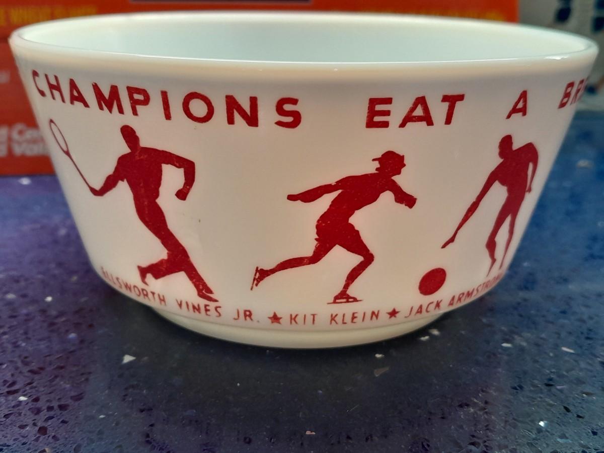 VINTAGE GLASS CEREAL BOWL AND WHEATIES COLLECTIBLE BOX