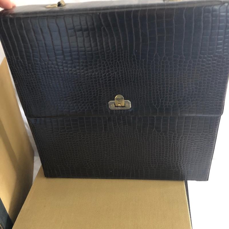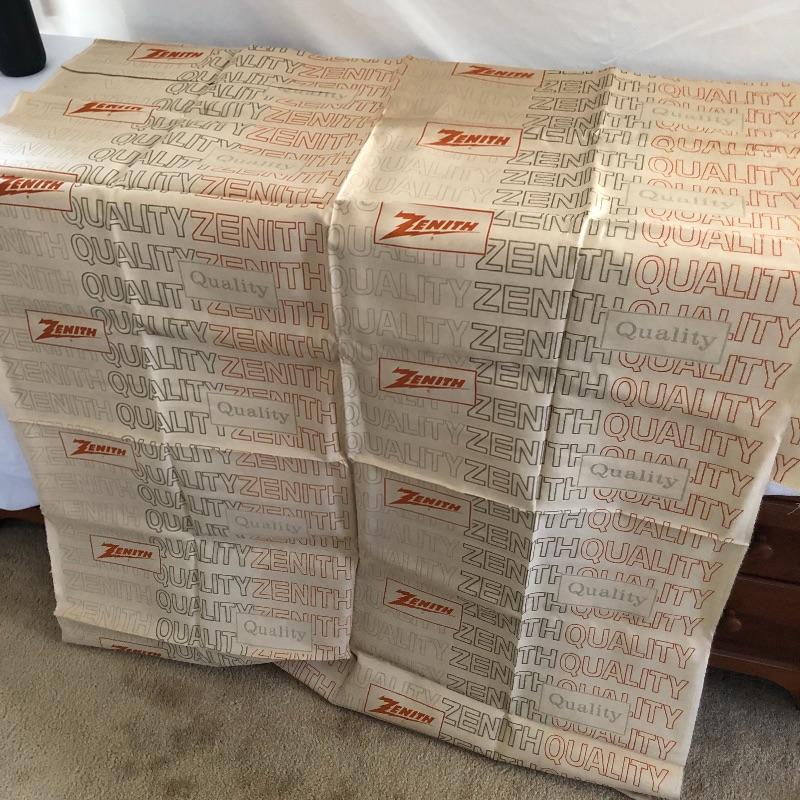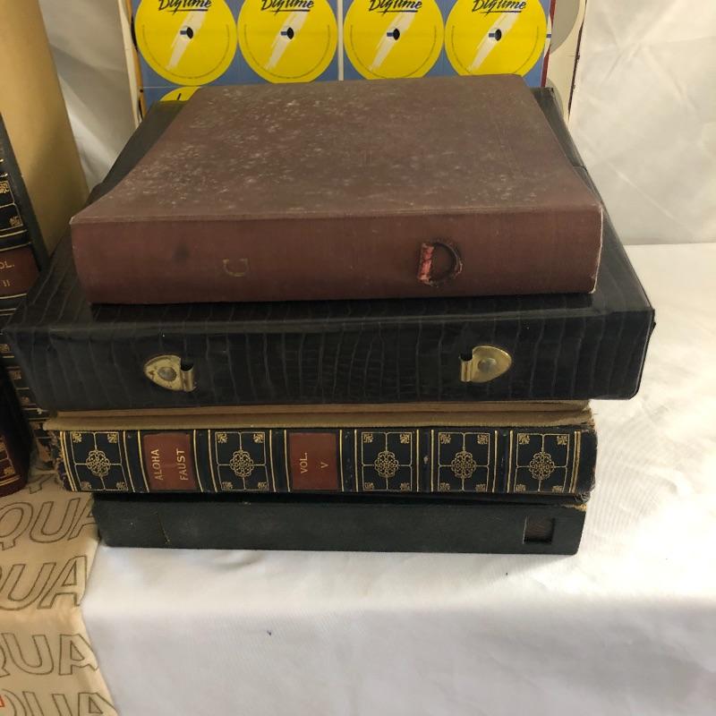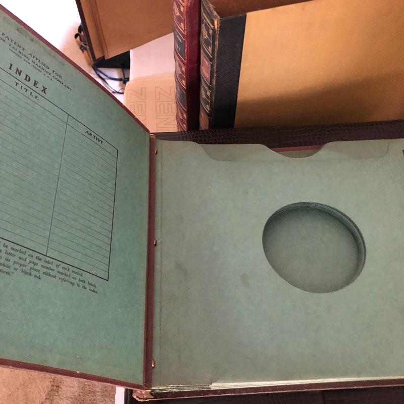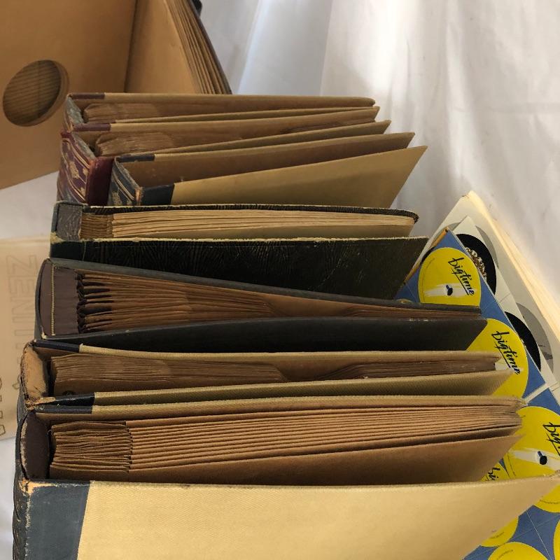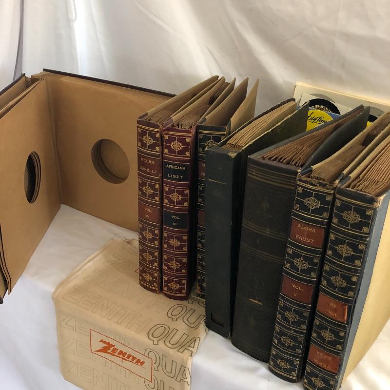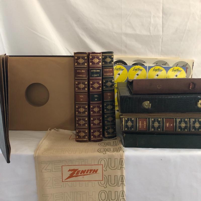 Nine vintage vinyl sleeve books and one case in this lot along with lots more in individual sleeves and labels. A great way to store and protect your vinyl, books hold an average of 12 discs. Also included is a vintage Zenith table cloth and a curtain.