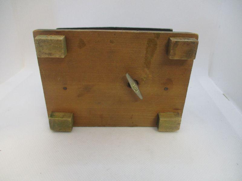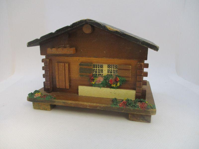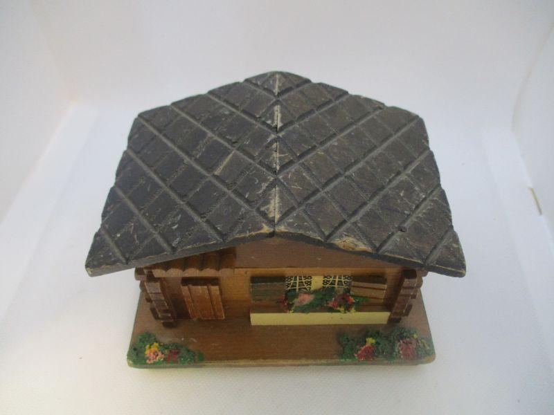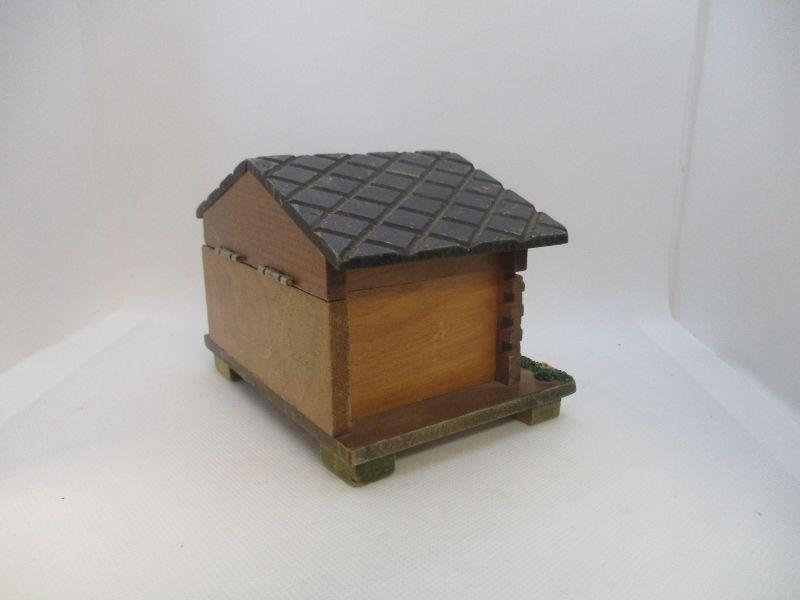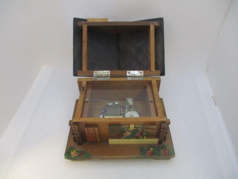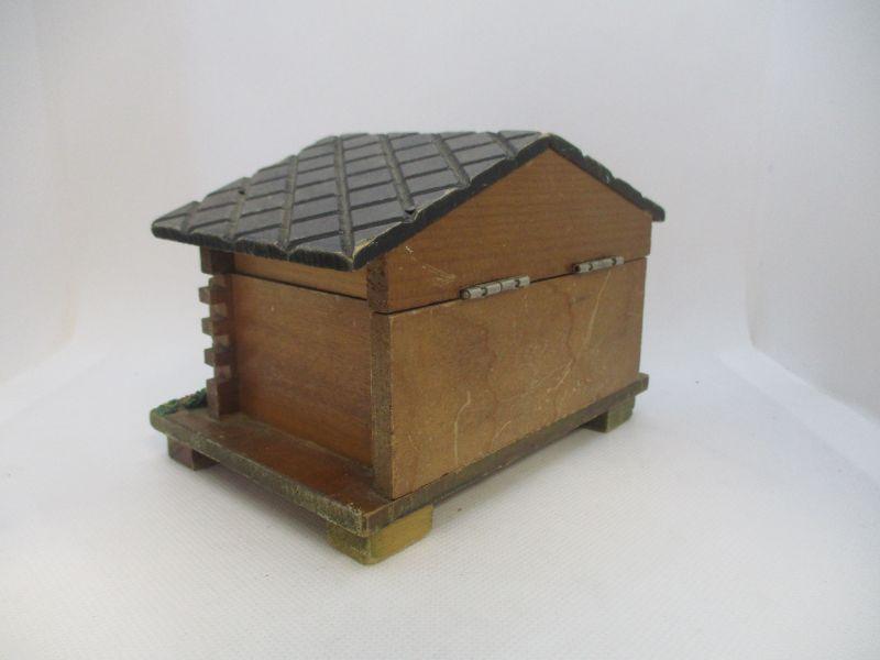 The consignor stated that this box belonged to her father who had had it for quite some time. It winds easily and plays Lara's Theme from Dr. Zhivago when opened. It is about 5.5" wide and 3.75" at the highest peak. The only real issue I see is a ding to the wood roof at the front.
