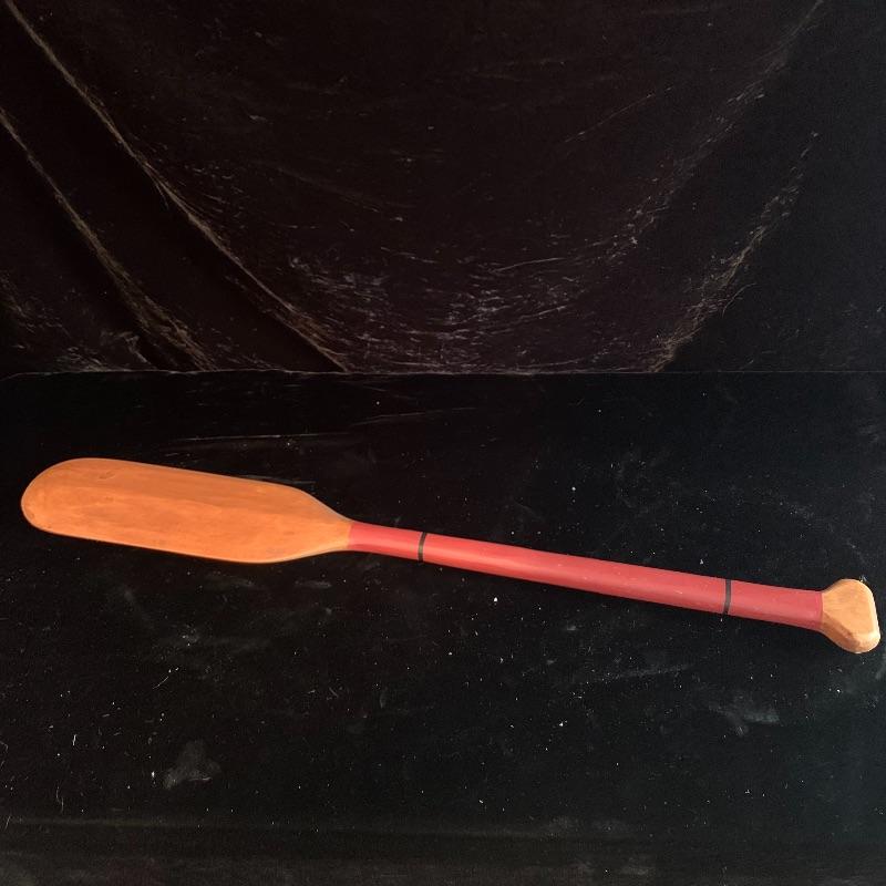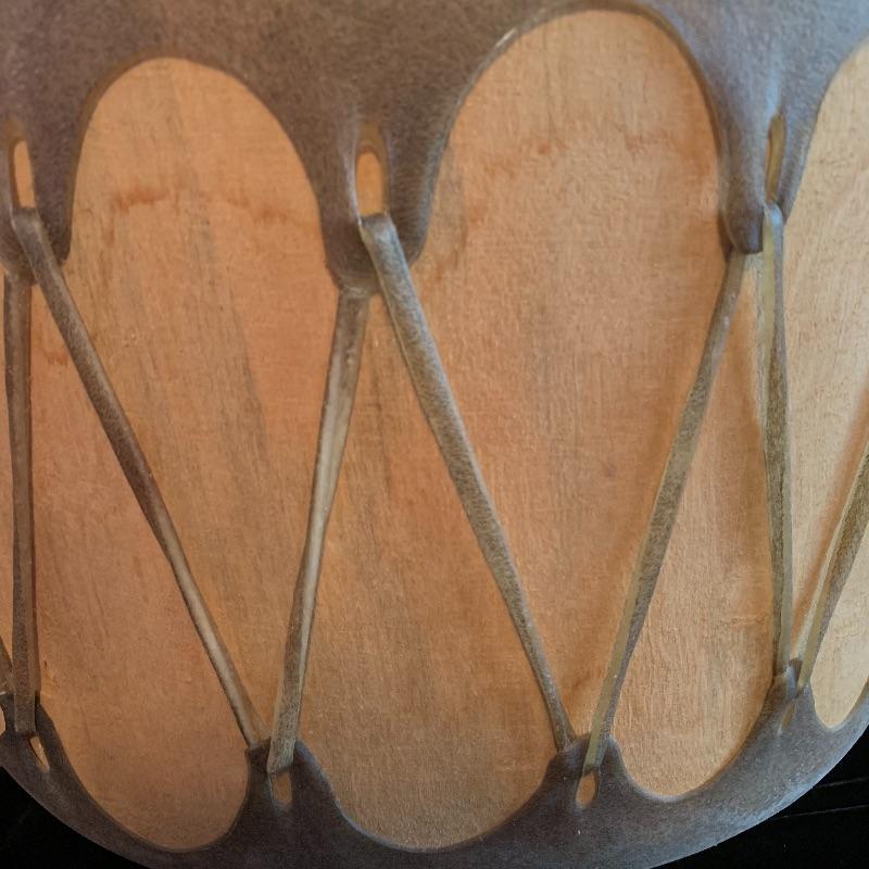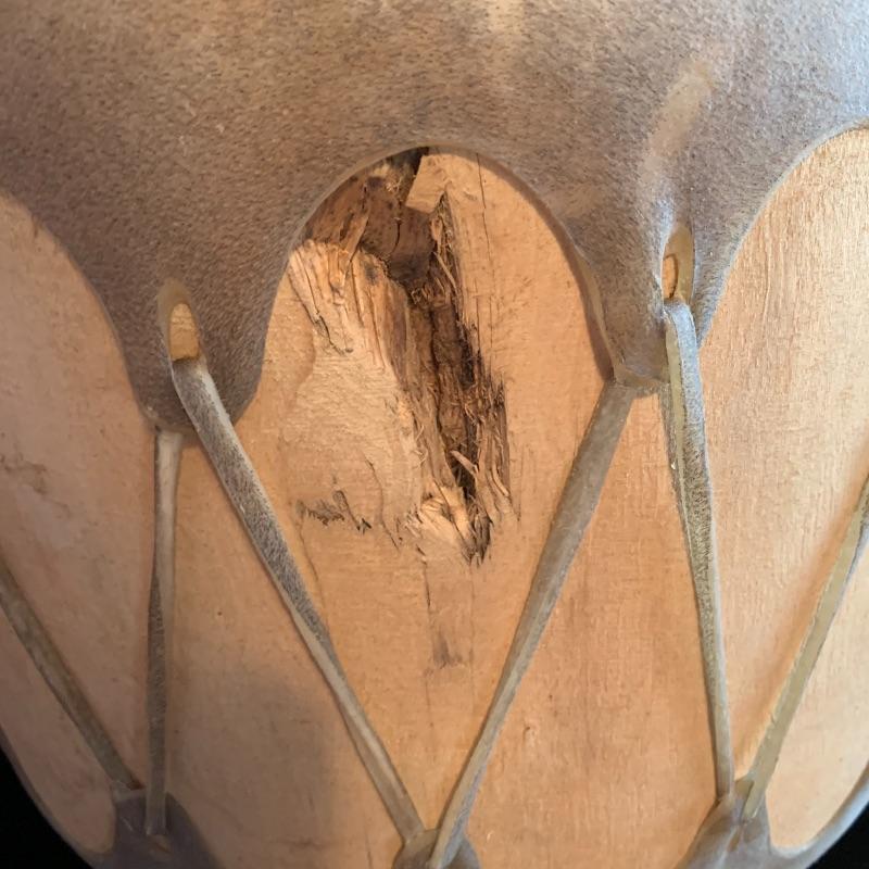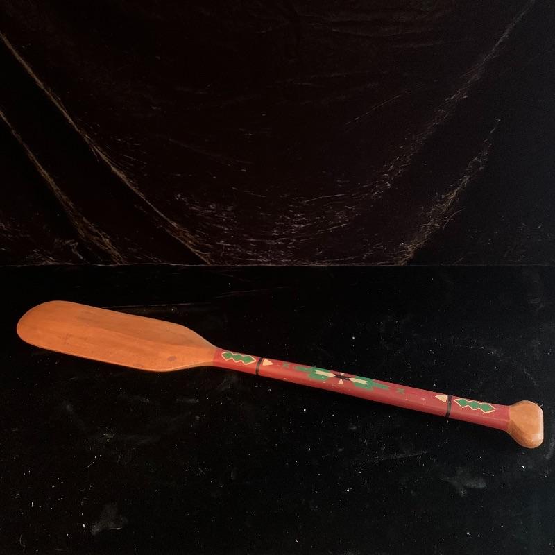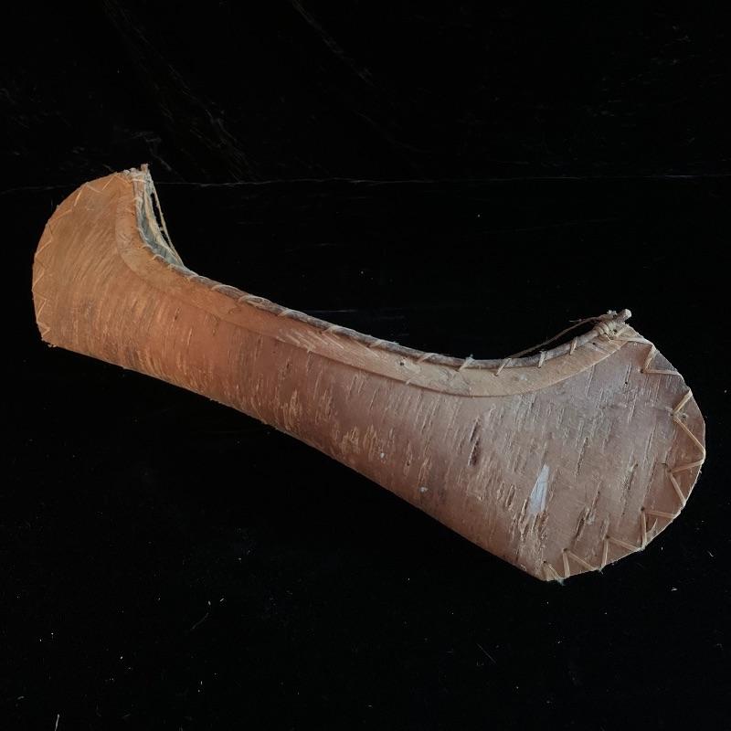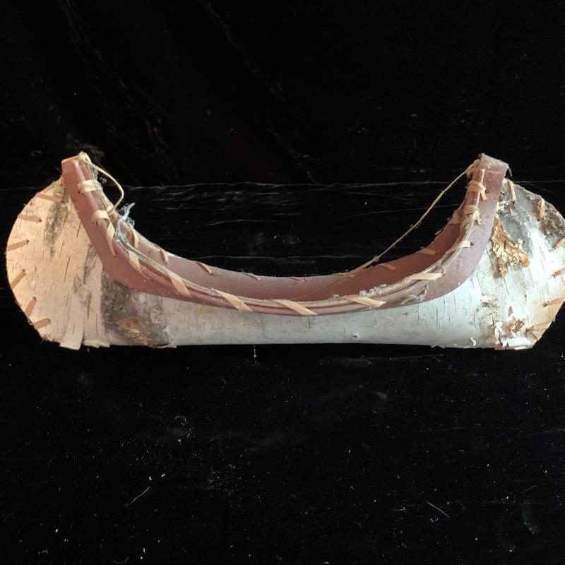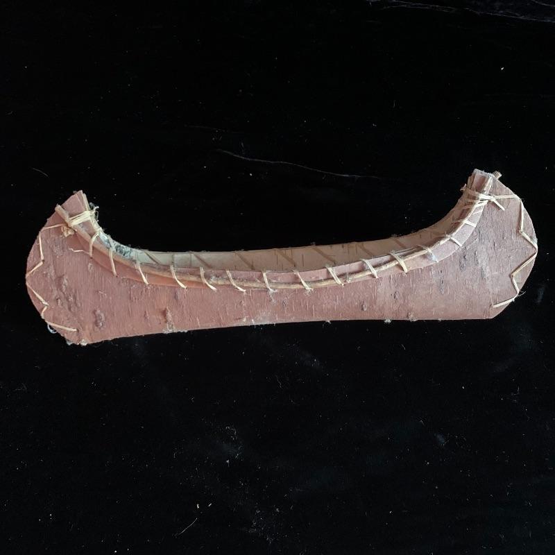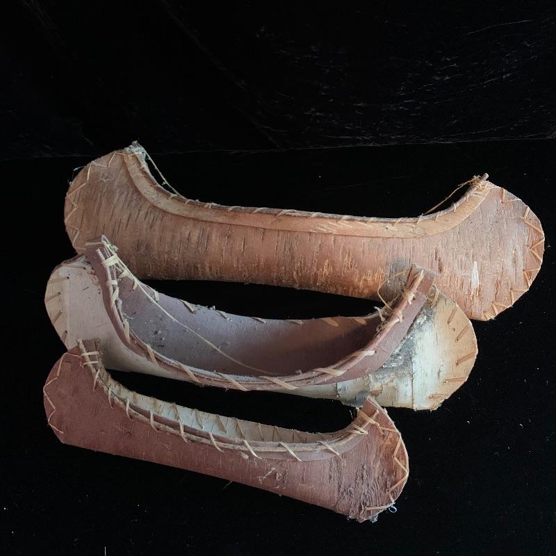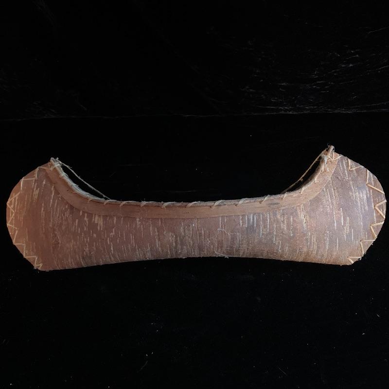 This lot includes one wooden drum, three wooden canoes, and a wooden paddle. The drum is made of soft wood and hide and has a matching drum stick made of similar material. It has a chunk missing from the back (see pictures). The drum measures about 10in x 13in. The three canoes appear to be made of bark. The largest canoe measures about 22in x 6.5in. The lot also includes a painted wooden paddle that measures about 36in long. Local pick up only.