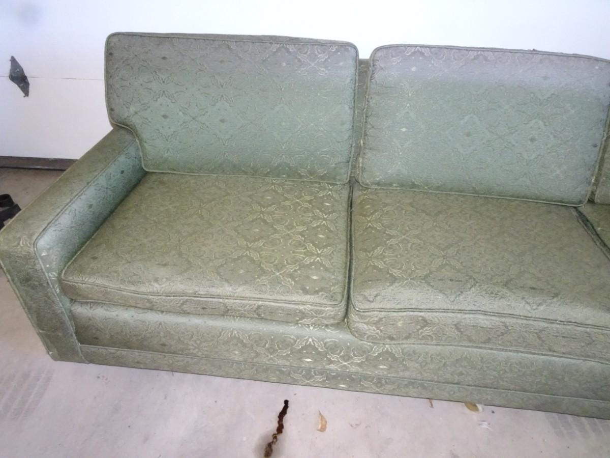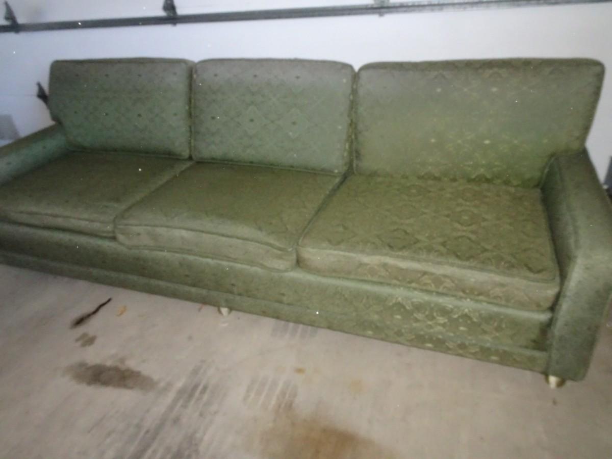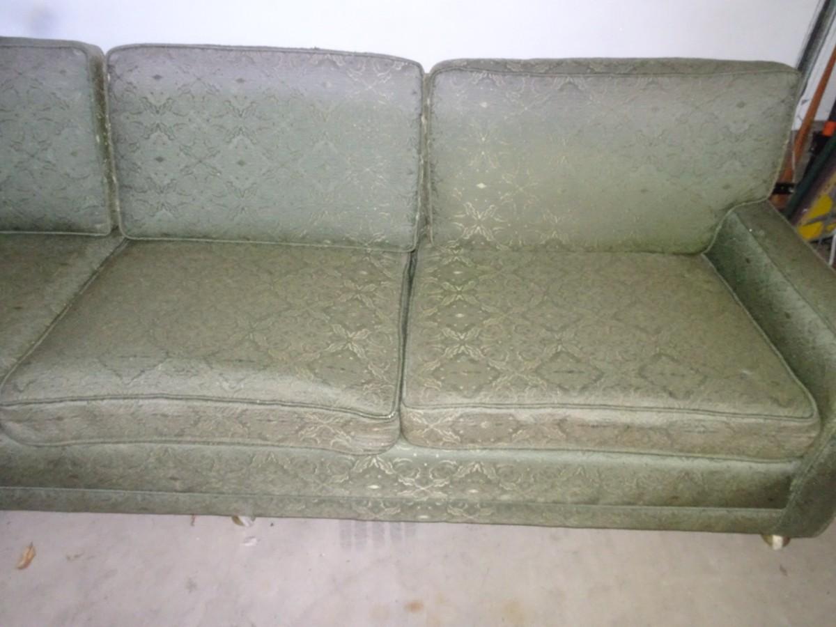 LOT 561. 8 FO0T LONG VINTAGE SOFA ON CASTERS NEEDS CLEANING