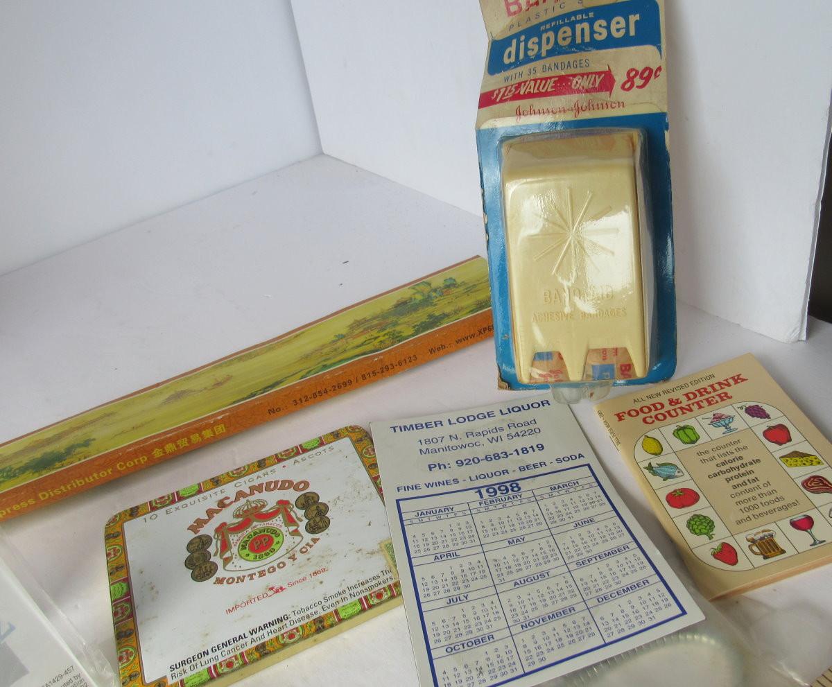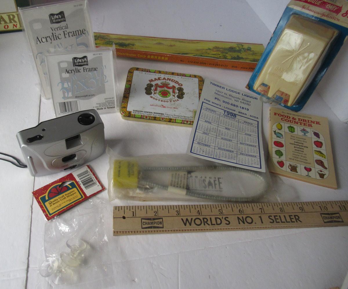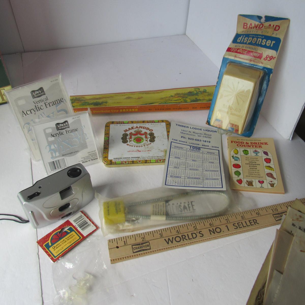 Some advertising, lock, acrylic frames, vintage band aid dispenser, more. Camera has film in it, only 1 shot used.. Shipping available at shipping cost plus $5 per box handling fee. All sales final, no refunds. See our terms for details.