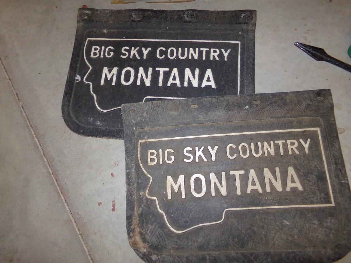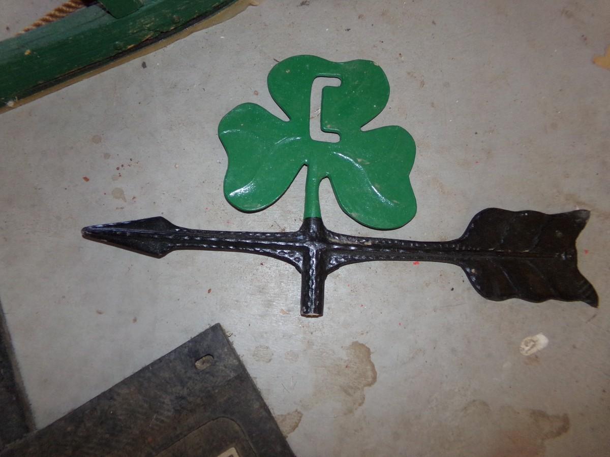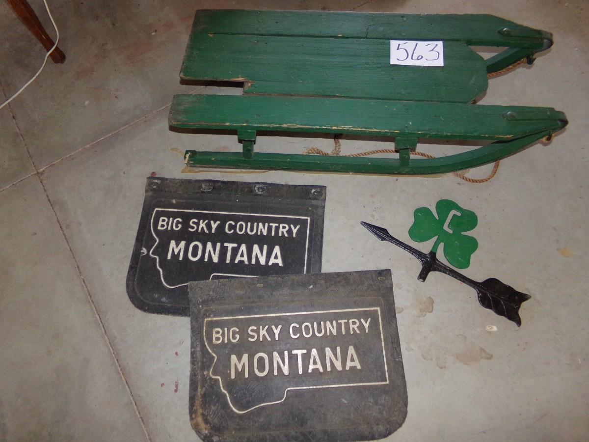 CLEARY BUILDINGS CLOVERLEAF CAST IRON WEATHERVANE, BIG SKY MONTANA MUD FLAPS AND A VINTAGE WOODEN SNOW SLED.(HAS SOME DAMAGE)
