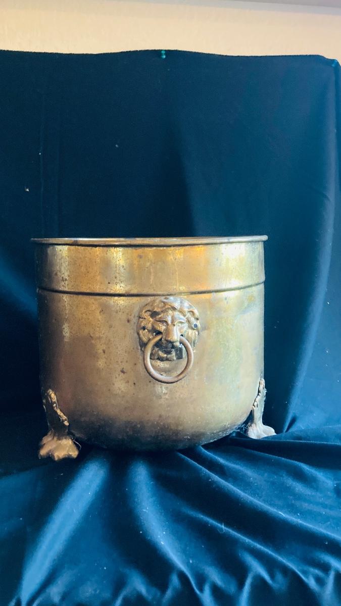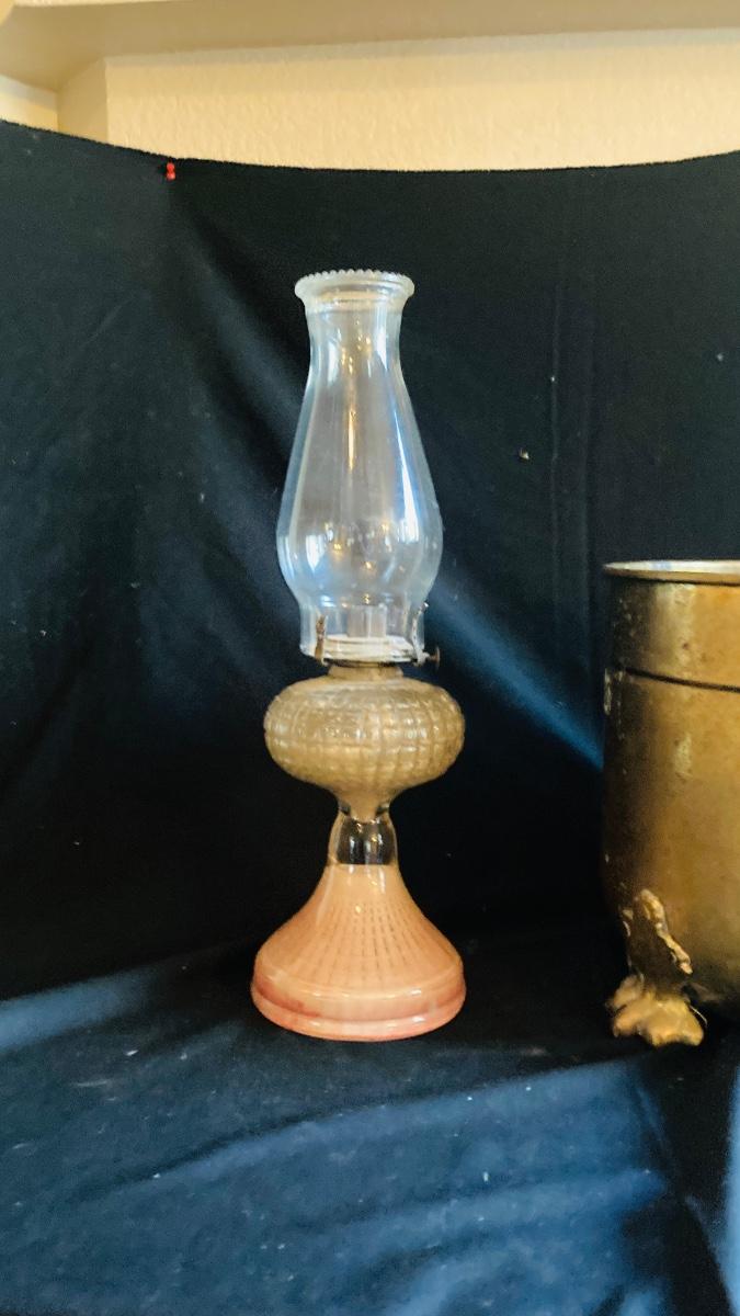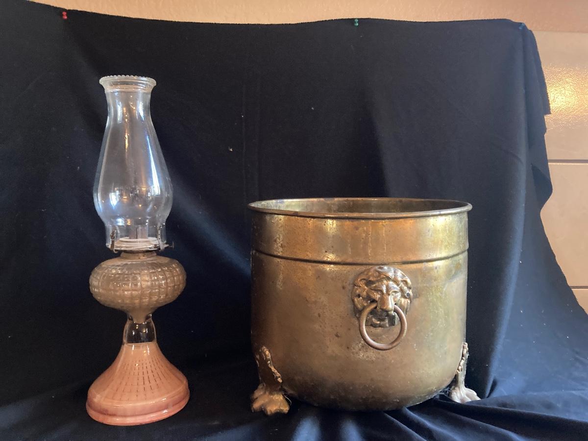 BRASS BUCKET AND ANTIQUE OIL LAMP