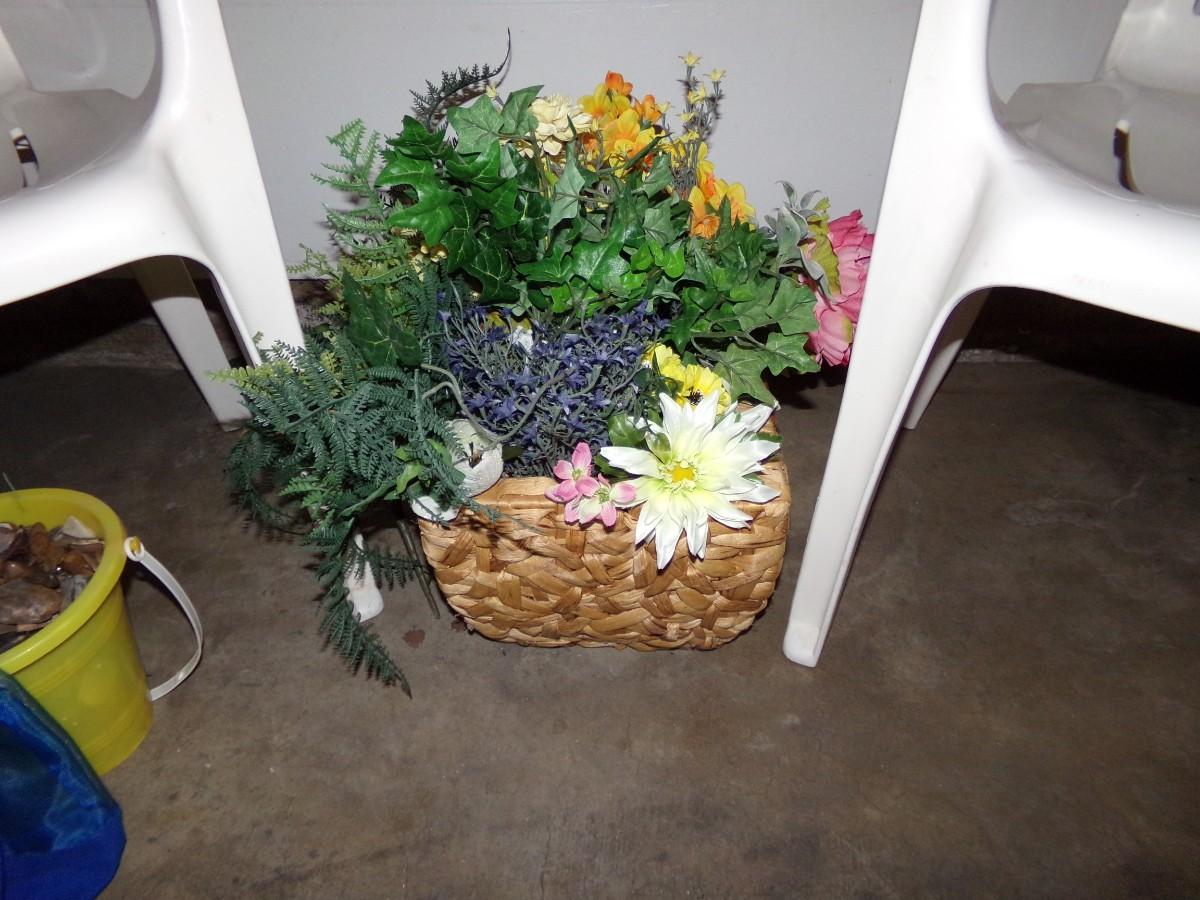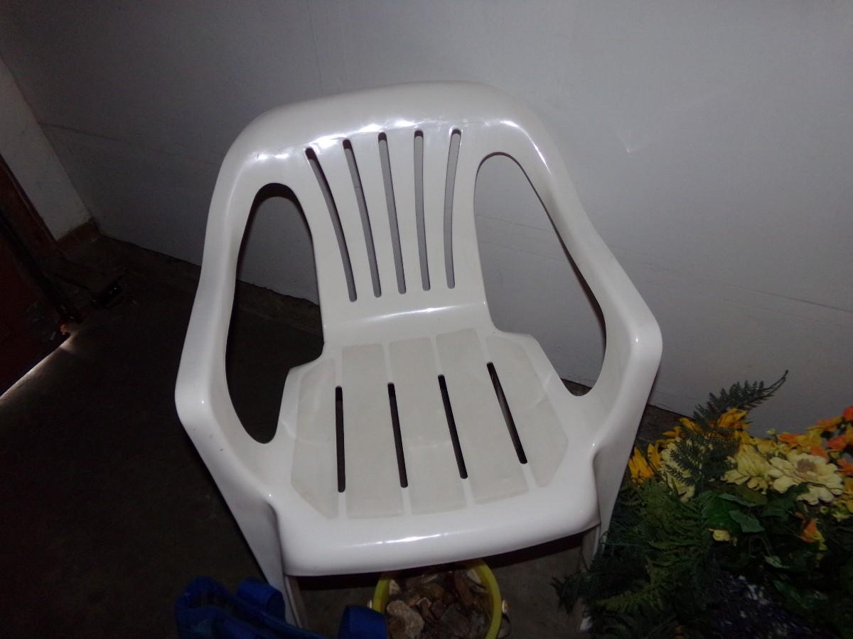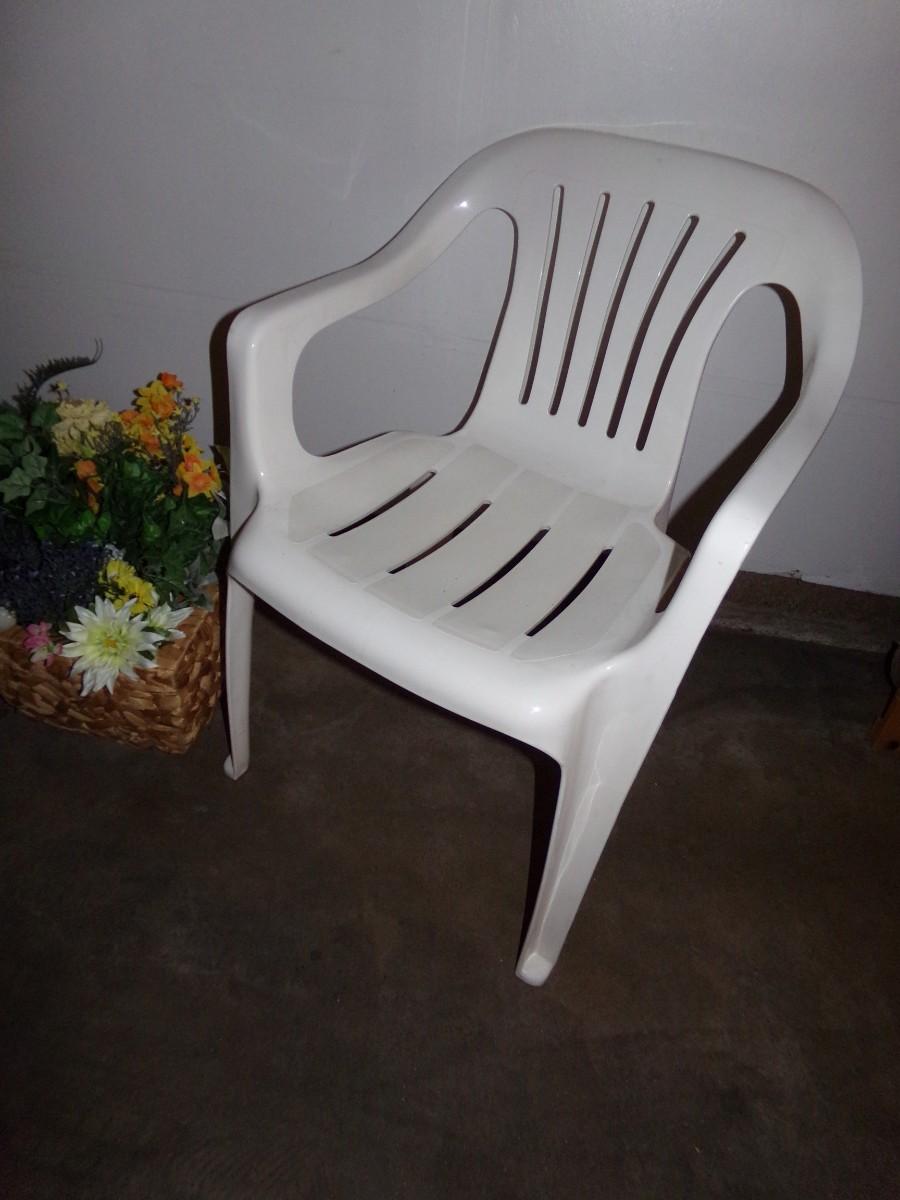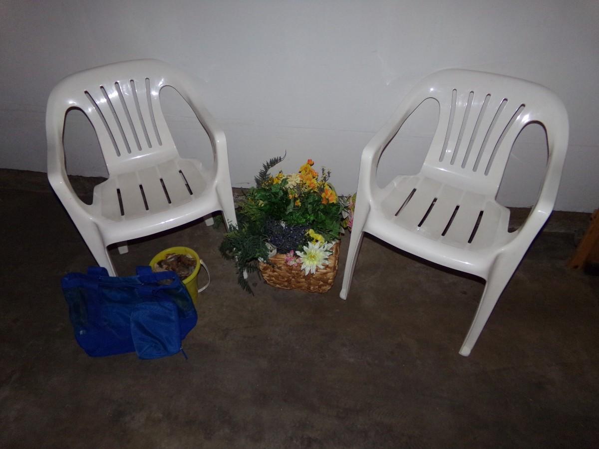 2 PLASTIC CHAIRS WITH A FLORAL ARRANGEMENT.