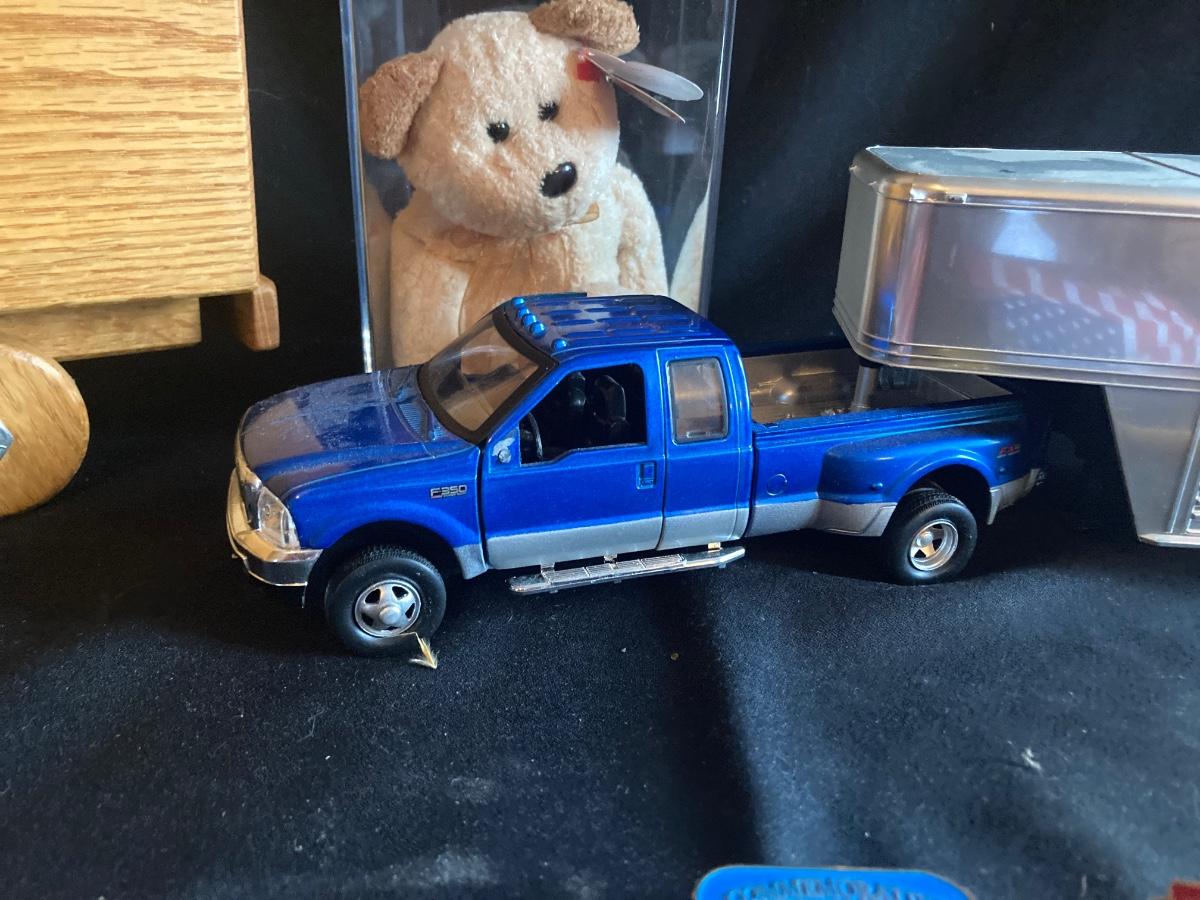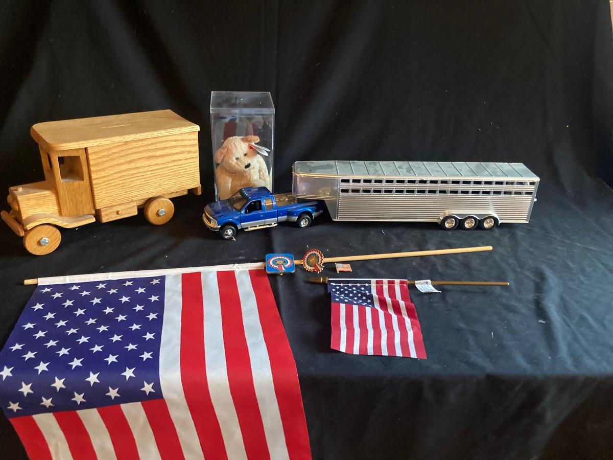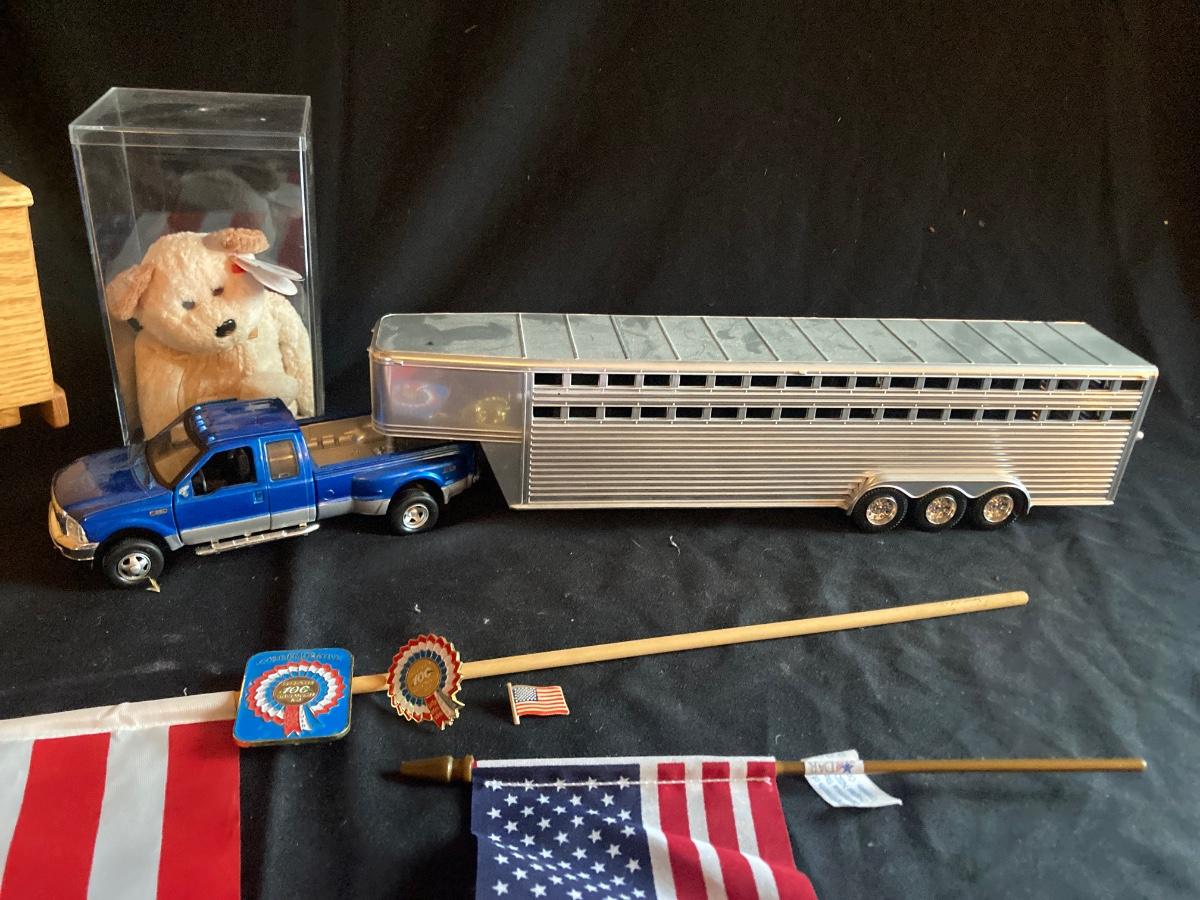 HORSE TRAILER AND DODGE PICK-UP, ALL WOOD BANK TRUCK, BEANIE BABY BEAR AND MORE