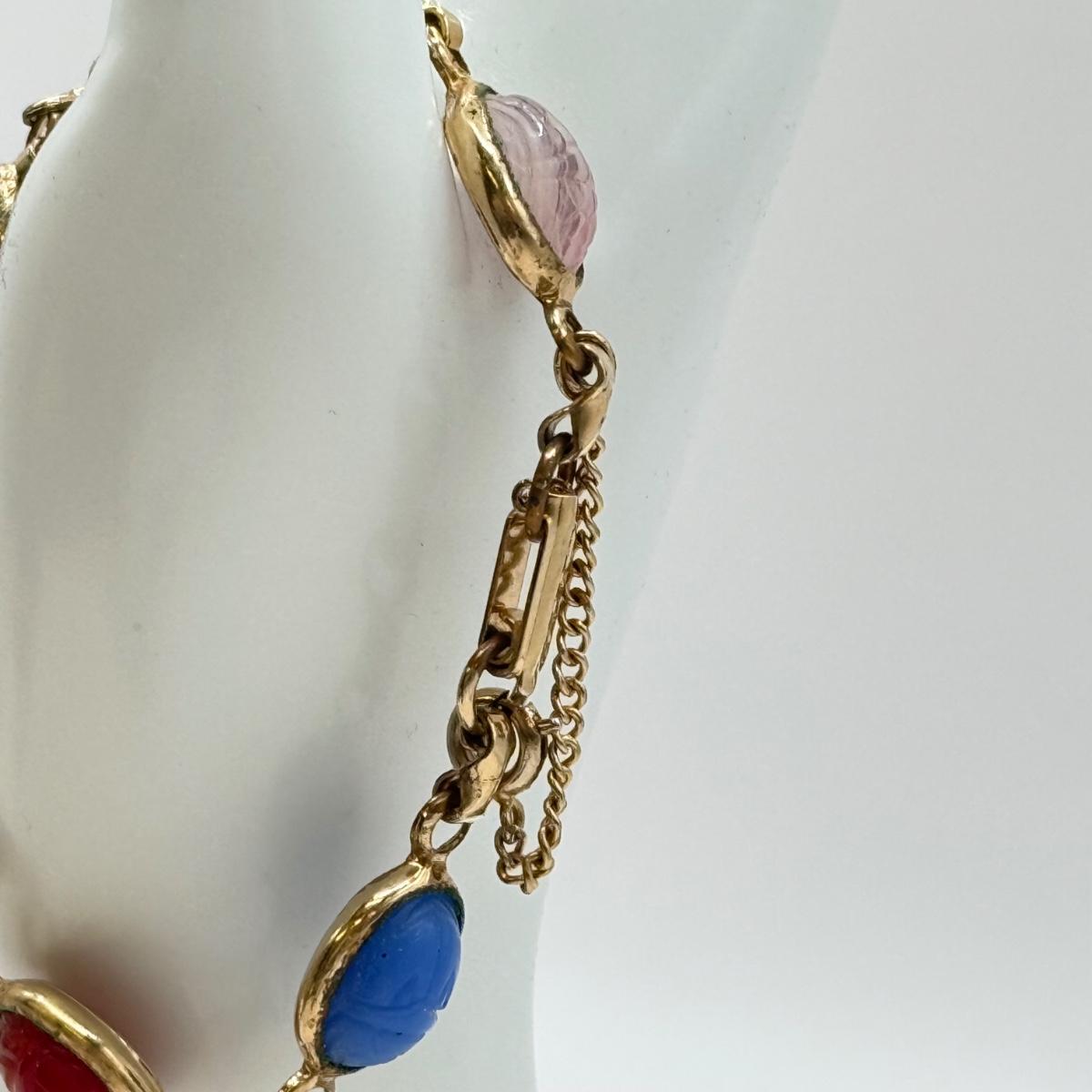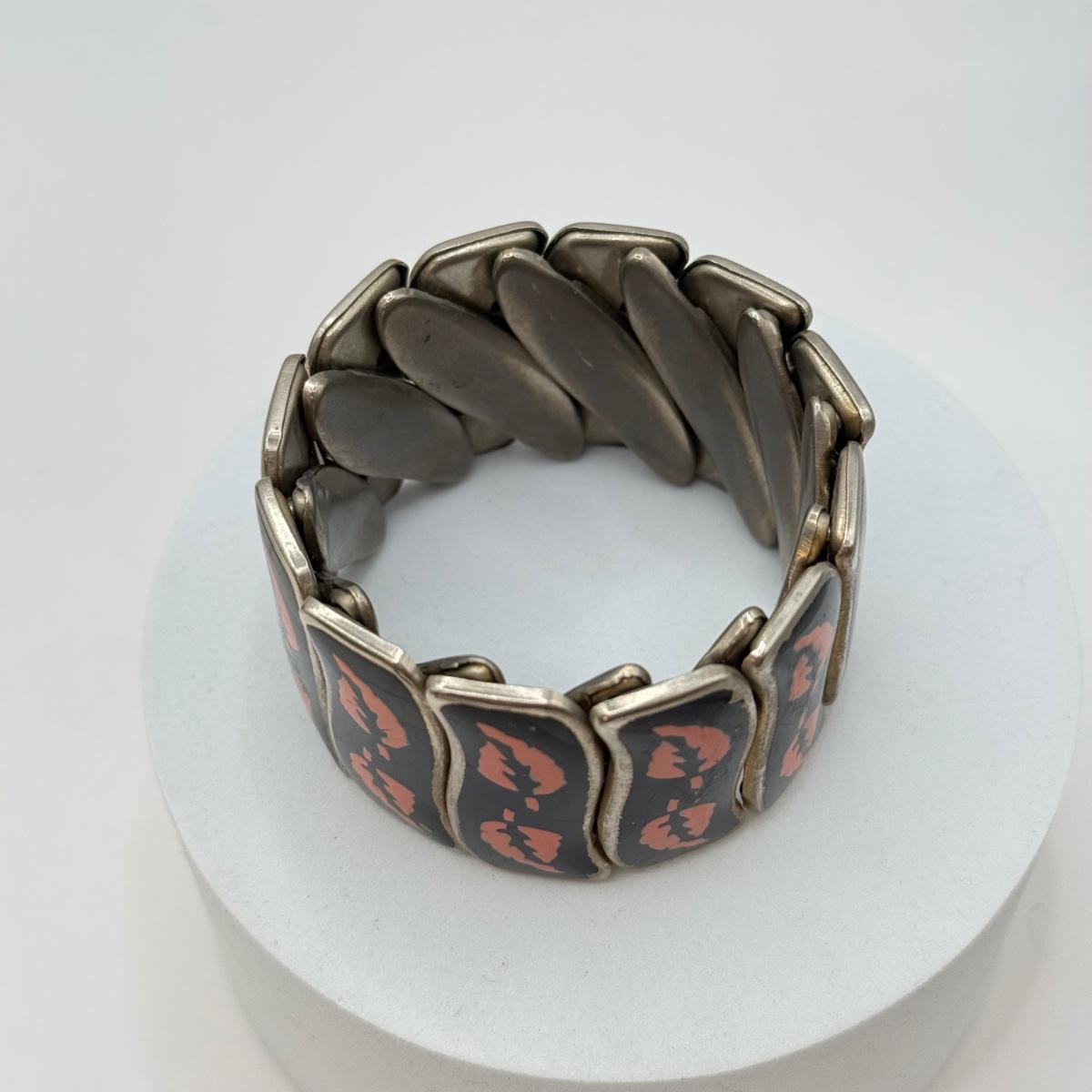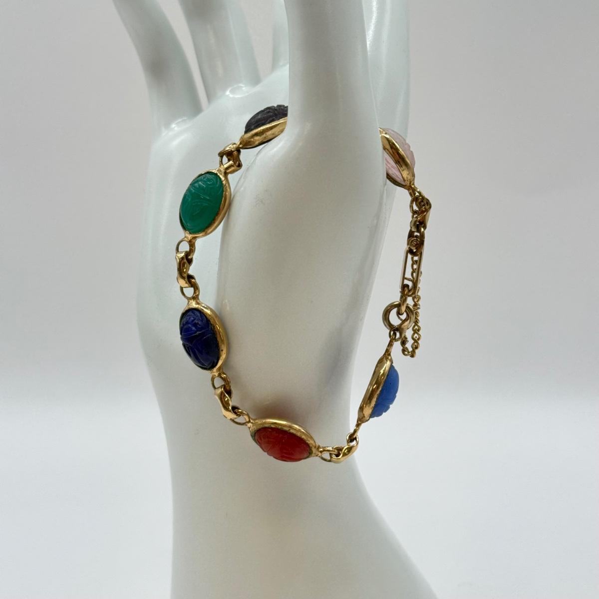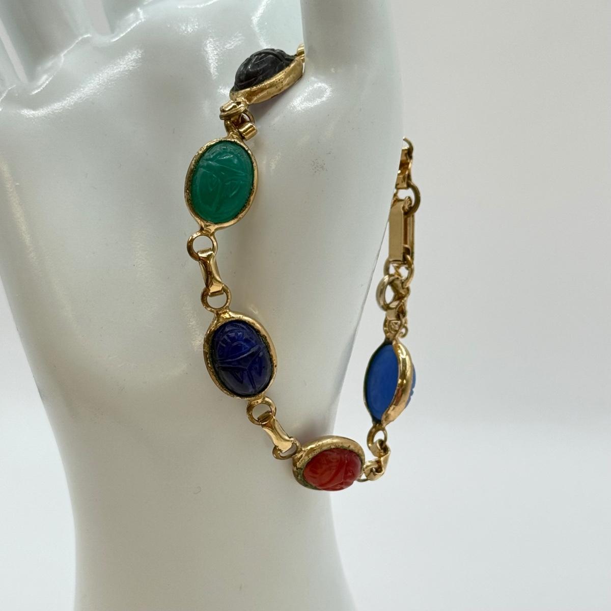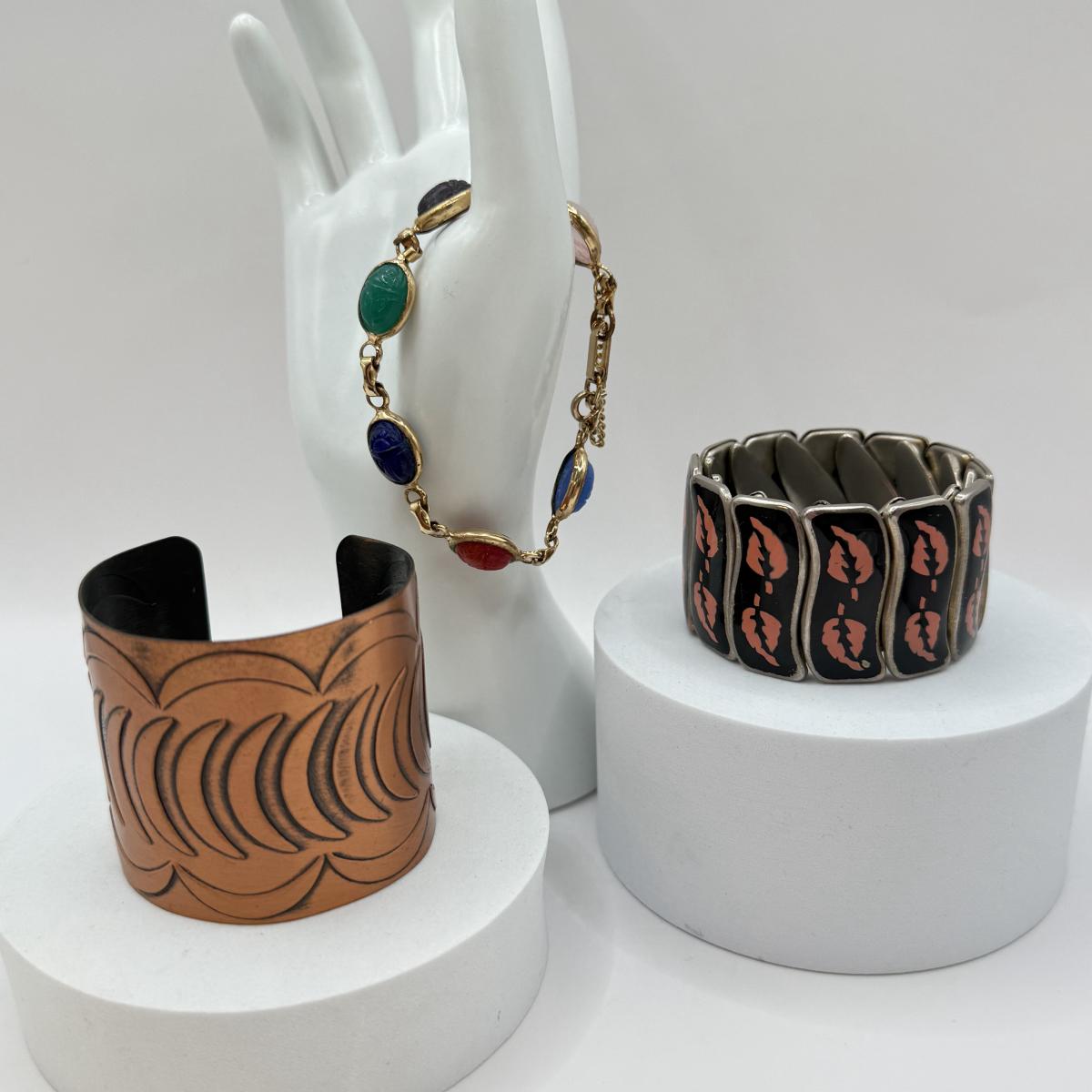 LOT 567J: Vintage Enamel Accordion Expandable Bracelet, Vintage Copper Cuff & 6.5” Goldtone Gemstone Scarab Bracelet w/ Safety Chain