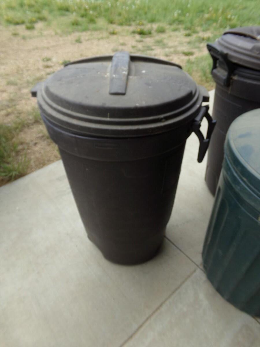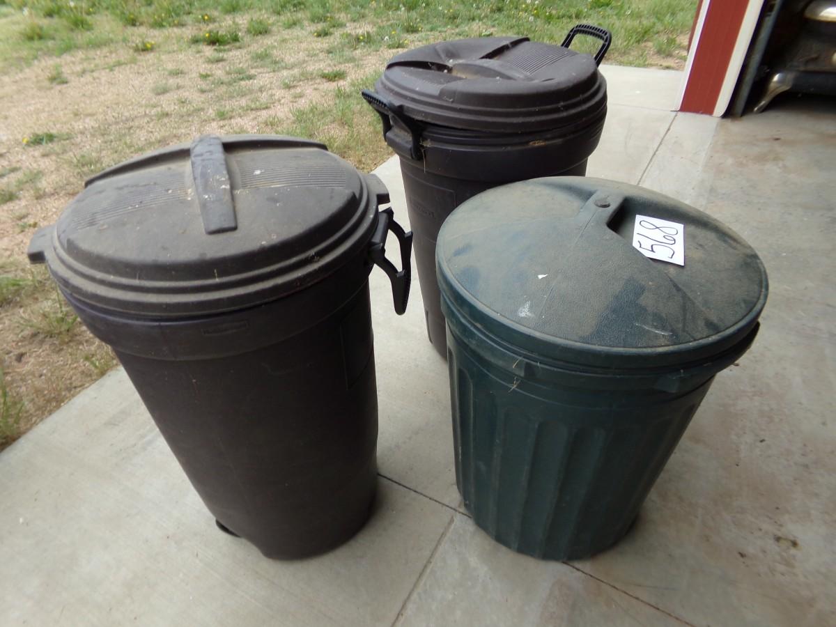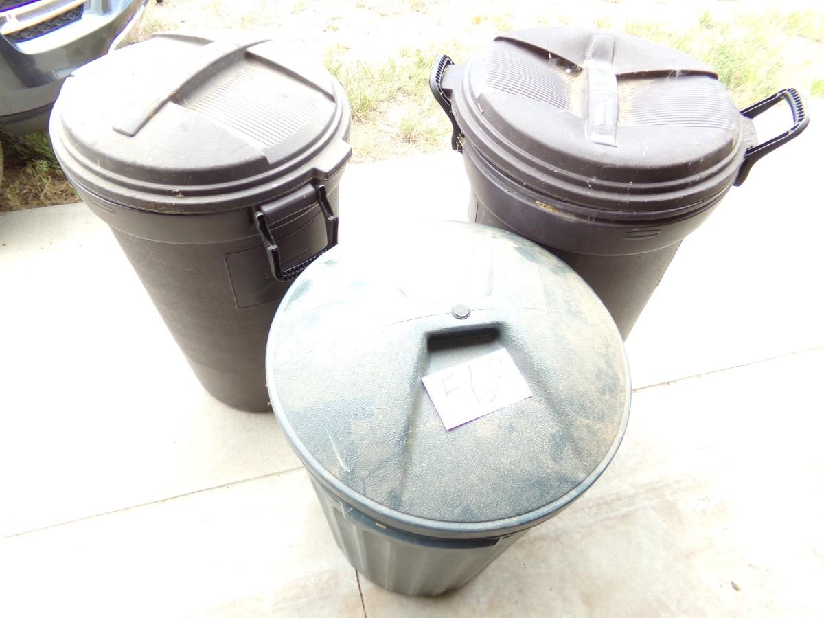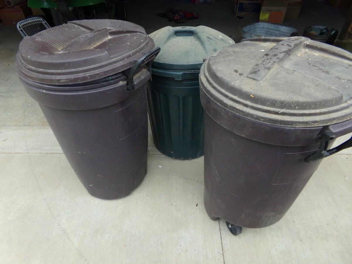 3 LARGE OUTDOOR TRASH CANS. PLASTIC WITH LIDS