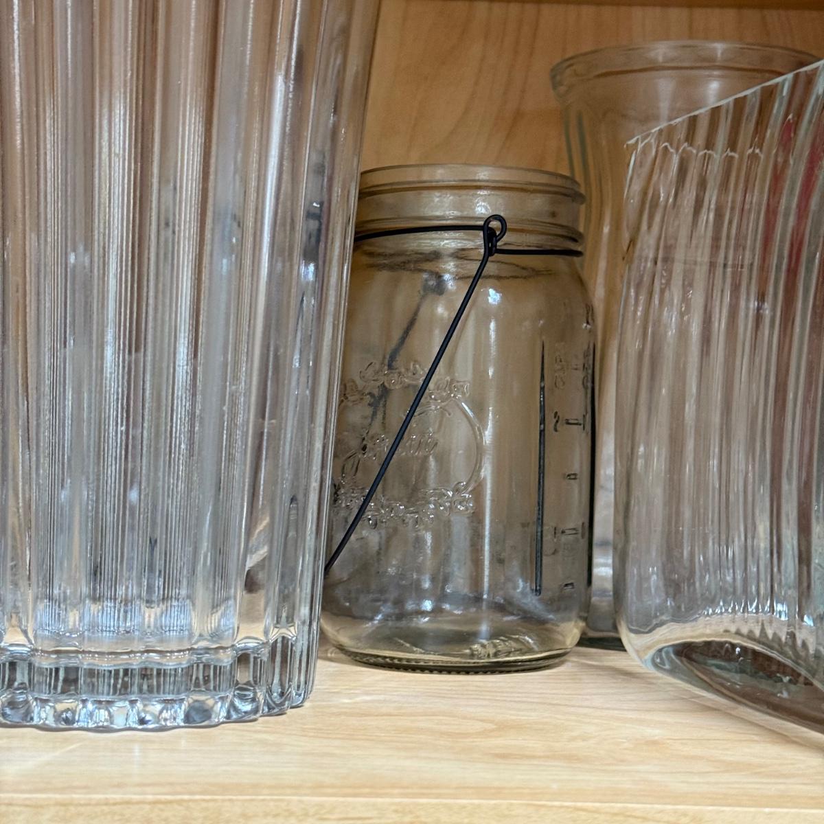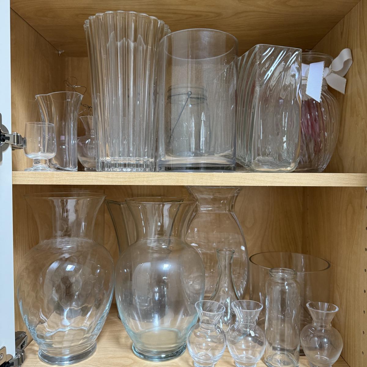 LOT 568K: Cabinet of Clear Glass Vases & More