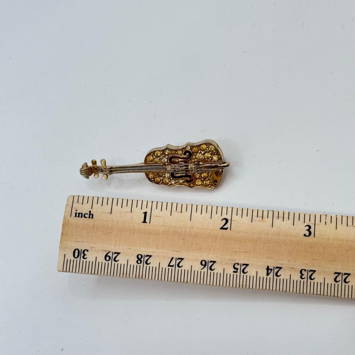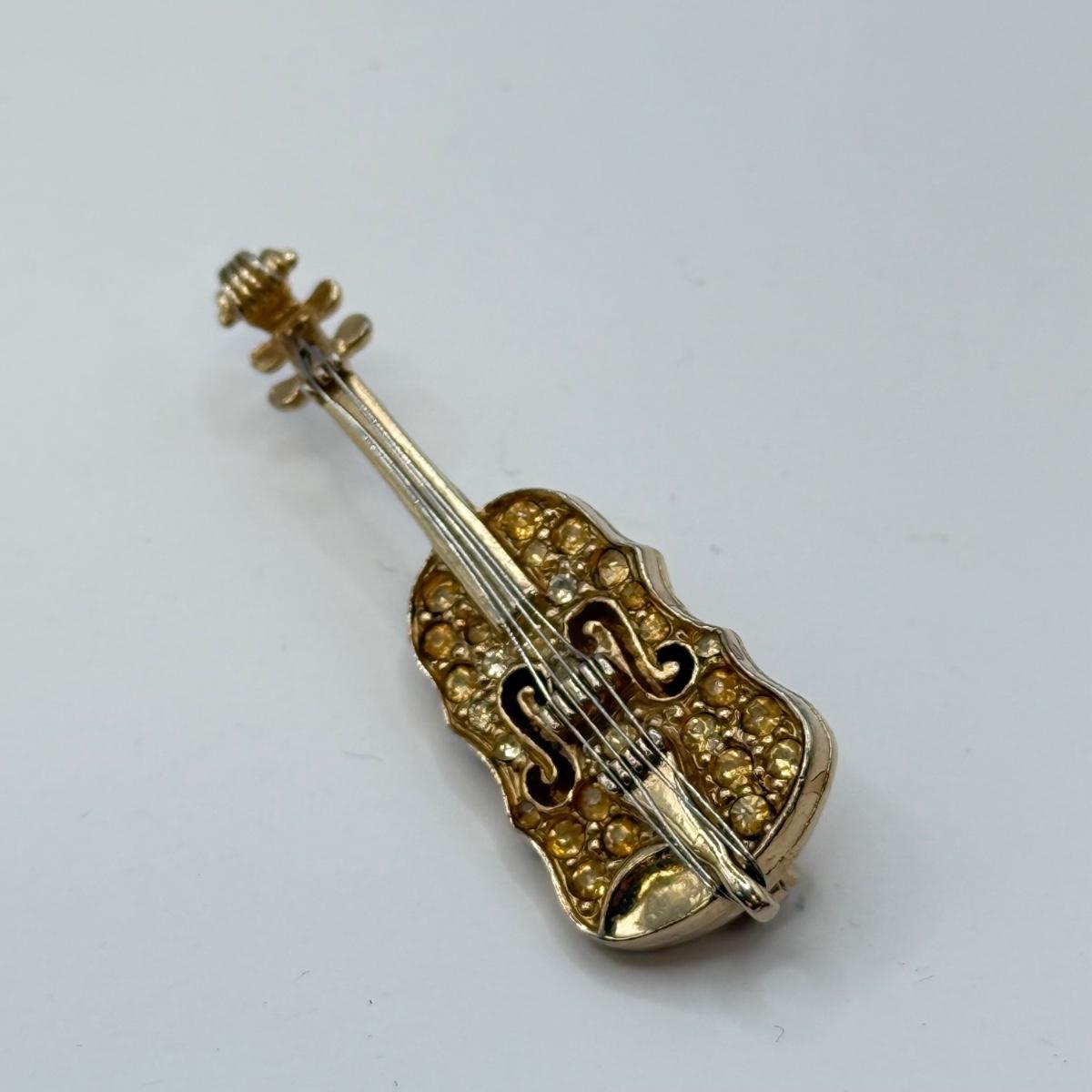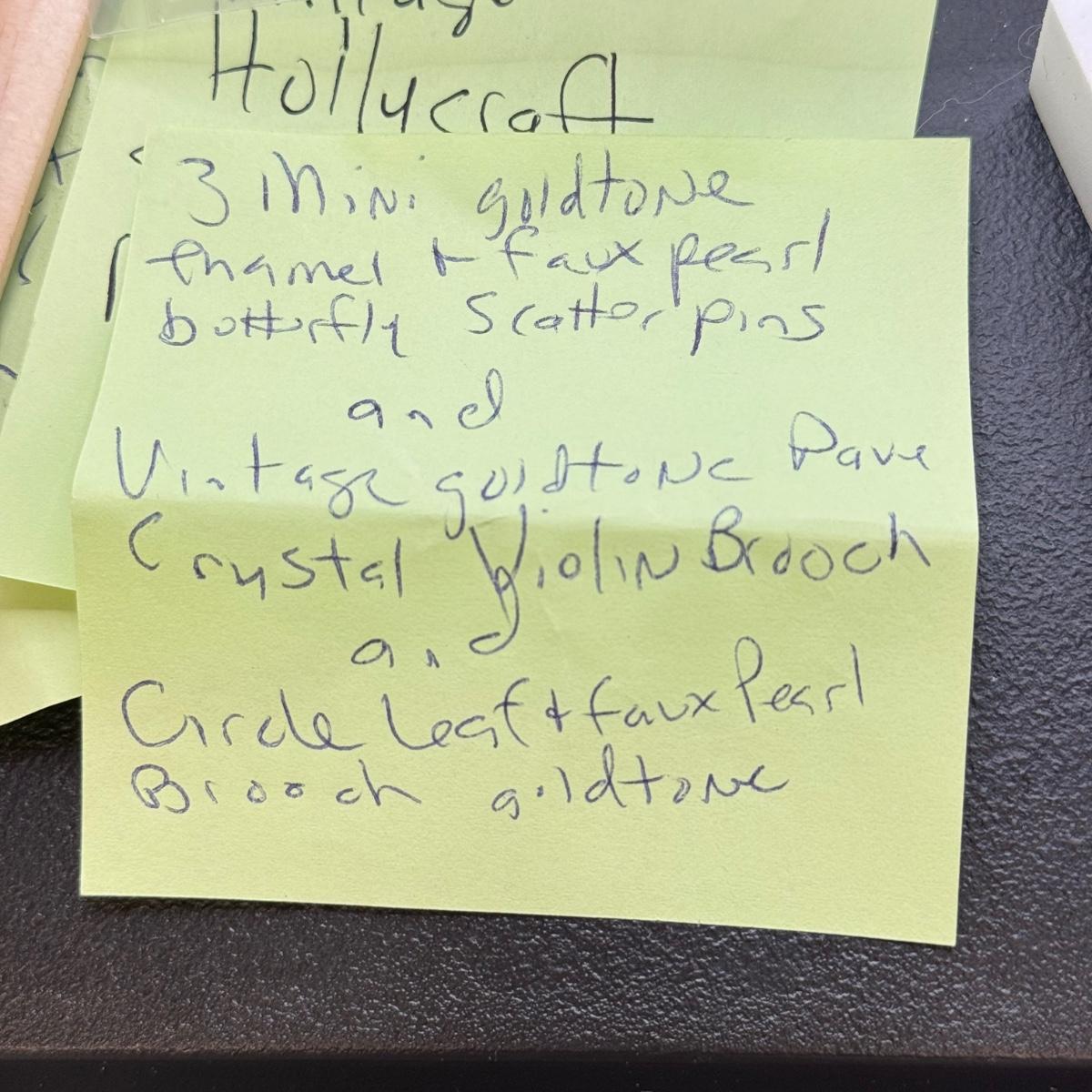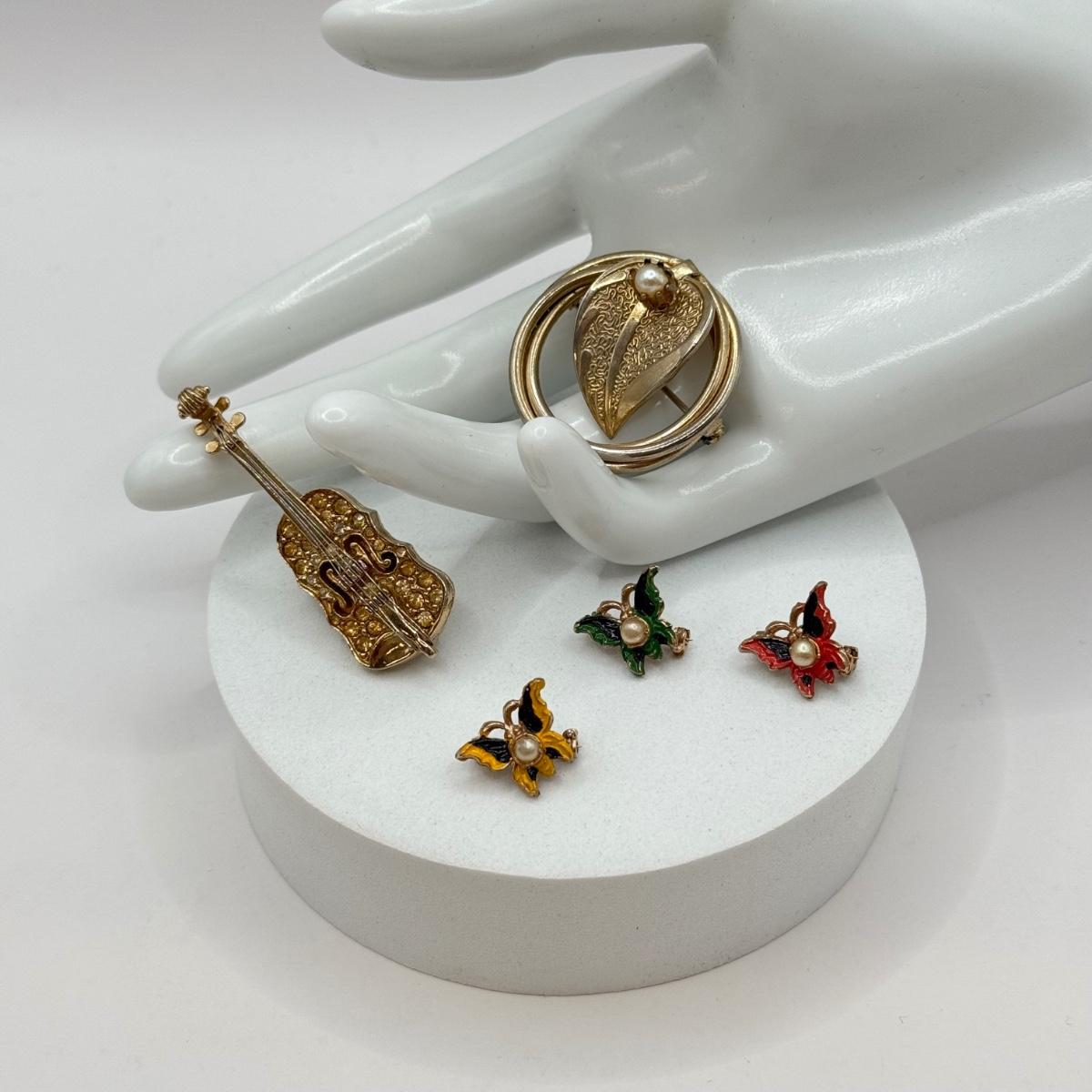 LOT 569J: 3 Mini Goldtone Enamel & Faux Pearl Butterfly Scatter Pins, Vintage Goldtone Pave Crystal Violin Brooch & Circle Leaf Goldtone Faux Pearl Brooch
