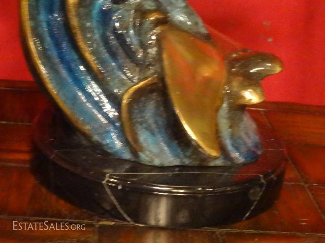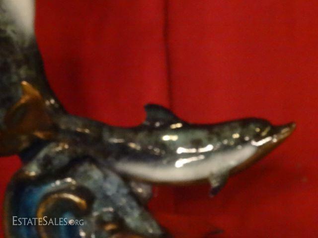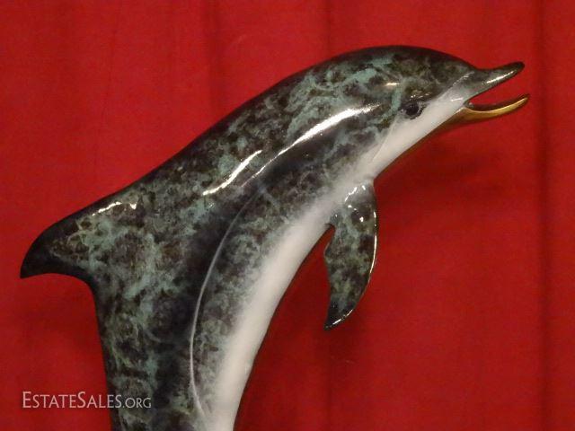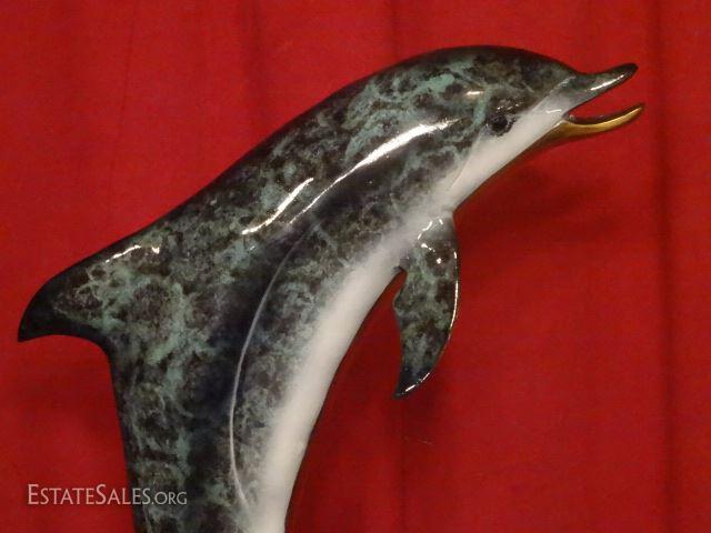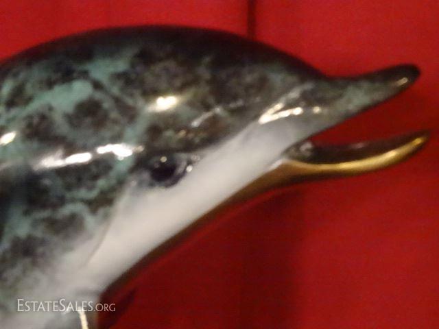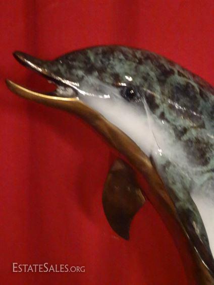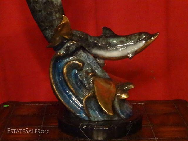 LOT 56B: LARGE PATINATED BRONZE SCULPTURE, 2 DOLPHINS ON MARBLE BASE, EXCELLENT CONDITION, 31"H X 19"W, SKU146.17 H50