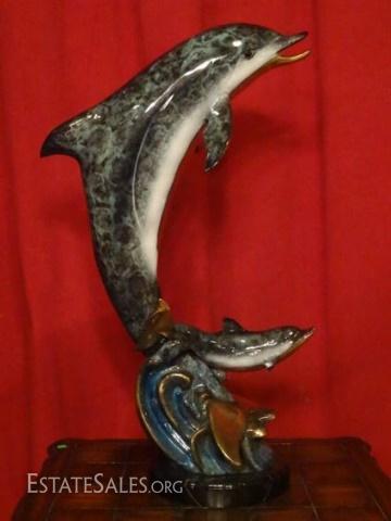 LOT 56B: LARGE PATINATED BRONZE SCULPTURE, 2 DOLPHINS ON MARBLE BASE, EXCELLENT CONDITION, 31"H X 19"W, SKU146.17 H50