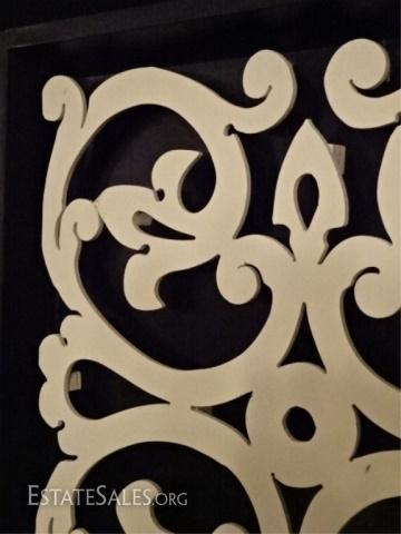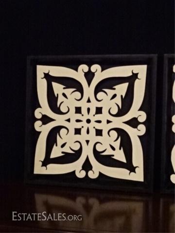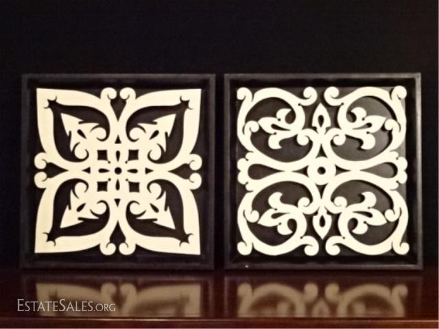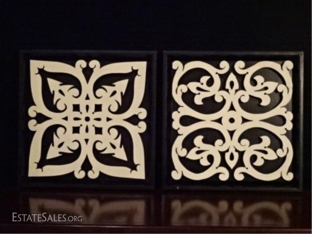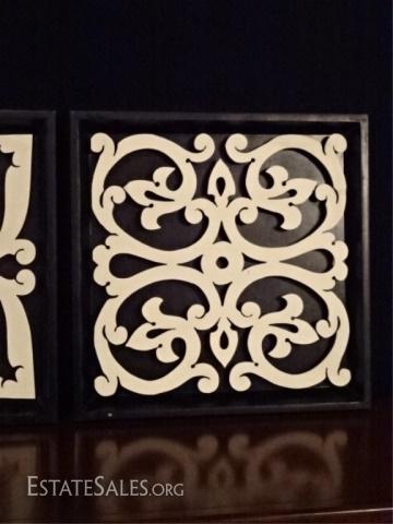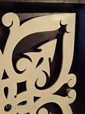 LOT 56C: 2 FRAMED STENCIL CUT PLAQUES, WHITE ON BLACK, VERY GOOD CONDITION, FRAMED SIZE 23" X 23", SKU387.56