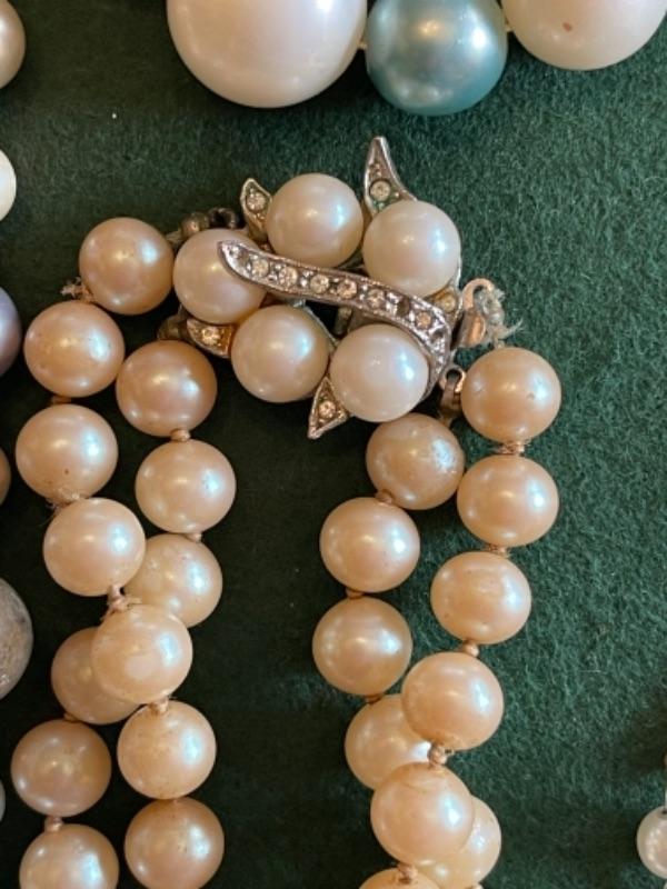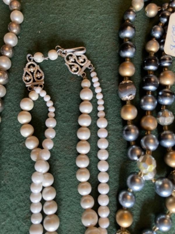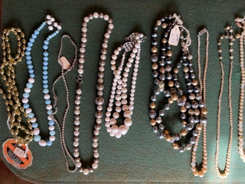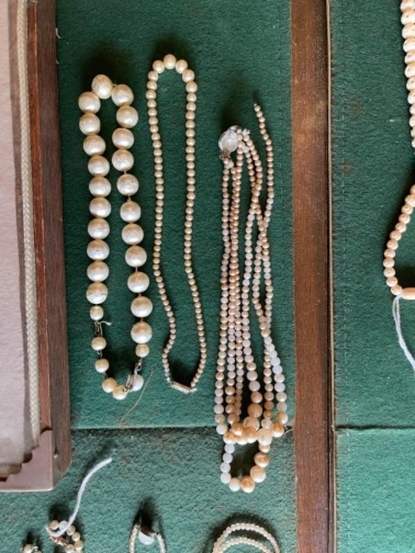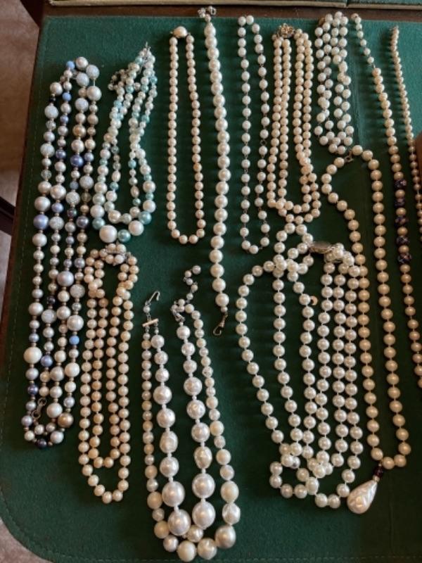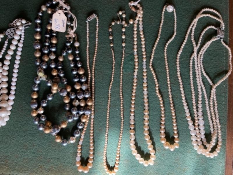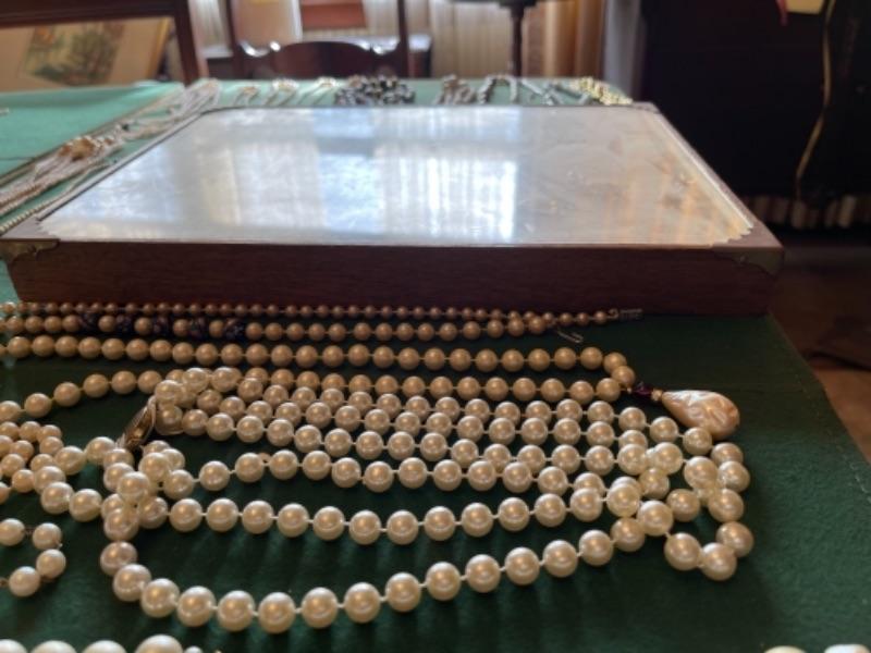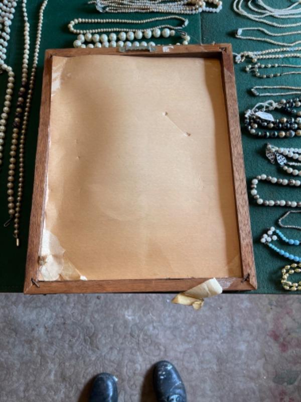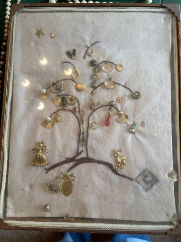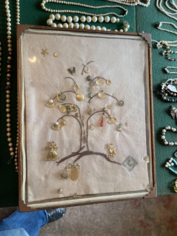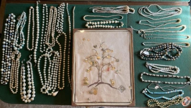 Lot 56DR. Costume jewelry (pearls) and framed tree of charms--$50