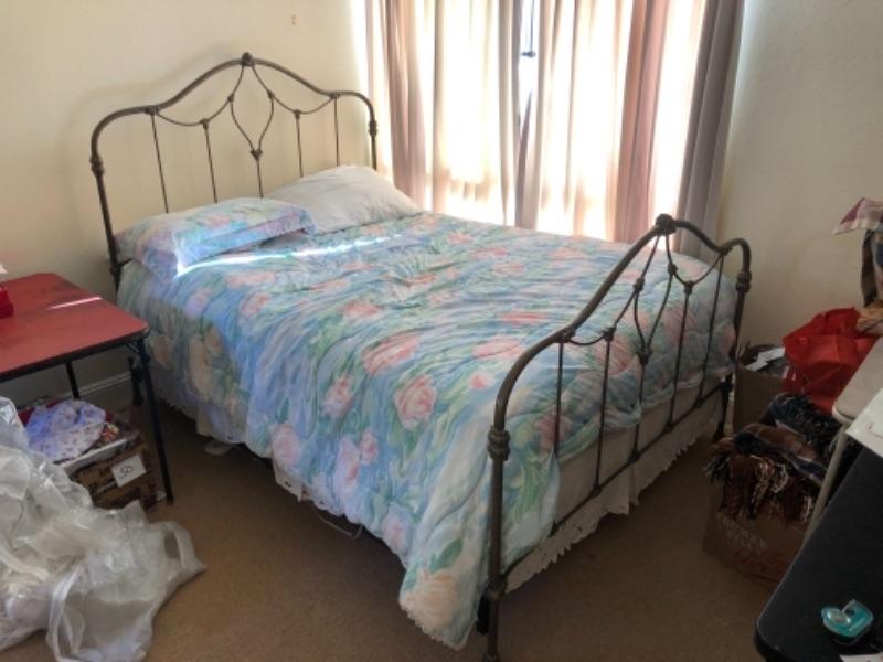 Lot 56U. Queen-size wrought iron bedframe with queen-size mattress (new), plus box frame  (new); bedding includes electric blanket, duvet, pillows, mattress cover--$125