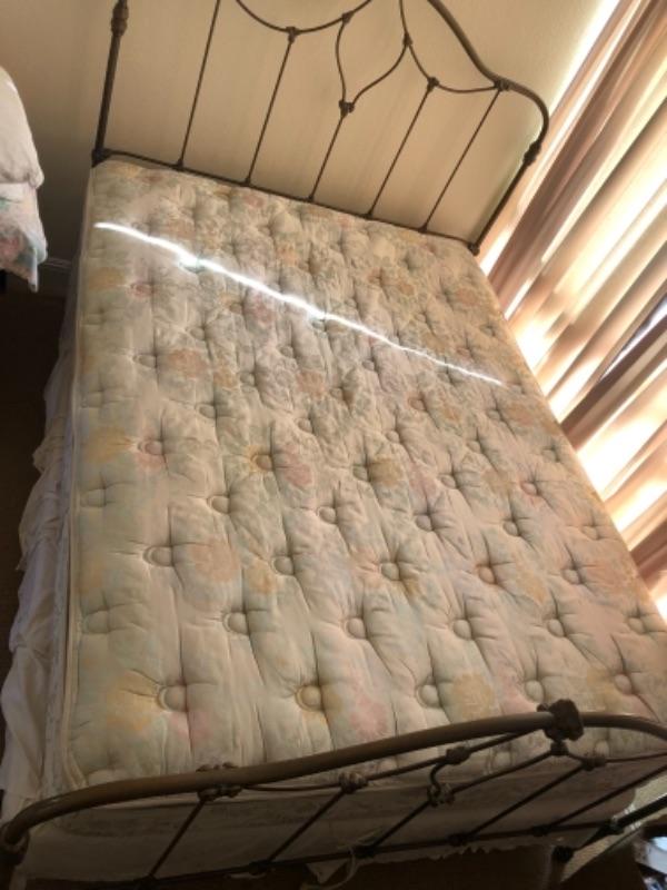 Lot 56U. Queen-size wrought iron bedframe with queen-size mattress (new), plus box frame (new); bedding includes electric blanket, duvet, pillows, mattress cover--$125